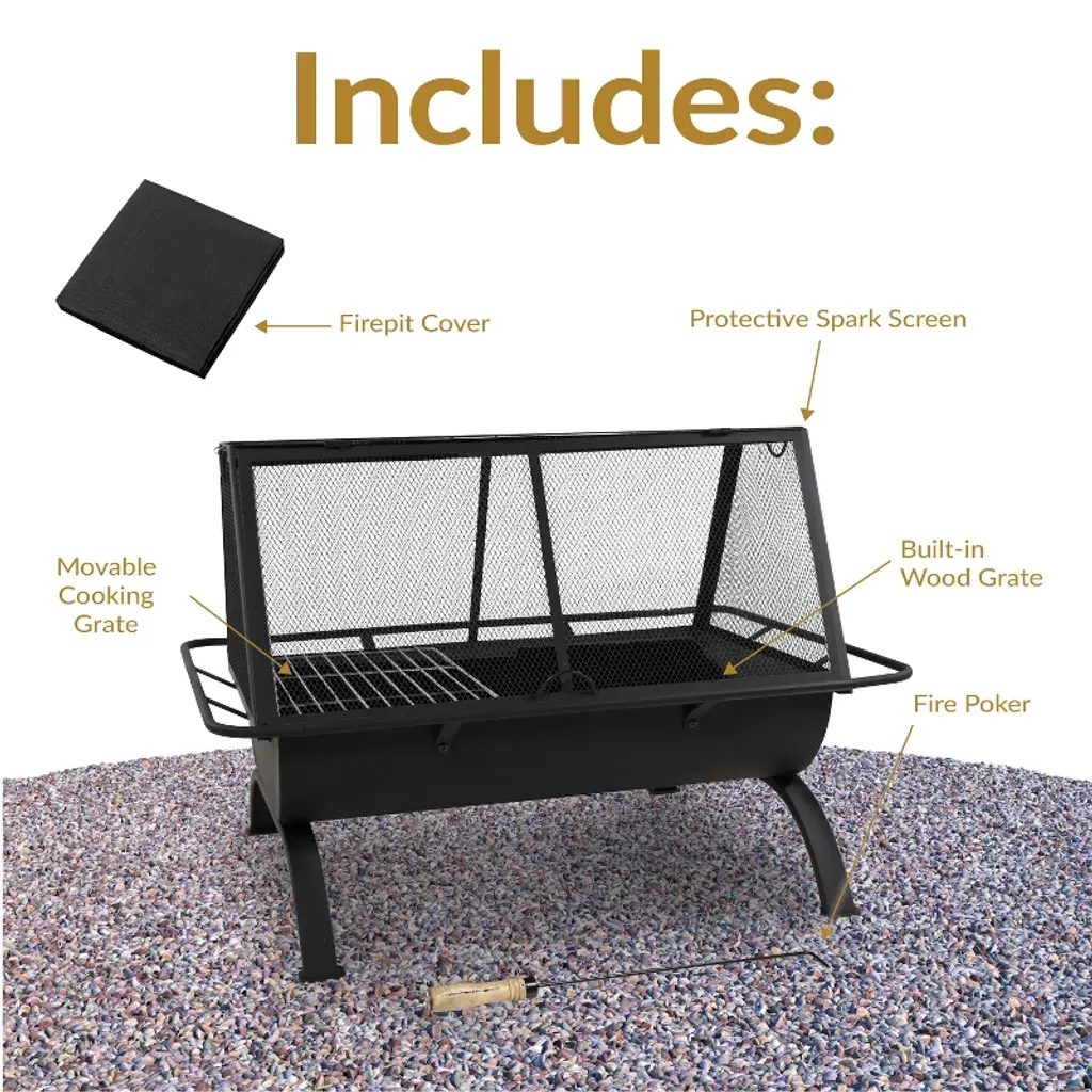 Sunnydaze Outdoor Camping Or Backyard Rectangular Northland Fire Pit With Cooking Grill Grate, Spark Screen, Log Poker, And Fire Pit Cover - 36"