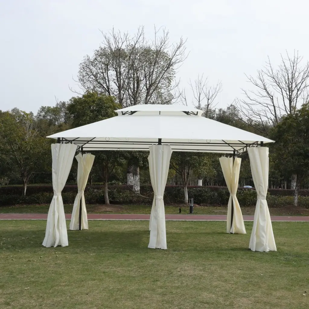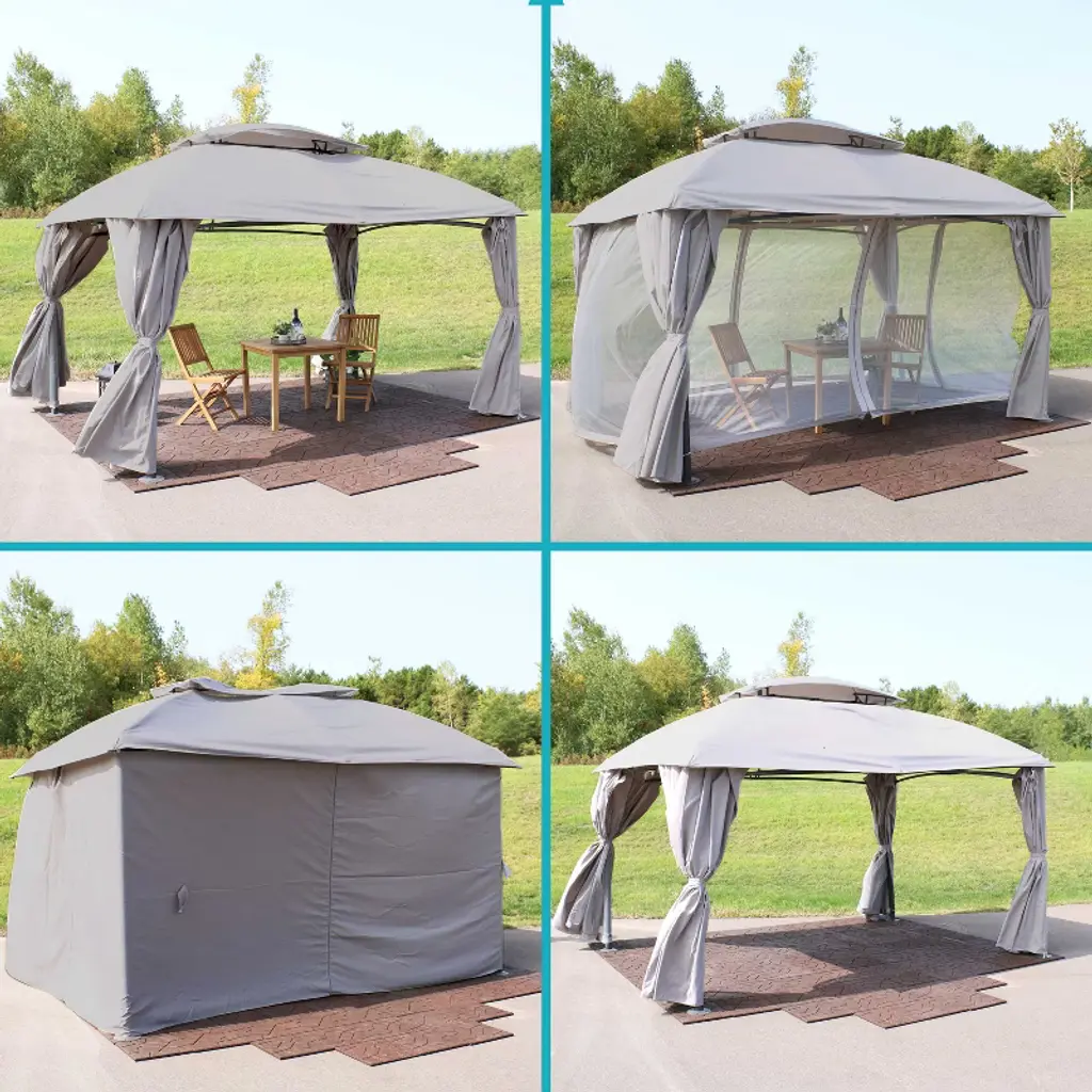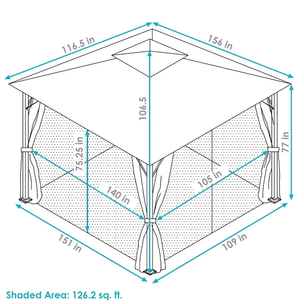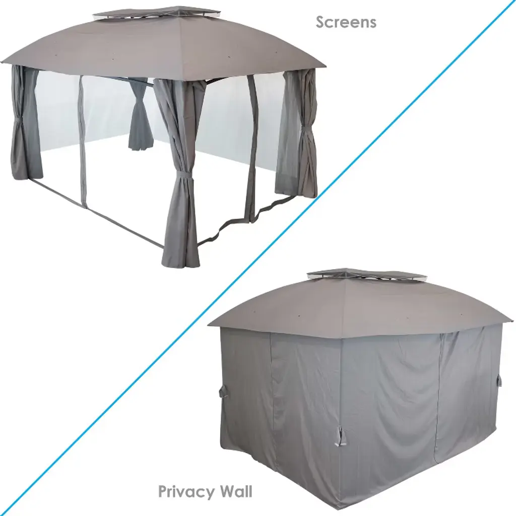Create a wonderful place to gather outdoors with friends and family with this 10 ft x 13 ft soft-top patio gazebo with screens and privacy walls. This structure is especially useful to emphasize style and elegance for any large gatherings, events, and reunions. This spacious patio canopy gazebo provides plenty of room for everyone and is great for outdoor parties, picnics, camping, and BBQ gatherings. This patio gazebo features an elegant canopy double roof made from 100 GSM polyester to resist the elements and provide shelter from wind, sun and rain. It also features sturdy and durable square metal posts made from 60 mm thick steel. Want some cover from the sun or a little extra deck privacy? Simply close the sidewalls. Plus, this backyard gazebo also has convenient screens. The mesh fabric allows a comfortable airflow throughout the gazebo. The sturdy construction and elegant design are sure to impress all guests while keeping them safe from the elements.• SPACIOUS SHELTER FOR GATHERINGS: This gazebo measures 151" W x 109" D x 106.5" H and weighs 106 lbs. The frame measures 140" W x 105" D with a 75.25" head clearance (103.5" frame peak). The roof measures 156" W x 116.5" D. The gazebo provides up to 126.2 square feet of shade and is great for outdoor parties, camping, and picnics.• CONSTRUCTED FROM QUALITY MATERIALS: This outdoor gazebo is made with a 60mm steel frame and a 100 GSM polyester canopy and four 125" W x 77" H sidewalls. The backyard gazebo tent provides covering and shelter from the wind, rain and sun. Pull the sidewall panels closed for additional shade and privacy. The double zippers allow the sidewalls and screens to be opened from inside or outside the screened gazebo.• READY FOR USE: Everything required to put this shade gazebo together is included. It comes with 4 legs, 4 feet, 8 beams, 13 trusses, 4 sidewalls, 4 screens, 2 peak hubs, 1 main canopy, 1 upper canopy, 4 long net poles, 4 short net poles and 1 hardware kit. Two people are required for assembly.• ENJOY A REFRESHING BREEZE: The convenient mesh screens provide some privacy while still allowing airflow throughout the metal gazebo with curtains. The mesh screens also help keep bugs out.• WORRY-FREE PURCHASING: Sunnydaze Decor backs its products with a 1-year manufacturer's warranty.