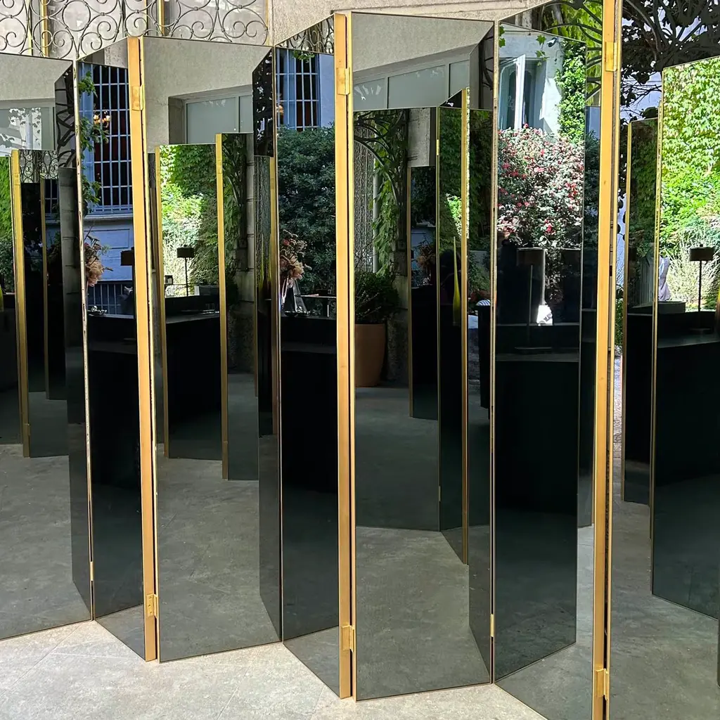Scenic and decorative screen, enriching spaces with an elegant and designer atmosphere. Crafted with wooden frames, the panel is covered in precious dark green iridescent fabric by HIGH Everyday Couture, adorned with tone-on-tone details. On the back, the panels become fascinating smoked mirrors to enhance the aesthetics of the object and expand the spaces to infinity. Panels are elegantly framed in brushed brass with a gold effect.