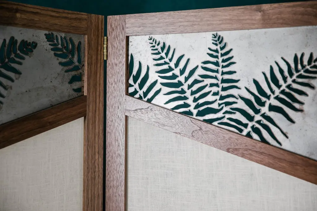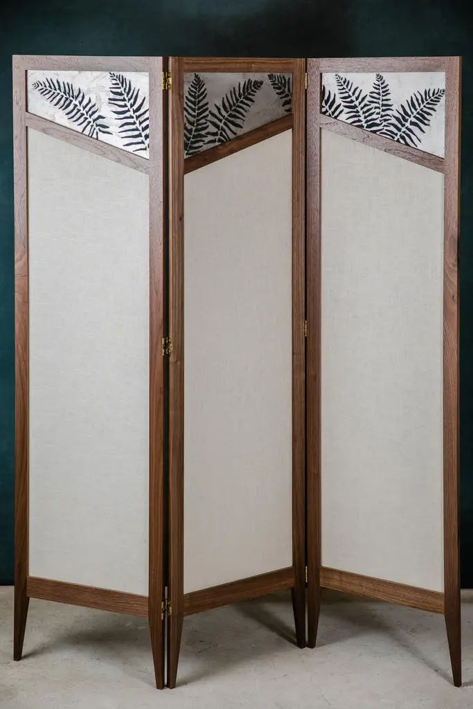 Tall Fern Folding Screen/room Divider In Walnut With Metal And Fabric Screens