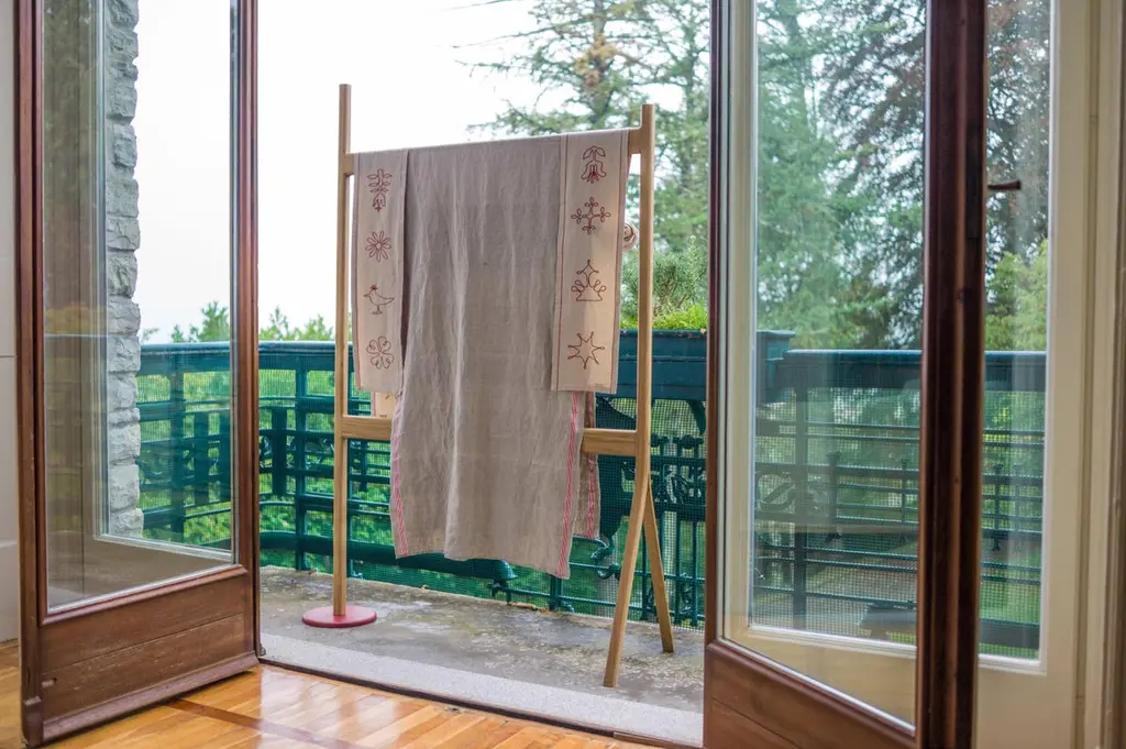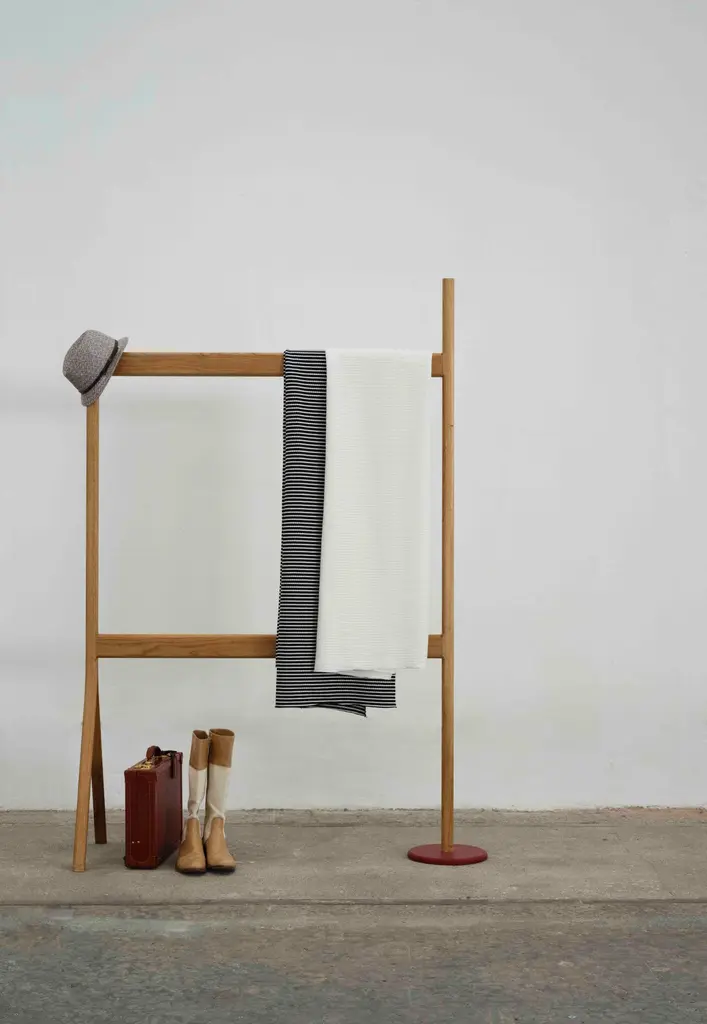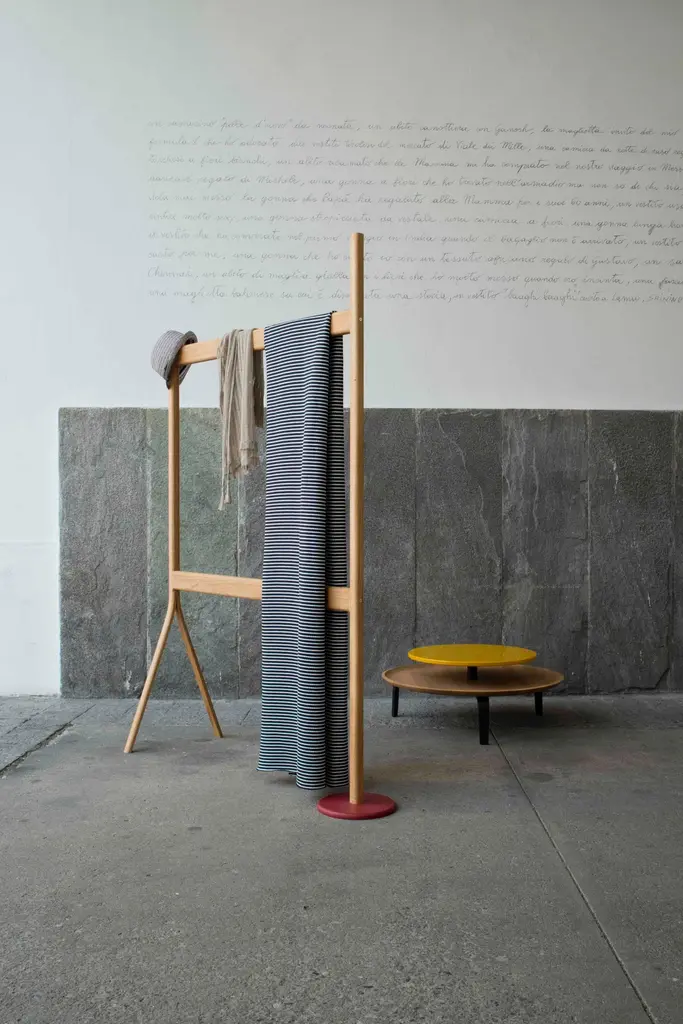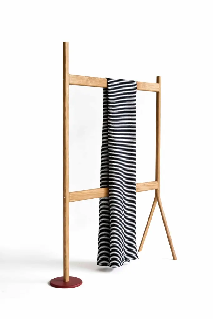 Natural oakwood structure with rounded edges and sophisticated woodworking details. Base in red lacquered wood.A simple and light solid wood structure acts as a backbone to an object with multiple facets. Telo offers you the imaginary frame of a window, you decide the scenery to look at. The most intuitive is a screen whose connotations vary depending on the fabric chosen to hang on: from technical raffia inspired by te 1950s to the optical 1970s, from casual denim with a cartoon imagery to folk aesthetics as a colorful matryoshka, from fur for a visual and touch experience to antique precious fabrics and kimonos, even vintage scarfs and dresses as a sweet boudoir.