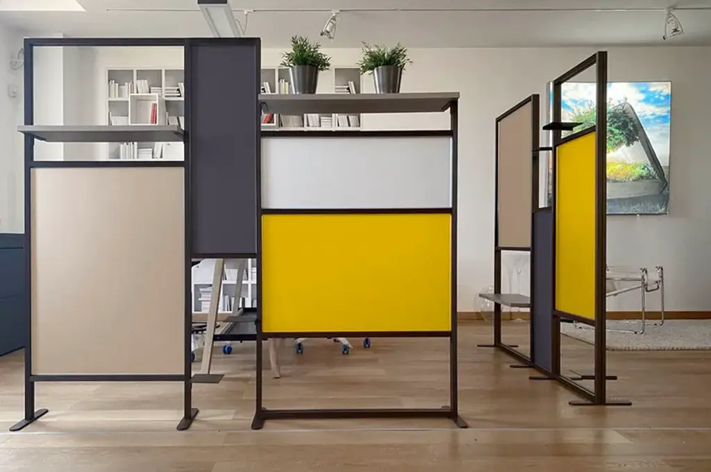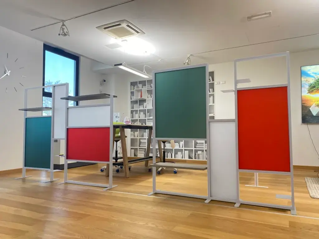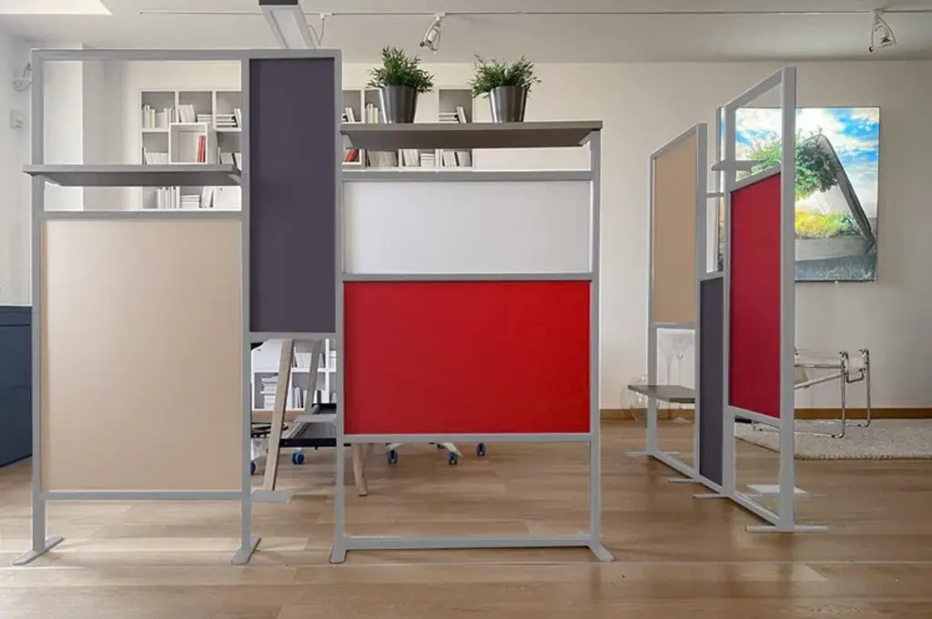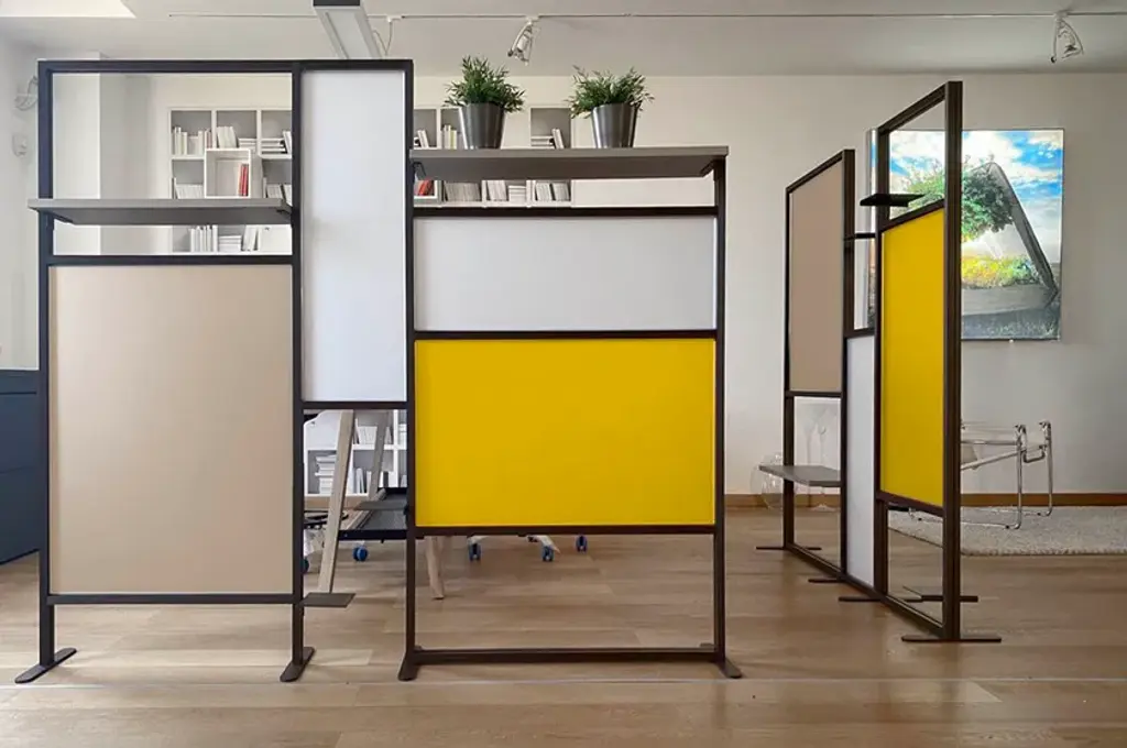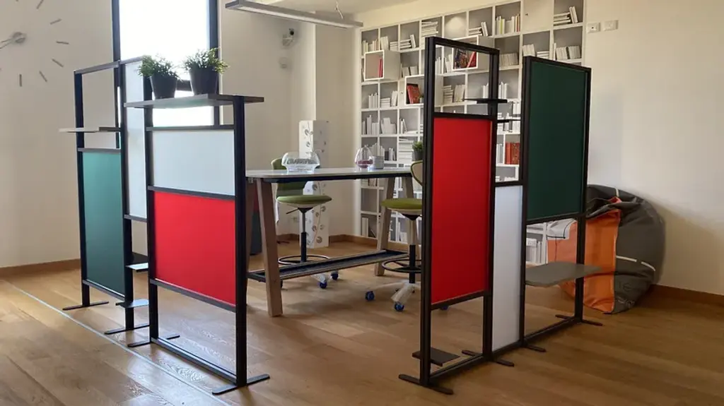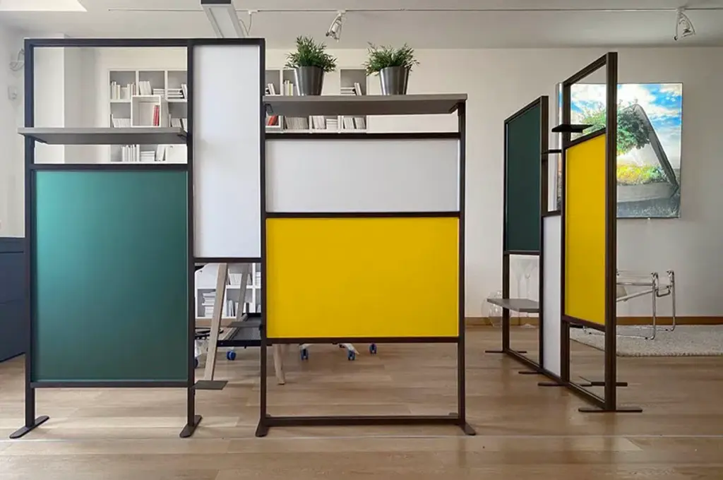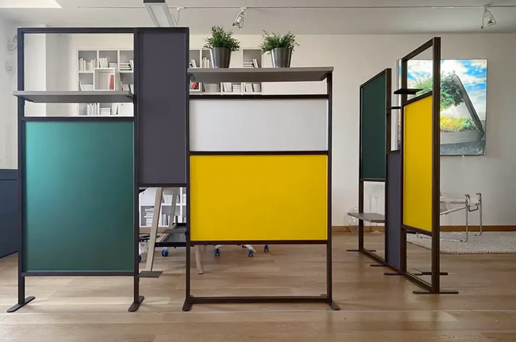Tetrix quadro is the a self-supporting coloured partition that divides and furnishes rooms such as offices, waiting rooms, doctors' offices, living rooms and kitchens. It is composed of coloured panels that allow light to filter through and shelves to furnish with plants, objects, books. Its large dimensions provide excellent coverage with an essential design style. Complete with three 20x16 cm metal shelves and a 79 cm linen finish melamine shelf. Corten-coloured frame and panels in brick red, forest green and white.InUno is a collection of divider panels, exhibition display panels, notice racks, posters, brochure racks, totems and signage, and lots of solutions. It is a line that is fully configurable in structure, size, colors, and prints to meet different style, space, and brand requirements.