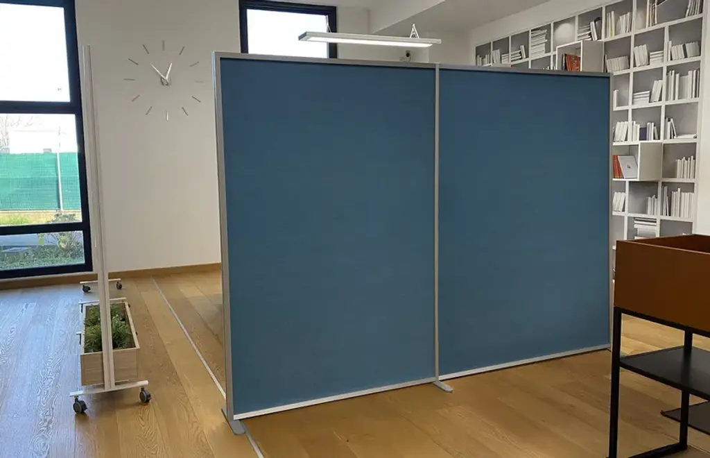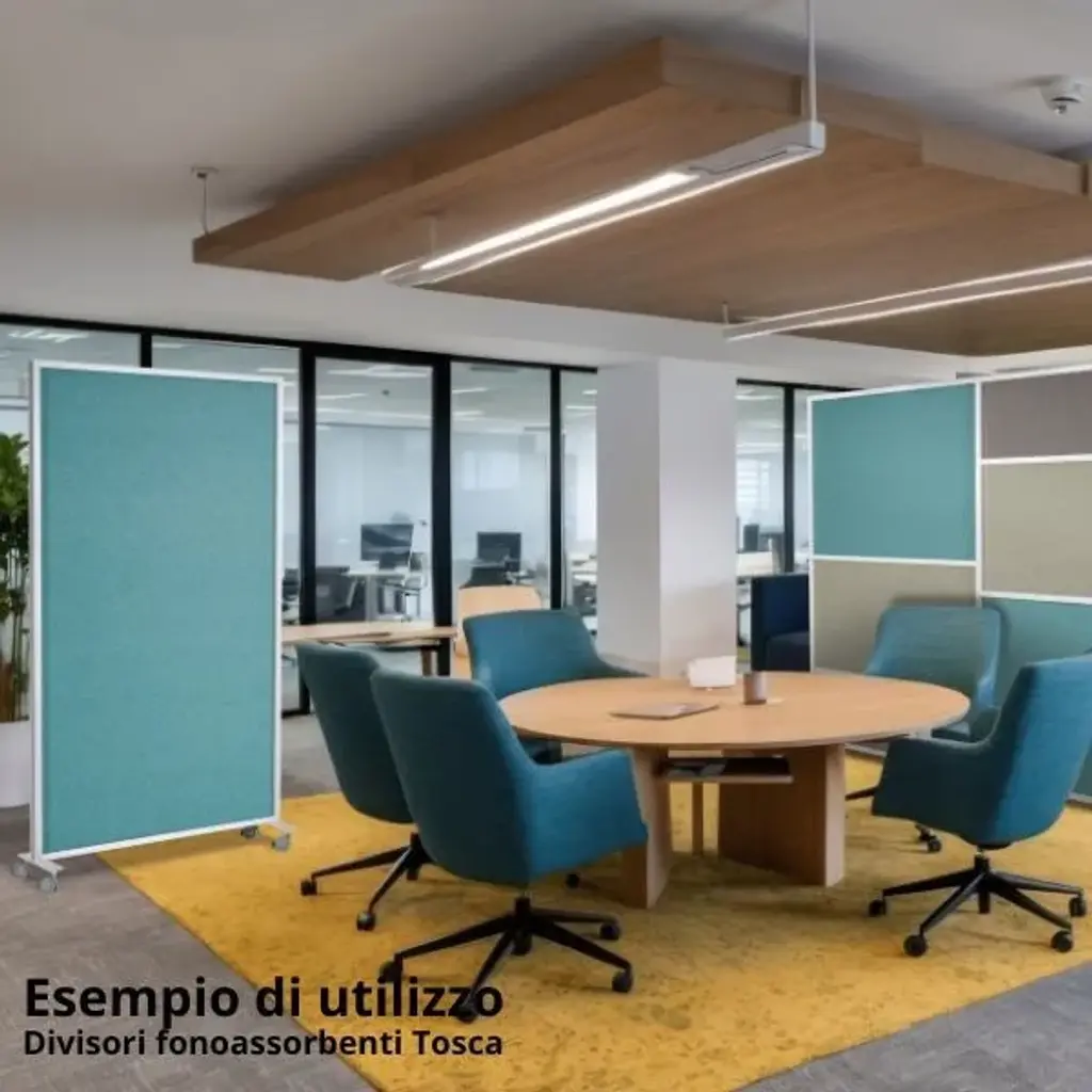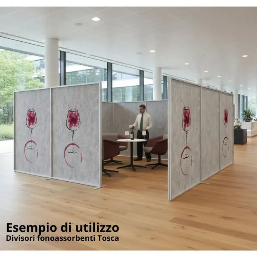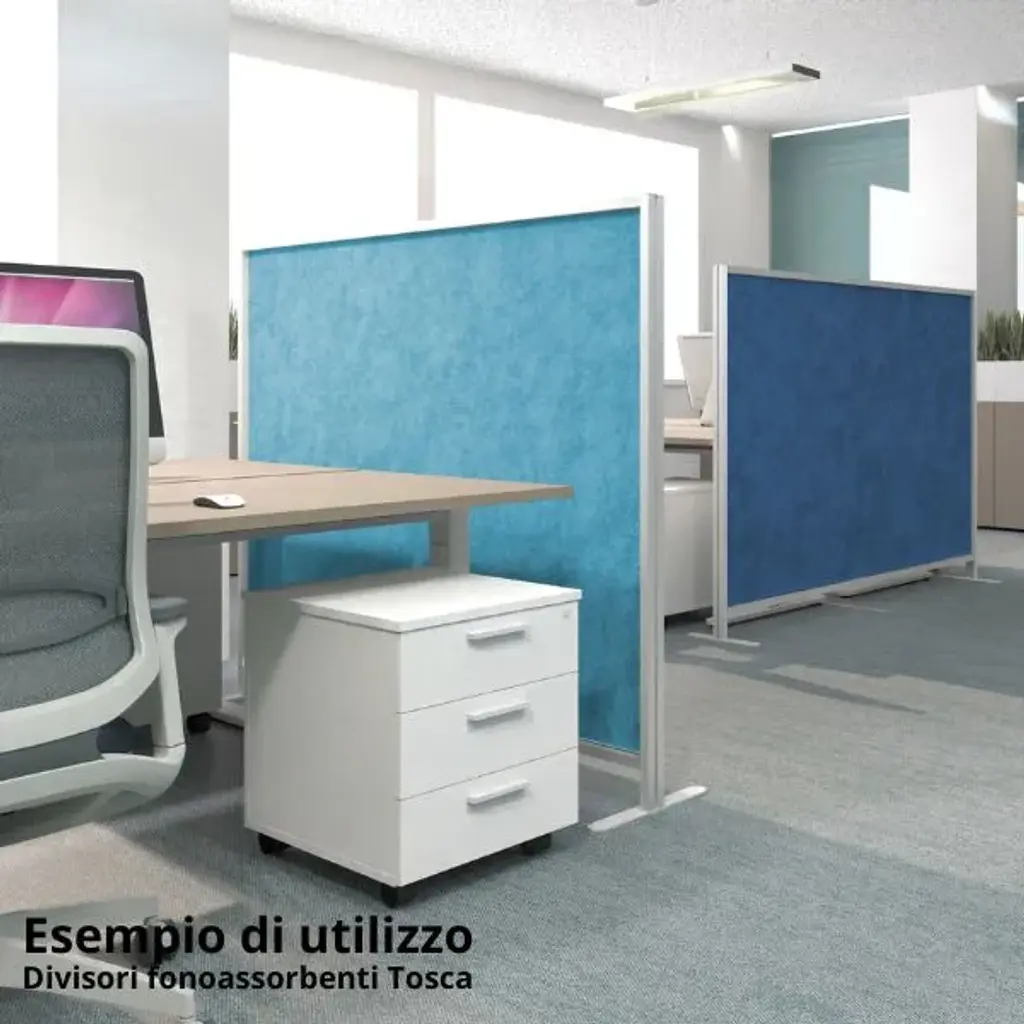 Tosca is the sound-absorbing divider designed to separate spaces and improve the acoustics of a room thanks to its high-quality sound-absorbing panels. With a height of 181 cm, this partition wall is made of high-performance technical felt, recyclable and fire-retardant, providing excellent sound absorption and reducing reverberation in any environment. Designed for offices, meeting rooms, co-working spaces, schools, and open-plan areas, Tosca is a modern and functional divider that combines aesthetics, sustainability, and practicality.Aluminum frame, Silver finishAvailable in 5 ready-to-ship colors and over 64 variants on requestPET sound-absorbing panels, 9 mm thickMade from 60% recycled PET, fire-retardant and 100% recyclableFire reaction class: C-s2, d0, VOC freeSelf-supporting and modular: usable individually or in series for linear, corner, or booth-style partitionsStraight support feet (35 cm depth) or version with wheels for easy mobilityDimensions: W 124 × H 181 cmProduct compliant with CAM (Minimum Environmental Criteria)Tosca is a collection of self-supporting and desk-mounted sound-absorbing dividers designed to enhance the acoustic and visual comfort of contemporary workspaces.Made from high-efficiency sound-absorbing PET felt, it ensures effective absorption of sound waves and contributes to creating quieter, more comfortable, and more productive environments.The anodized or painted aluminum frame provides stability, durability, and elegance, while the fire-retardant and recyclable composition makes each element a safe and sustainable choice.The entire collection complies with the Minimum Environmental Criteria (CAM), confirming it as a responsible and certified solution, ideal for projects that combine technical performance with aesthetic value.Tosca’s high-performance technical felt offers excellent sound-absorption capacity, enabling efficient control of reverberation in open-space environments, meeting rooms, and shared offices.The system is modular and configurable in various compositions — linear, corner, or booth — to create tailor-made solutions based on the needs of the space.With the addition of accessories such as shelves, metal trays, or magnetic panels, Tosca evolves from a simple sound-absorbing wall into a multifunctional furnishing divider, capable of providing privacy, acoustic comfort, and aesthetic value in a single solution.