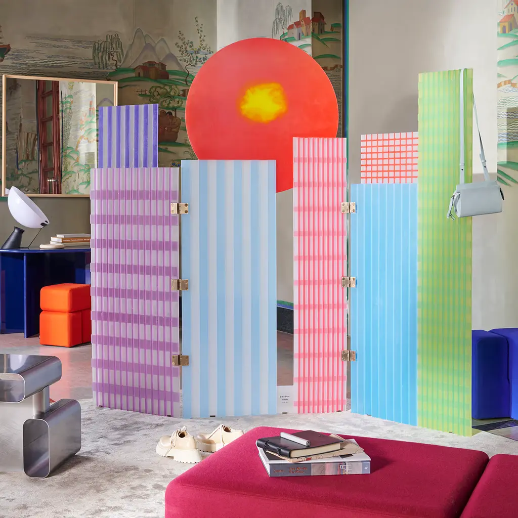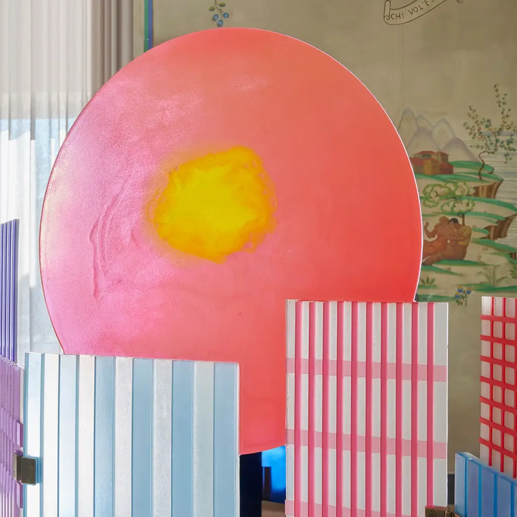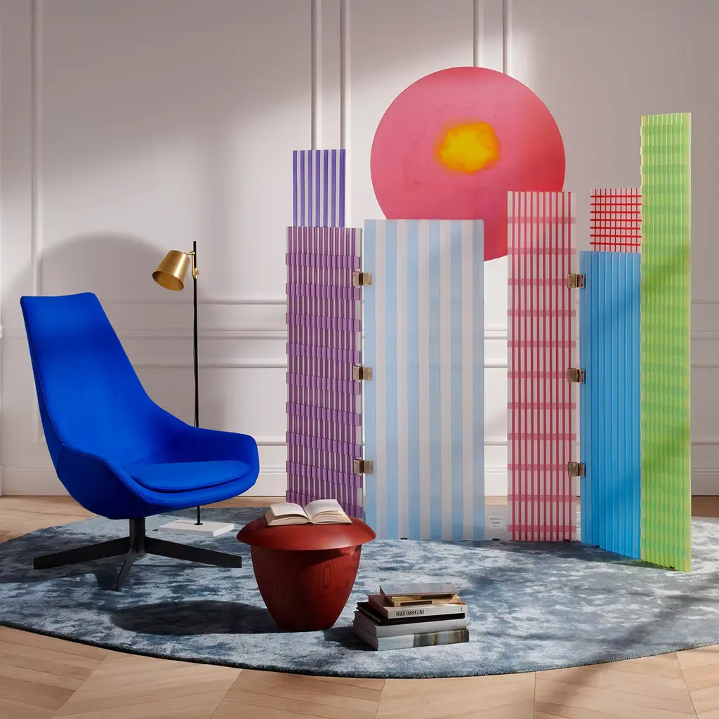 Light shimmers through the vibrant hues of Tramonto a New York, a triptych room divider inspired by the iconic sofa and conceived as a true work of art. Designed by Gaetano Pesce, it captures the essence of the New York skyline, recreating its bold silhouettes and the striking tones of building facades. By expertly blending pigments, Pesce achieves a dynamic interplay of colors and light, evoking the city's ever-changing atmosphere.