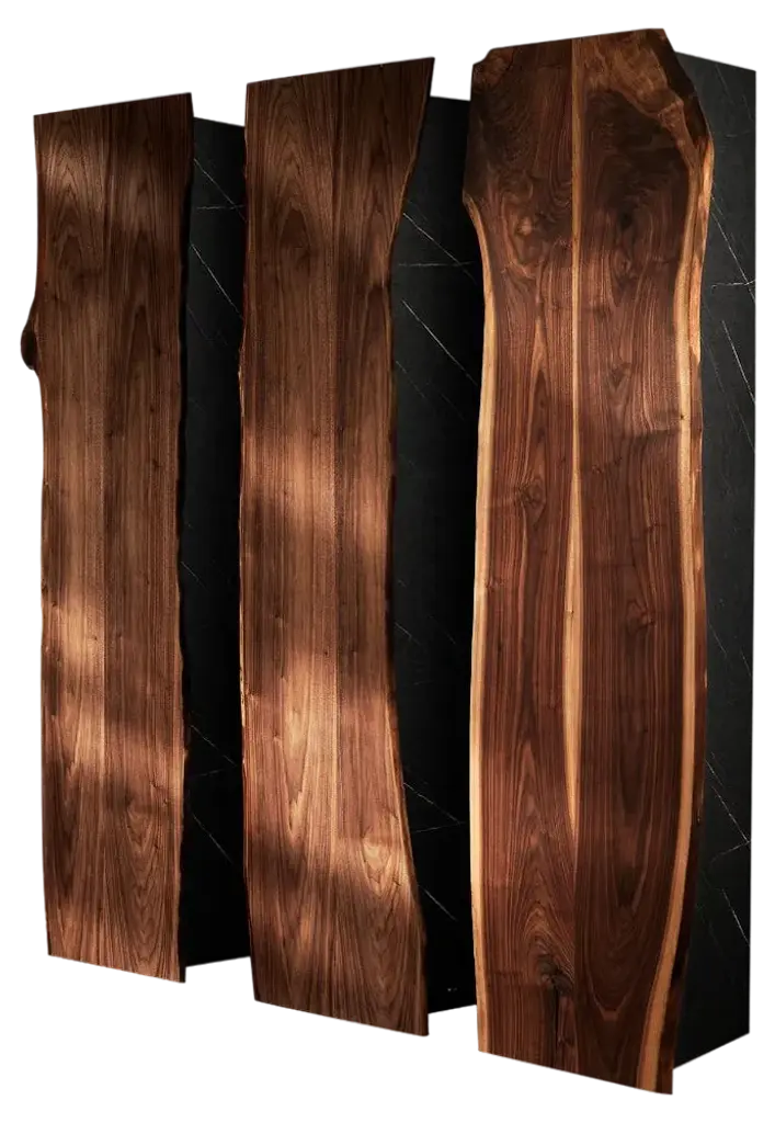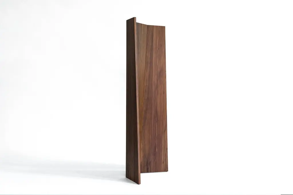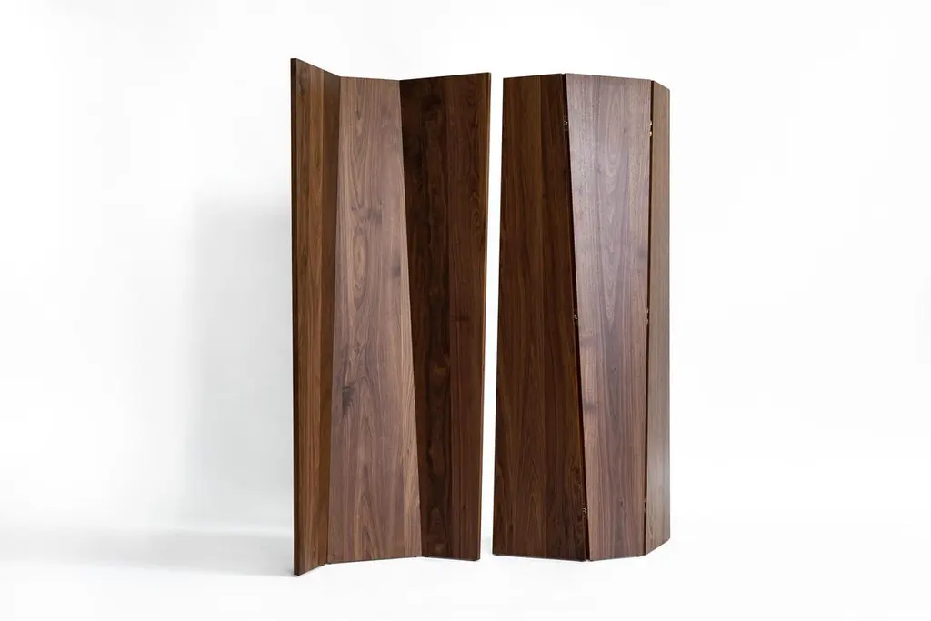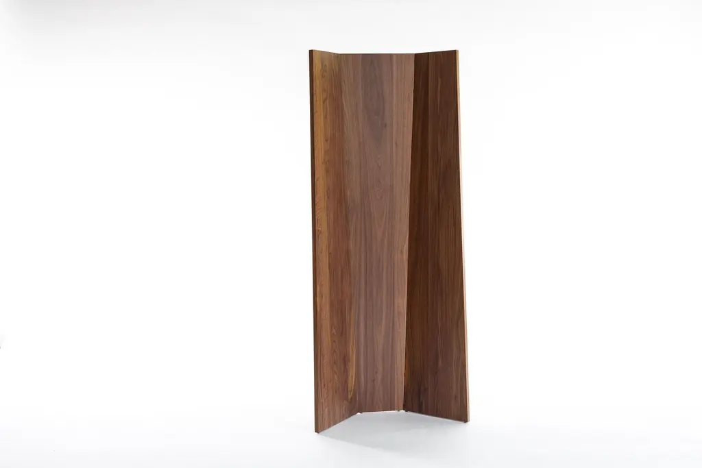 Sculptural, self-supporting screen for use as a stand-alone or combined to create a larger privacy wall. The tri-fold design can be oriented with the form tapering either up or down. Shown in solid walnut and bronze.Dimensions: 78” height x 42” width x 1” thick (one 3-panel screen).All of our solid hardwood is sustainably sourced from Pennsylvania. All metalwork is handcrafted in our Newburgh, NY workshop.