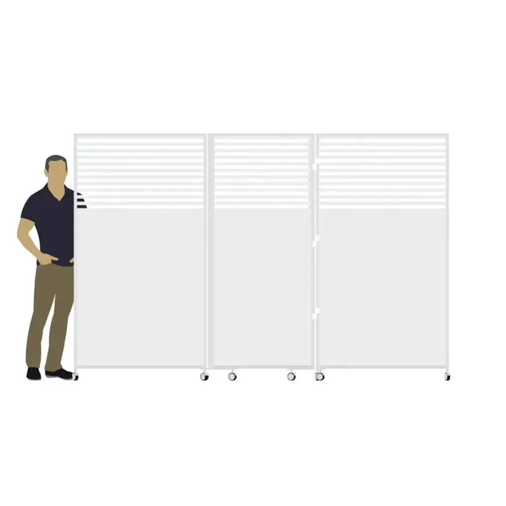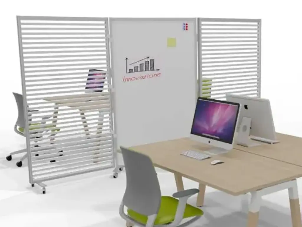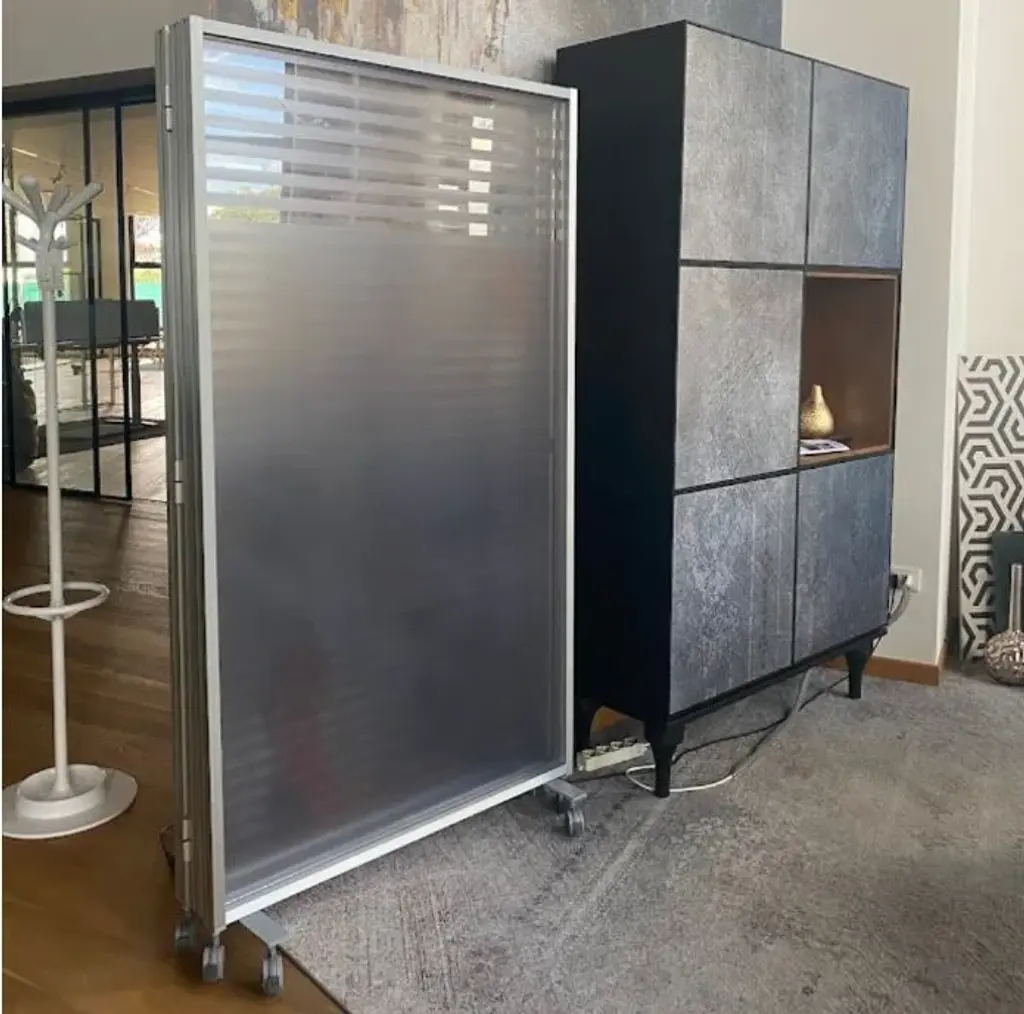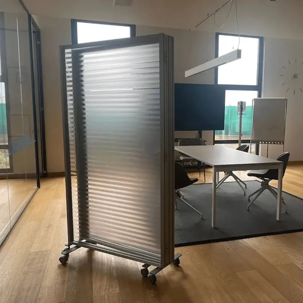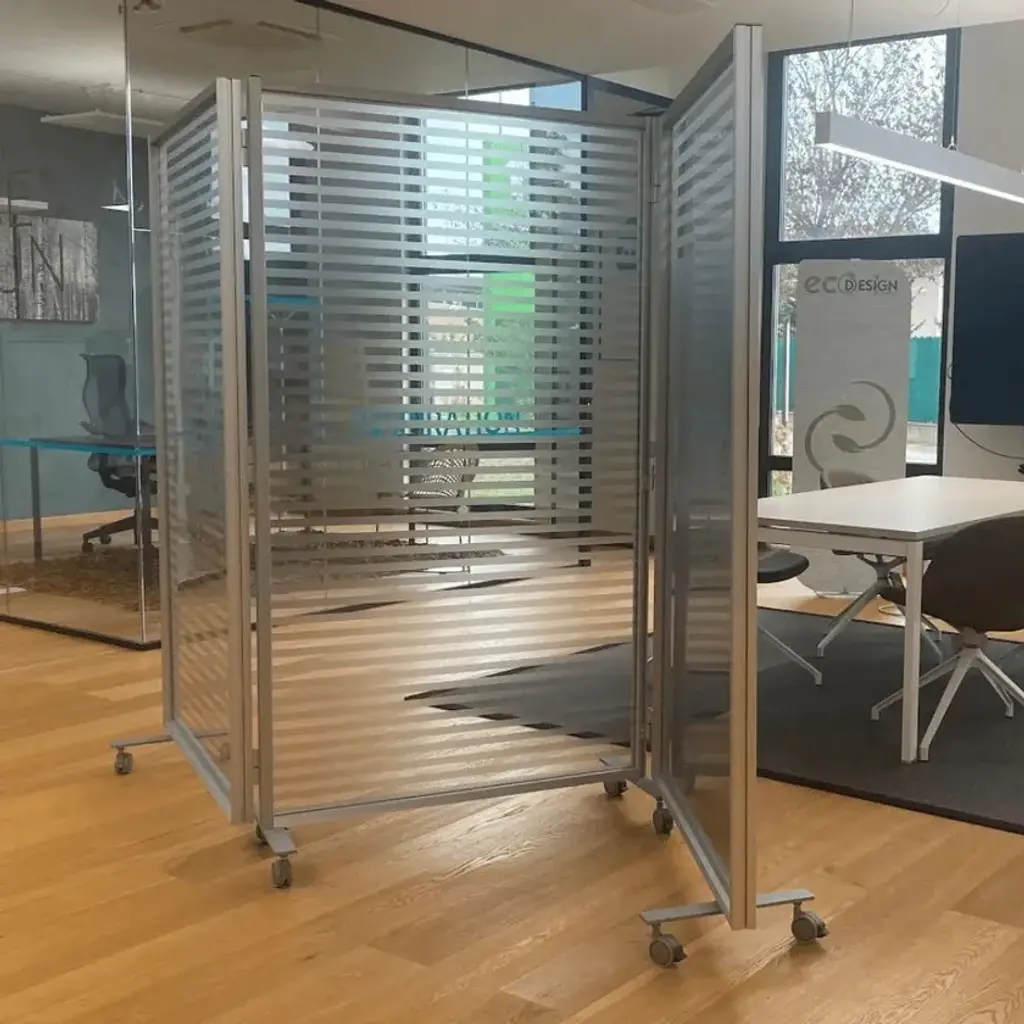 Twist is an indoor foldable divider with self-supporting structure complete with self-braking wheels for easy handling. Its structure is flexible and allows the divider to be opened for wide coverage and closed again for storage. The frame is made of aluminum, silver finish, and the center panels are molded polycarbonate with a striped and bisected effect. Ideal for creating privacy and a see-through effect. The wheels allow it to slide easily, and the hinges allow the wall to be completely closed. Orientable in different directions thanks to the wheels and hinges.Completely closableSee-through striped effectEasily maneuverable solutionSilver color structure, also white, black and corten on requestA line of interior folding dividers that can be completely folded up for storage when not in use. It consists of a wide frame that can be directed as desired thanks to wheels and hinges. This solution is suitable for a variety of contexts, such as classrooms, offices and meeting rooms, or medical offices. It can also be used for making presentations or for exhibitions or as a room divider.