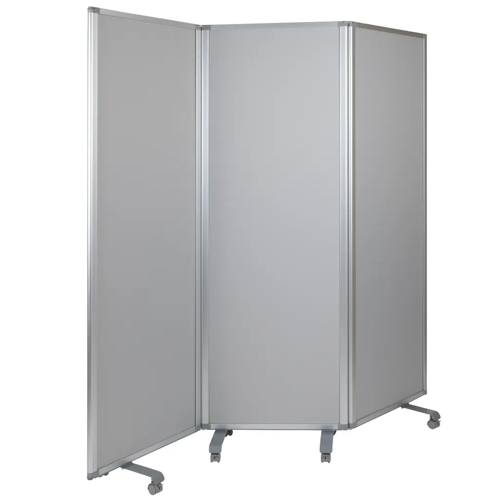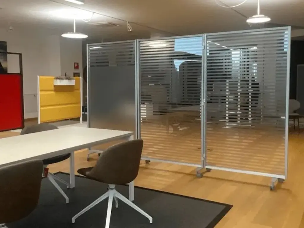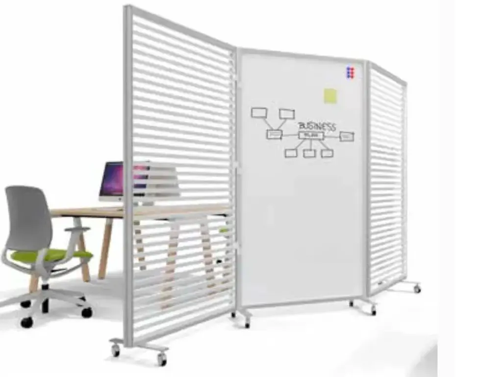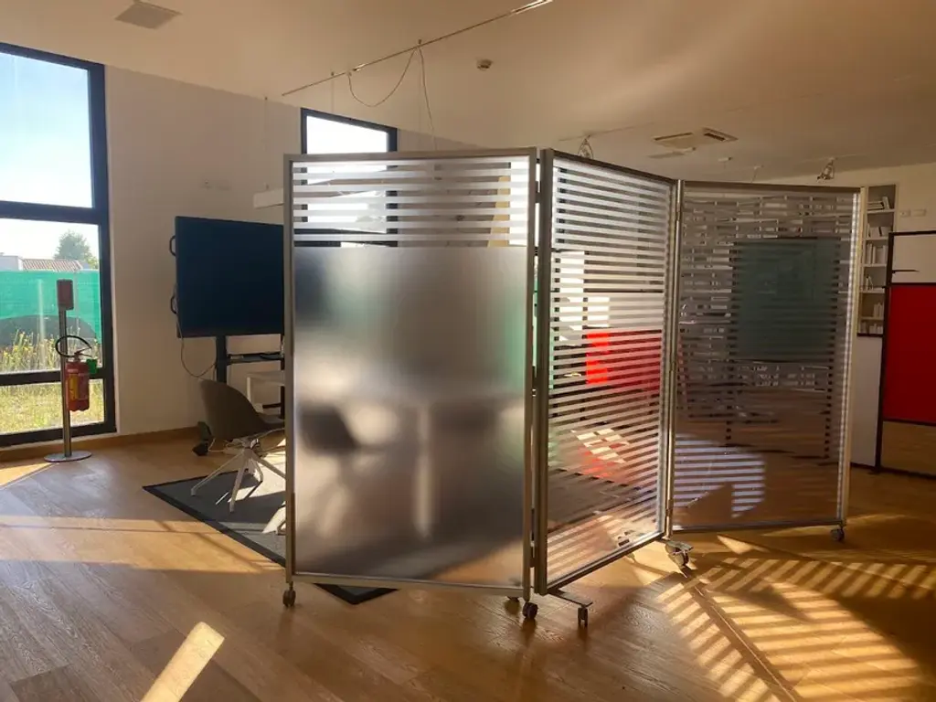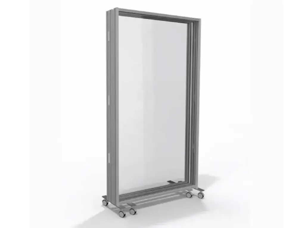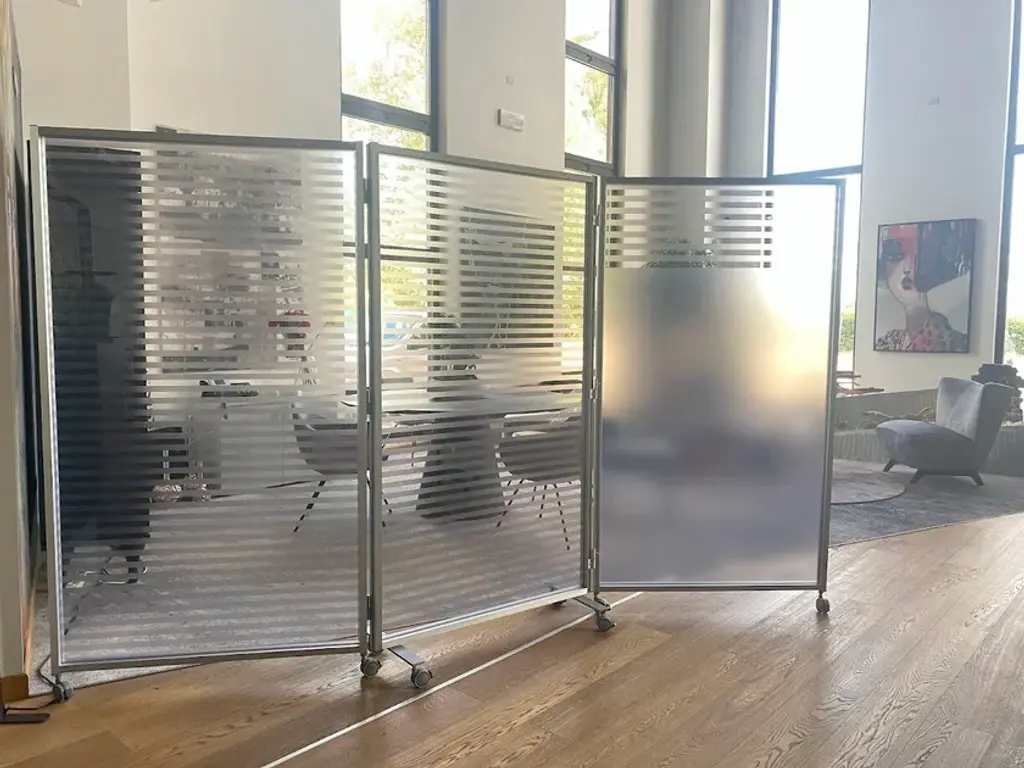 Twist is an indoor foldable divider with self-supporting structure complete with self-braking wheels for easy handling. Its structure is flexible and allows the divider to be opened for wide coverage and closed again for storage. The frame is made of aluminum, silver finish, and the center panels are molded polycarbonate with a striped and bisected effect. Ideal for creating privacy and a see-through effect. The wheels allow it to slide easily, and the hinges allow the wall to be completely closed. Orientable in different directions thanks to the wheels and hinges.Completely closableSee-through striped effectEasily maneuverable solutionSilver color structure, also white, black and corten on requestA line of interior folding dividers that can be completely folded up for storage when not in use. It consists of a wide frame that can be directed as desired thanks to wheels and hinges. This solution is suitable for a variety of contexts, such as classrooms, offices and meeting rooms, or medical offices. It can also be used for making presentations or for exhibitions or as a room divider.