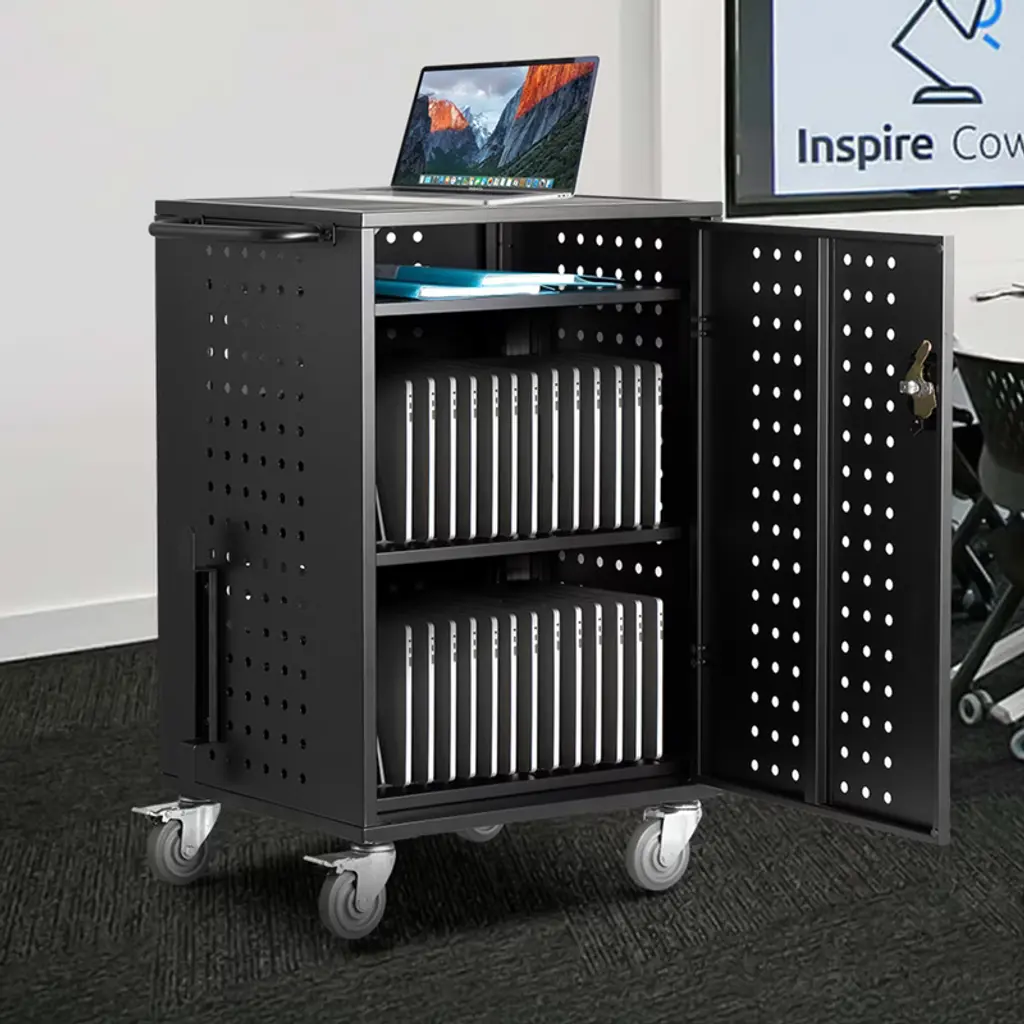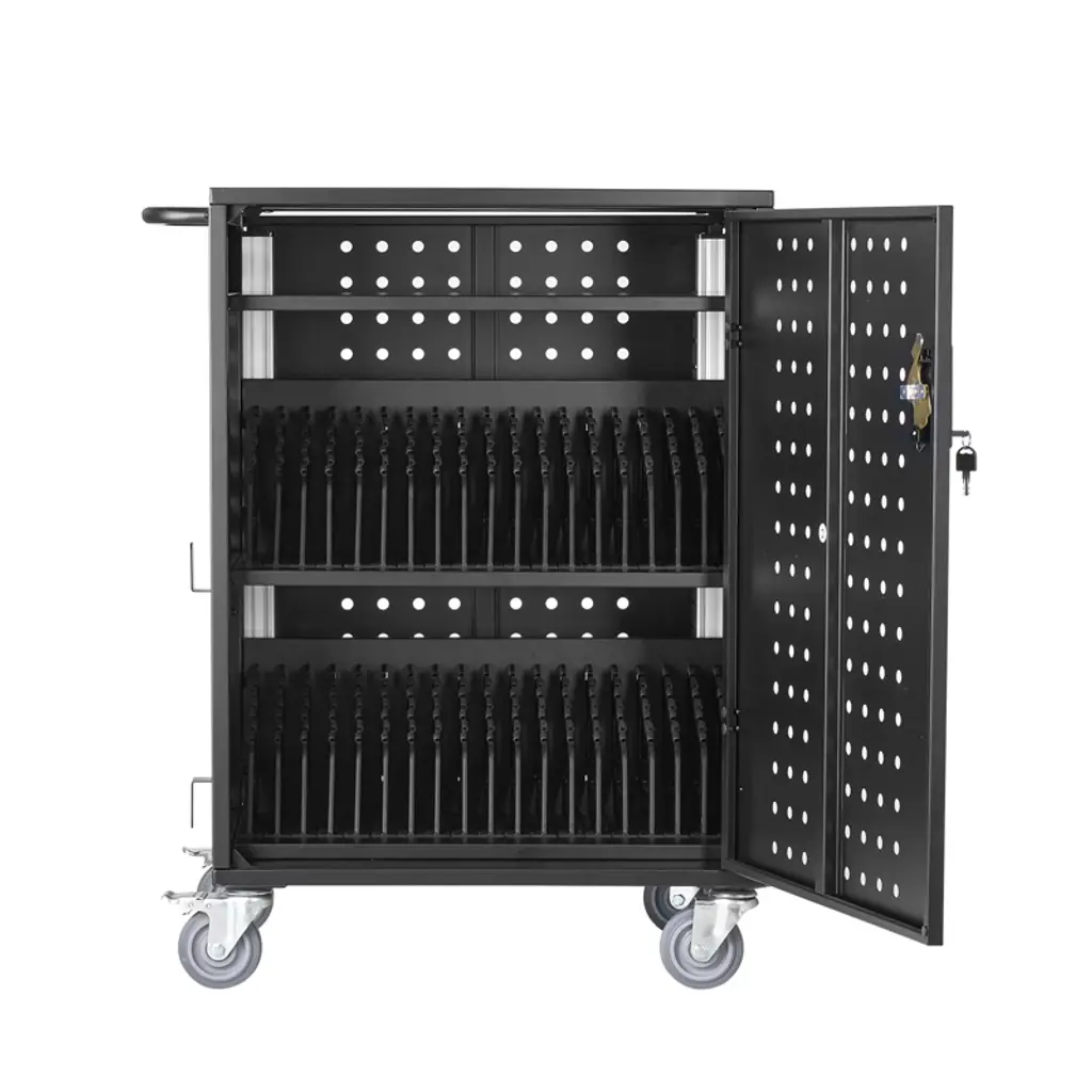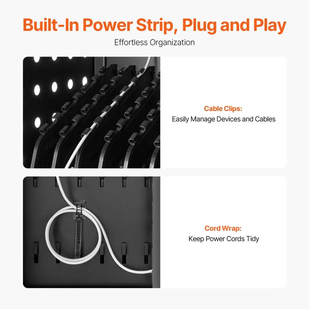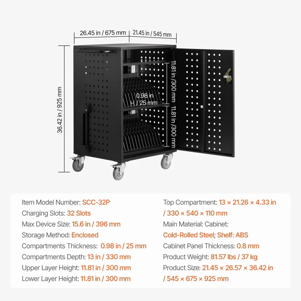 Feature: Efficient Space Management: This charging cart is thoughtfully designed with 32 slots, providing an organized space management solution. It accommodates laptops and tablets up to 15.6 inches, making it easy to manage various devices. Reliable and Secure Storage: Our laptop charging cart features built-in surge protection to avoid damage from power fluctuations. The ventilated panel design ensures efficient heat dissipation, while the lockable structure keeps devices secure. Easy Plug-and-Play Setup: With a built-in power strip and cable organizers, this charging storage cart helps keep devices and cables neatly arranged, avoiding tangling and ensuring a smooth charging experience. Smooth and Flexible Mobility: This mobile charging cart has sturdy wheels, making it easy to move around in any space, even when fully loaded. The two locking casters ensure stability wherever needed. Ideal for Various Settings: Whether in an office, classroom, library, hospital, or exhibition, this cart fits seamlessly into various settings and provides reliable performance. Package Content 1 x Charging Cart 22 x Phillips Screws with Washers (M5 x 12 mm) 4 x Phillips Screws (M8 x 15 mm) 2 x Phillips Round Head Screws (M10 x 15 mm) 1 x Open-End Wrench (M16) 2 x 16-Slot US Standard Power Strips 4 x Keys (2 for Front Door, 2 for Rear Door) 4 x Caster Wheels (2 with Brakes) 4 x Power Strip Fixing Clips 1 x Phillips Screwdriver 32 x Adhesive Cable Clips 1 x User Manual