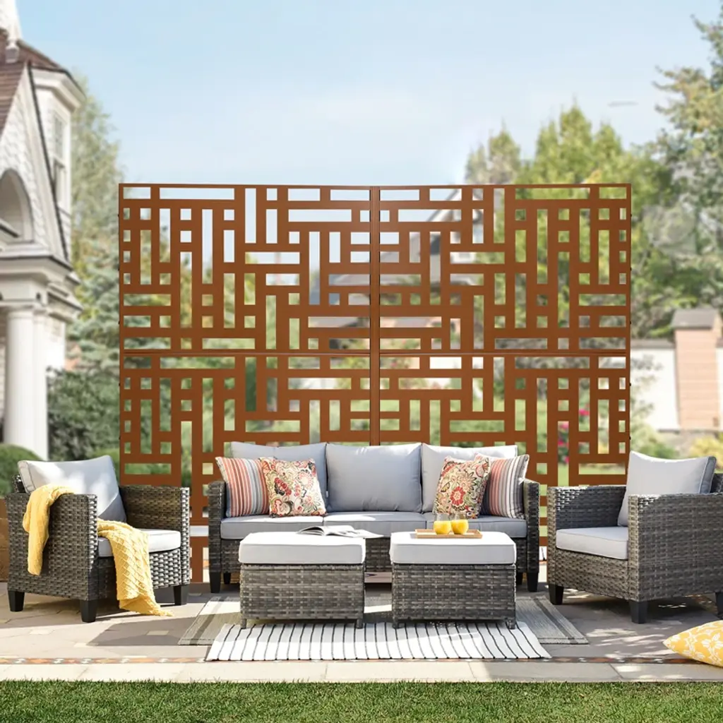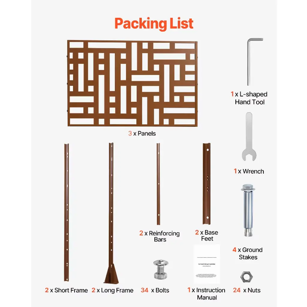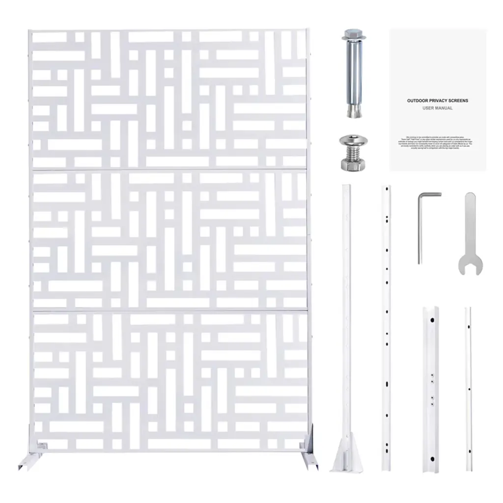 Feature: Elegant Privacy Solution: Enhance your living space with a stylish metal privacy screen that not only defines areas but seamlessly blends with any interior décor. This patio privacy screen adds a touch of elegance while creating a secluded, private space, providing you with both privacy and aesthetic appeal. Durable and Stable Construction: Crafted from high-quality metal and stainless steel, our outdoor privacy screen features a 20-inch ground support base for added stability. Reinforced metal side frames ensure extra strength, making the structure highly resistant to tipping over, even in windy conditions. The galvanized metal finish and stainless steel bolts ensure long-term durability, preventing rust and deformation, even with extended outdoor use. Versatile Installation Options: Offering multiple installation methods, this privacy screen for garden can meet various needs. You can install it vertically, directly into the ground, or horizontally for a different effect. It can also be suspended in your yard or mounted directly on the wall without the need for additional supports, making it an ideal addition to your outdoor decorations. Ideal for Multiple Settings: This outdoor privacy screen not only shields your space from prying eyes but also enhances the look of your home and garden. Use it as a support for climbing vines and flowers, creating a unique plant wall. It can also serve as a decorative partition to divide furniture areas, effortlessly blending into your home’s overall design. What's Included: The package includes 3 panels, 2 short frames, 2 long frames, 2 base feet, 2 reinforcing bars, 34 bolts, 24 nuts, 1 wrench, 1 l-shaped tool, 4 ground stakes, 1 instruction manual. Package Content 3 x Panels 2 x Short Frames 2 x Long Frames 2 x Base Feet 2 x Reinforcing Bars 34 x Bolts 24 x Nuts 1 x Wrench 1 x L-Shaped Tool 4 x Ground Stakes 1 x Instruction Manual
