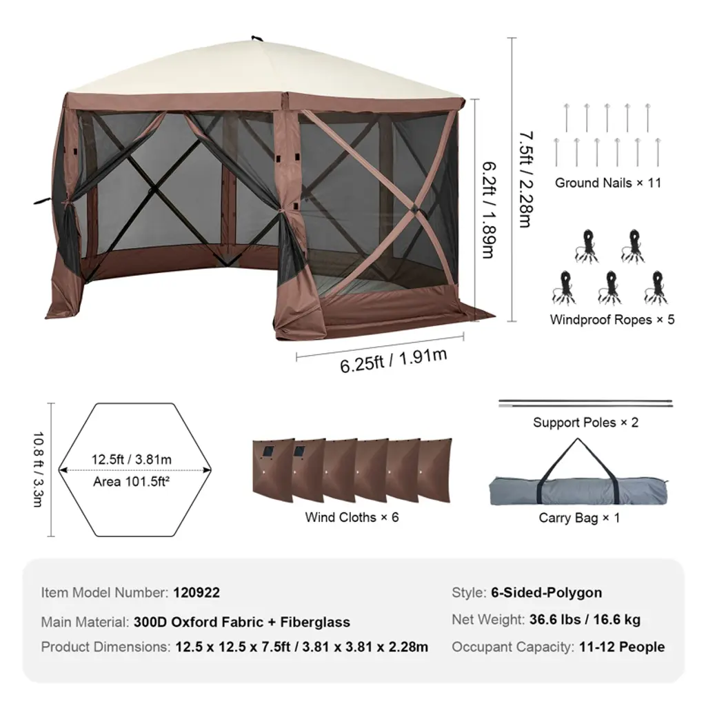 Vevor Pop Up Gazebo Tent, Pop-up Screen Tent 6 Sided Canopy Sun Shelter, 12.5x12.5ft Quick Set Screen Tent With Mosquito Netting, Brown