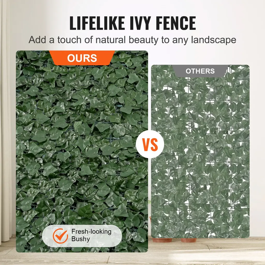 Realistic Natural Look: Size: 59" x 118" / 39" x 98" / 96" x 72" / 39" x 198" / 59" x 98" / 39" x 158" / 59" x 158". All the leaves are designed to be lifelike and veined. The realistic foliage mimics the look of real ivy, creating an elegantly pleasing backdrop and enhancing the overall visual appeal of your space. You will be immersed in a surreal green scene. Fade-resistant Material: Looking for a secure decorative alternative? Our ivy privacy fence is crafted with silk cloth leaves, plastic frames, and a PE mesh backing, ensuring no harm to your family or the environment. With its UV-resistant and healthy properties, you can expect long-lasting vibrancy. Make a sustainable choice that adds beauty to your space. 100% Blockage: The leaves are positioned closely together, forming a natural barrier that blocks intense sunlight and unwanted views. Despite their density, the faux ivy screen still allow for airflow through the mesh back. The reinforced connections ensure the leaves remain securely attached to the panels, preventing them from being blown away by harsh conditions. Hassle-free Installation: Our artificial ivy fence is packaged in rolls to prevent leaves from falling. You can easily install it to your fence or railing using zip ties (not included) in just a few minutes. It can be used horizontally or vertically and blends seamlessly with natural landscaping. Additionally, you can cut and shape it to fit any space. Functional Accent: Start your DIY projects in your garden, patio, balcony, or swimming pool area. The ivy fence privacy screen do not require watering, trimming, or pruning, which saves you time and effort. More than just providing decoration and privacy, they also reduce wind gusts and create a more comfortable outdoor environment.Friendly Note: Product will be shipped in 2 pcs, total width is 59 in Package Content 1 x Ivy Fence (Product will be shipped in 2 pcs)