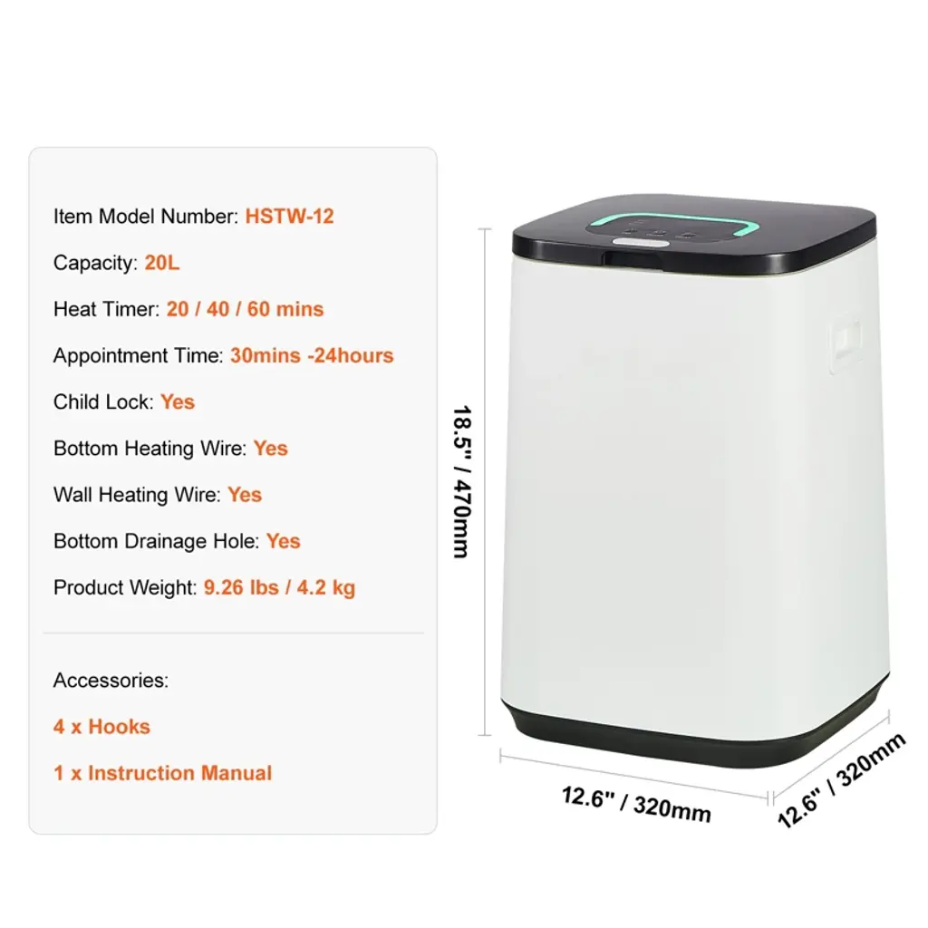 Feature: Even Heating: The bucket wall and bottom of the towel warmer bucket are equipped with heating devices to ensure that the towels are heated evenly. This prevents any areas from being too hot or too cold. Convenient Operation: The towel warmer features a user-friendly design, allowing you to choose between 20, 40, and 60 min timers and a 24-hour delay function, so warmth is always available when you need it. For example, you can put on warm clothes when you get up in the morning, wrap yourself in a warm bath towel after the SPA. Large Capacity: With a 20L large capacity, the large towel warmer for bathroom can hold two oversized bath towels (70 x 40 in / 177.8 x 101.6 cm), bathrobes, blankets, pajamas, and more. Alternatively, it can hold around 5 medium-sized bath towels. The inner wall hook design provides convenience for hanging and retrieving items, considering usability. Customizable Fragrance: The smart towel warmer bucket is equipped with an aroma placement area, you can insert various fragrance discs or essential oils soaked pad to give your towels and blankets a unique scent. Enjoy a delightful aroma every time you use your towels and blankets. Safe and Warm: The towel warmer comes with a child lock and a U-shaped high-temperature indicator light, ensuring safety and convenience. Made from V0 flame-retardant materials, it ensures household safety, providing a warm and secure environment. Package Content 4 x Hooks 1 x Instruction Manual