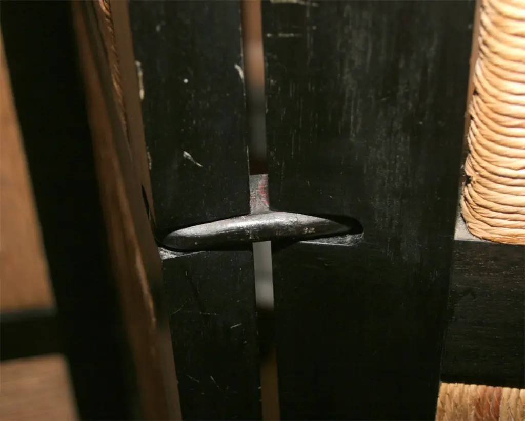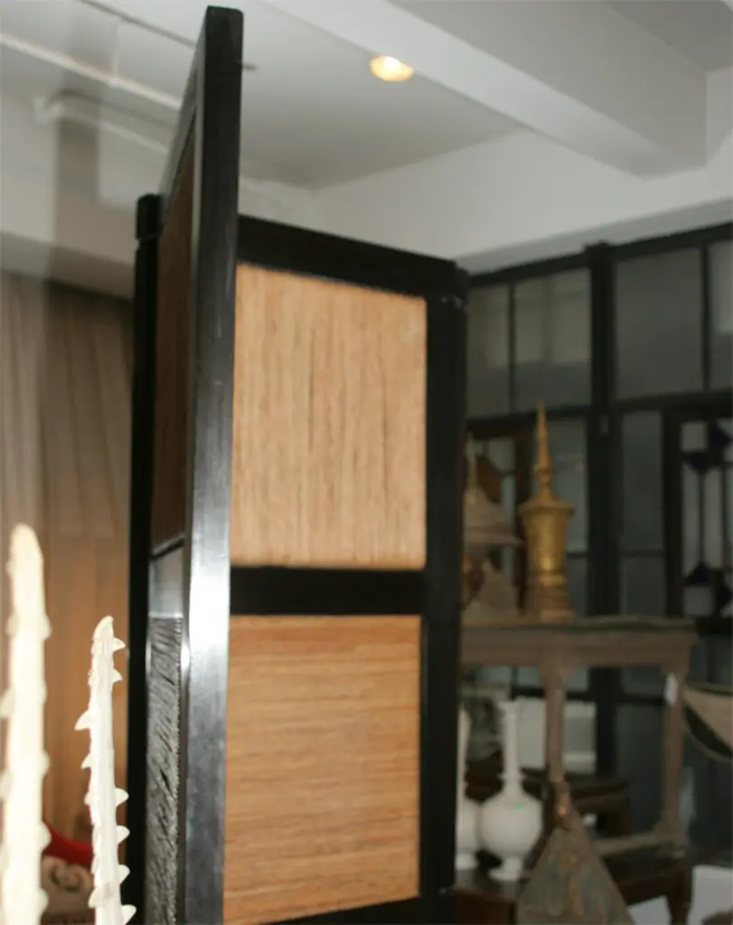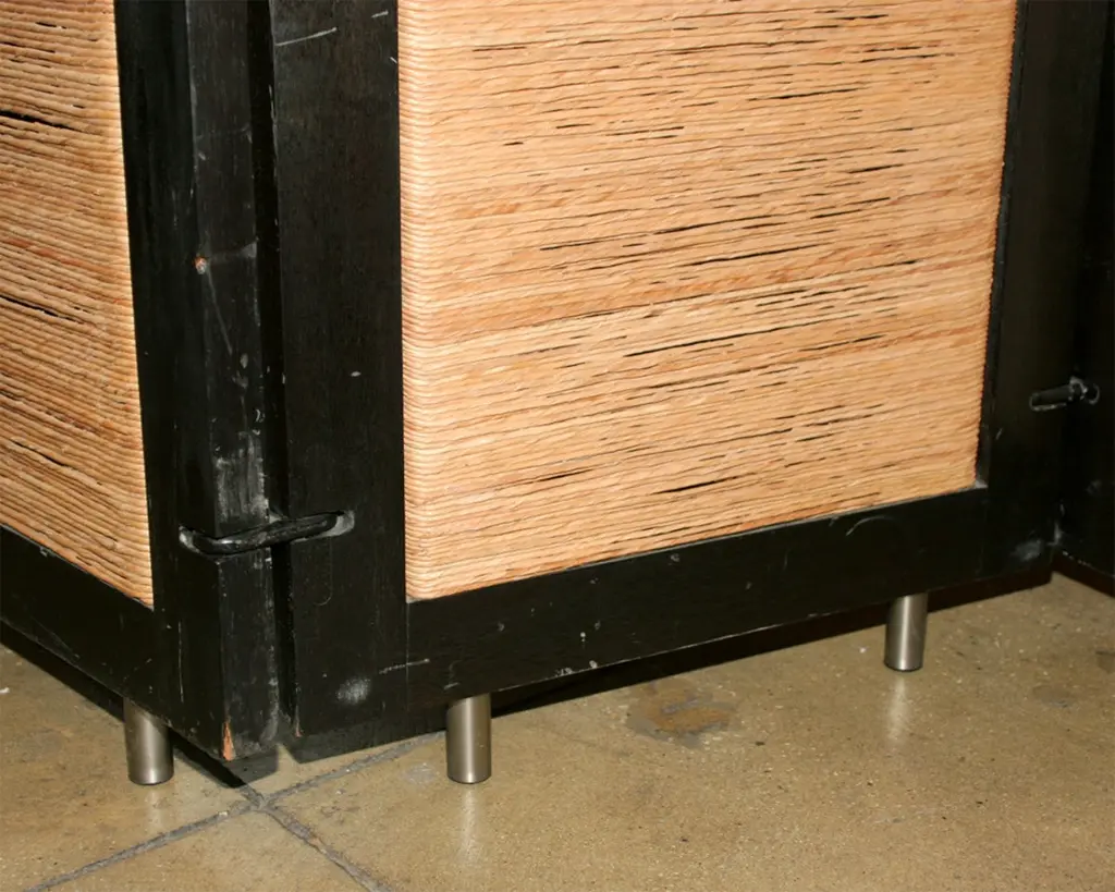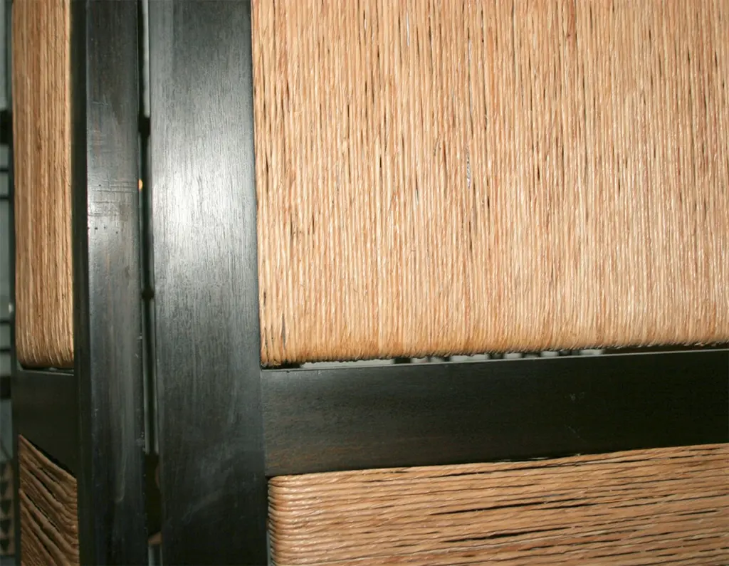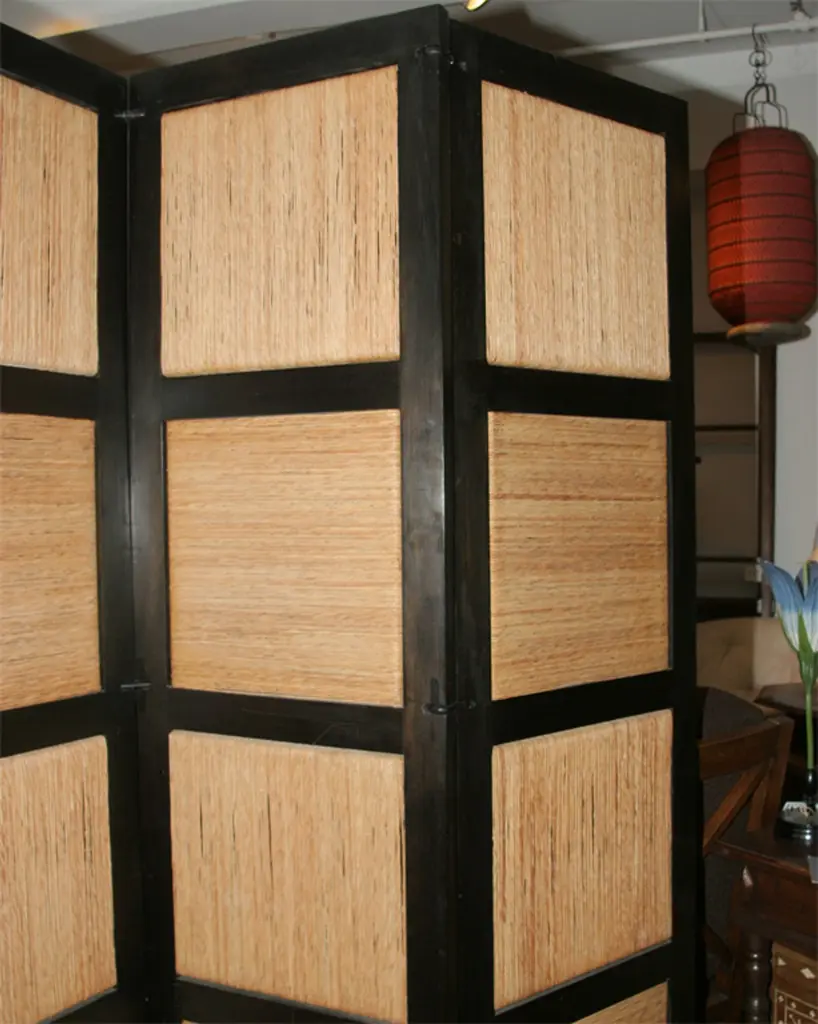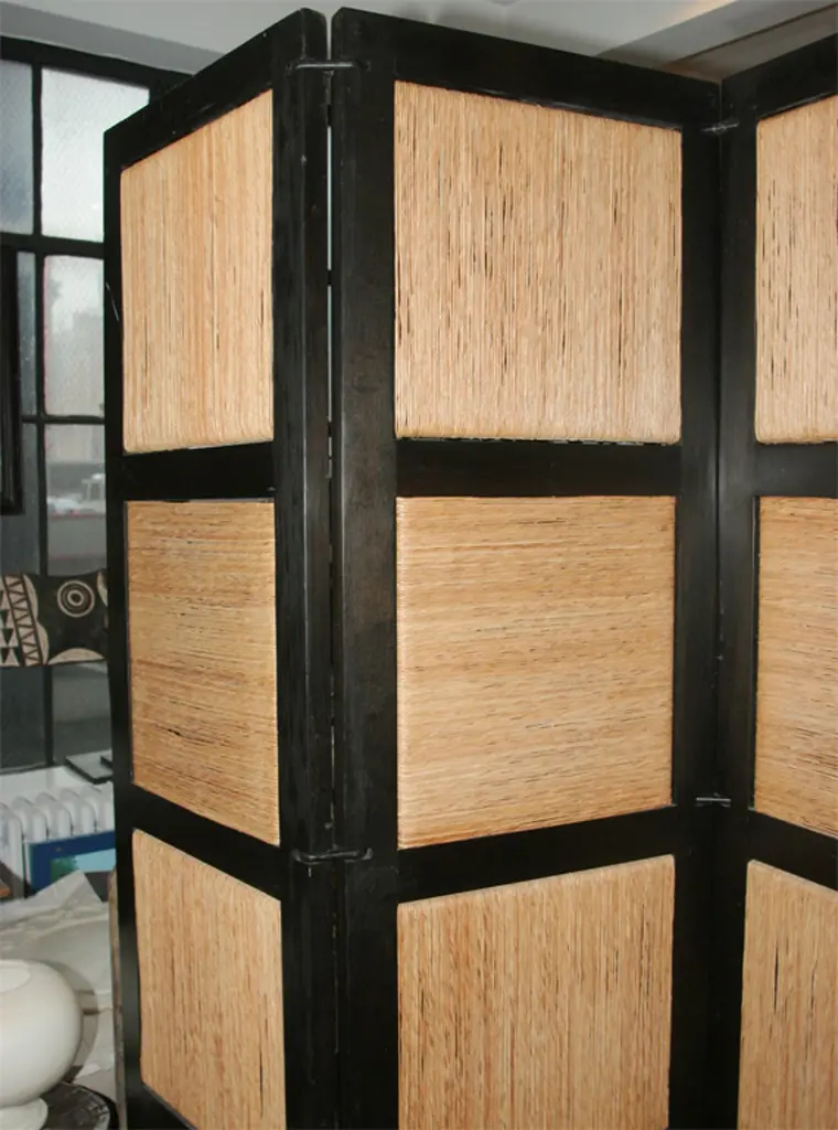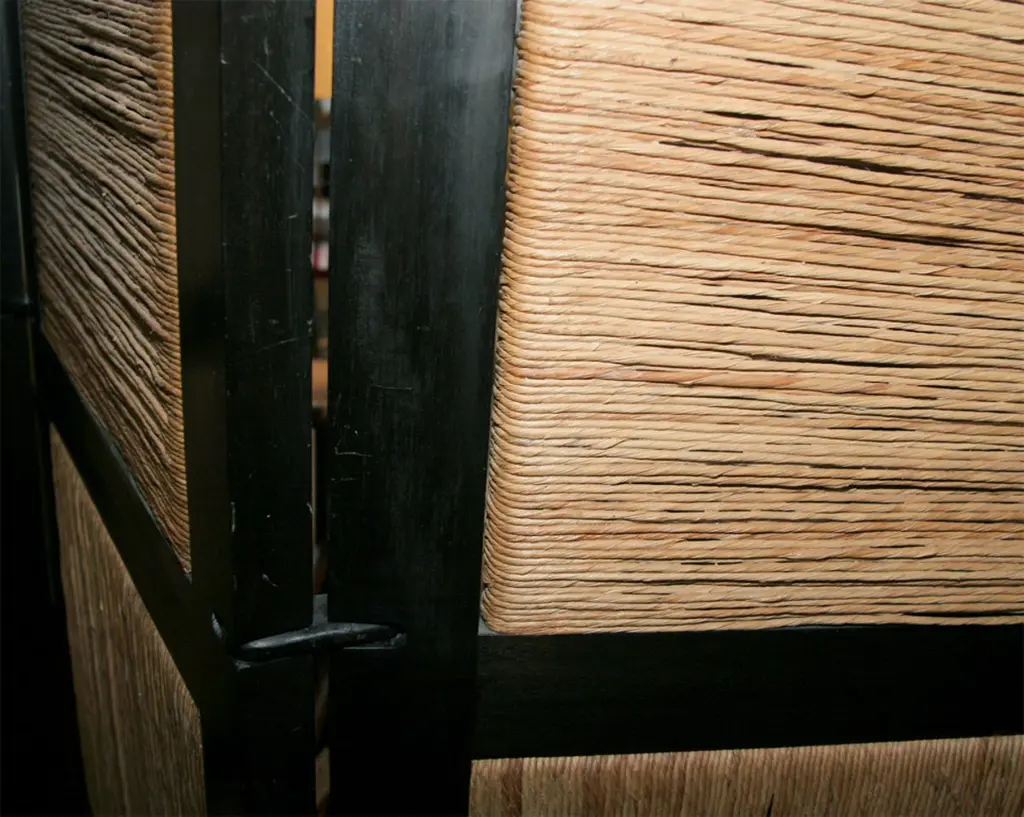 A four-panel screen designed by Vicente Wolf. Dark wood frame encasing woven hemp panels. 69" tall, expands to 84" wide. Two available. Sold separately.