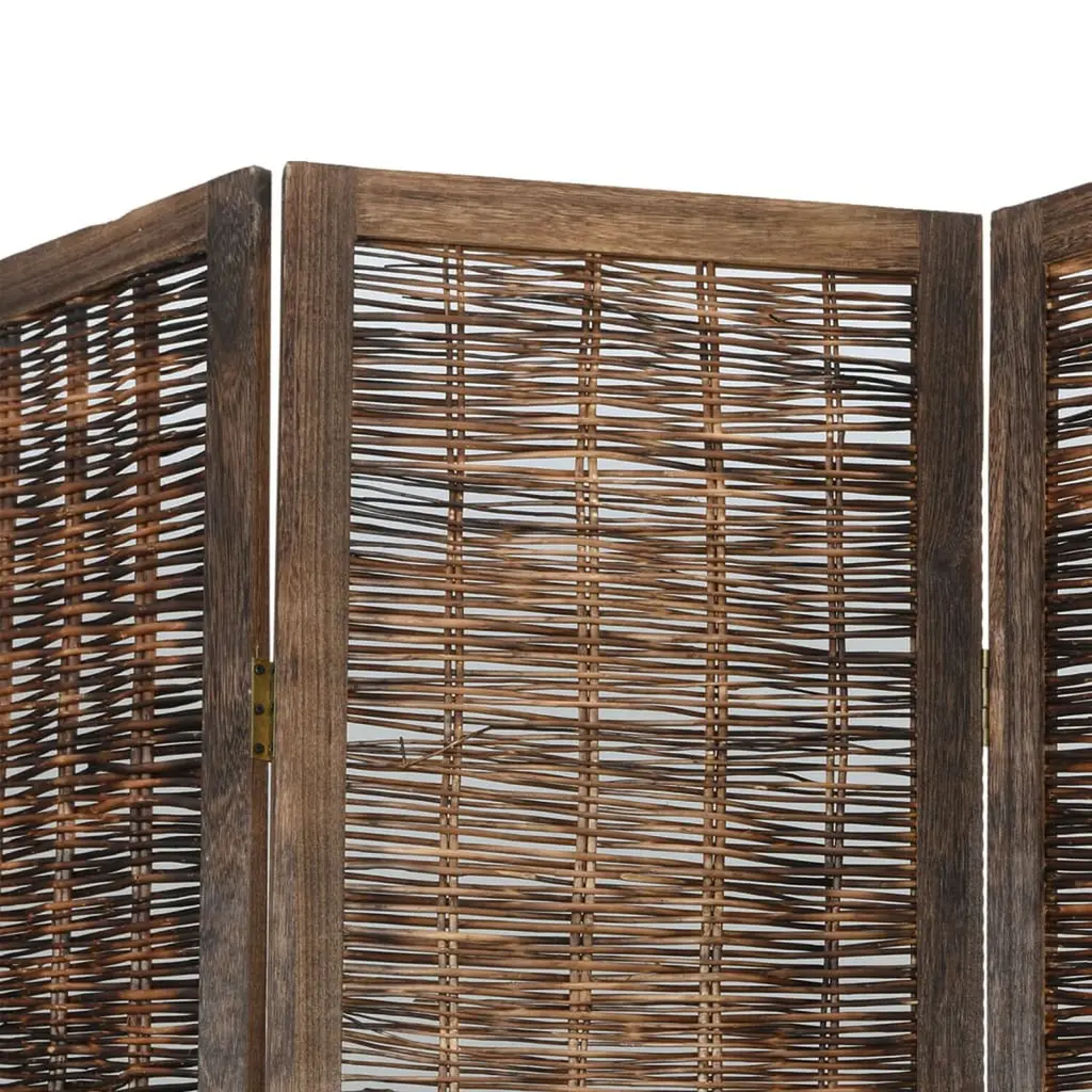 Bring elegance and an eye-catching decorative touch to your space with this charming room divider.Durable and easy to clean: The privacy screen is made from willow twig, making it easy to clean and durable.Stable frame: The solid paulownia wood frame ensures sturdiness and stability. Solid paulownia wood is a beautiful natural material. Paulownia wood highly resists rotting.Flexible and easy to fold: Each partition is connected by 3 metal hinges and the upper and lower panels are connected by hidden 2-in-1 hinges. So the room divider panel can be easily folded to some extent according to your needs to save space.Multipurpose: The room partition is great for creating private space in your bedroom, living room, office and other interiors. You can also place it in front of a window to block intense sunlight.Burnt looking: Featuring a burnt look, this folding room divider adds character and decoration to the space.Warning:Only for indoor use.