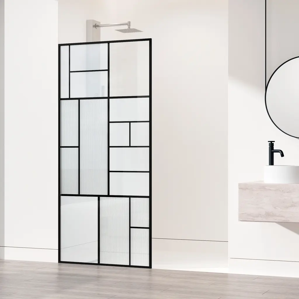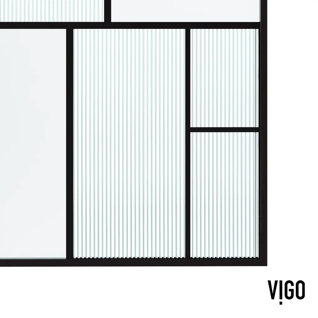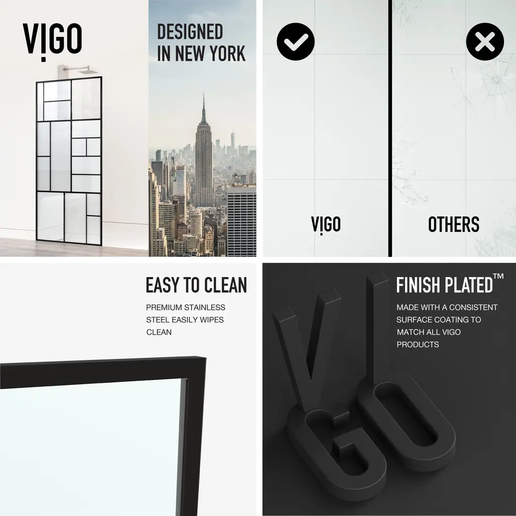 Inspired by Mondrian's iconic grid art, the Meridian LineArt™ framed Shower Screen in Matte Black elevates your bathroom into a modern art gallery. This unique design seamlessly blends clear, and privacy styles into a single 3/8-inch tempered glass piece, thanks to VIGO's innovative LineArt™ technology. The ANSI-certified construction ensures safety and durability, while the discreet clips and minimal seal strip create a sleek, seamless look that complements any bathroom style. The matte black finish-plated hardware not only resists corrosion but also harmonizes with other VIGO bathroom fixtures, offering a cohesive and sophisticated design for your entire space. Transform your daily shower into an artistic experience with our shower screen—where form and function meet in perfect harmony. Features:Measurements: