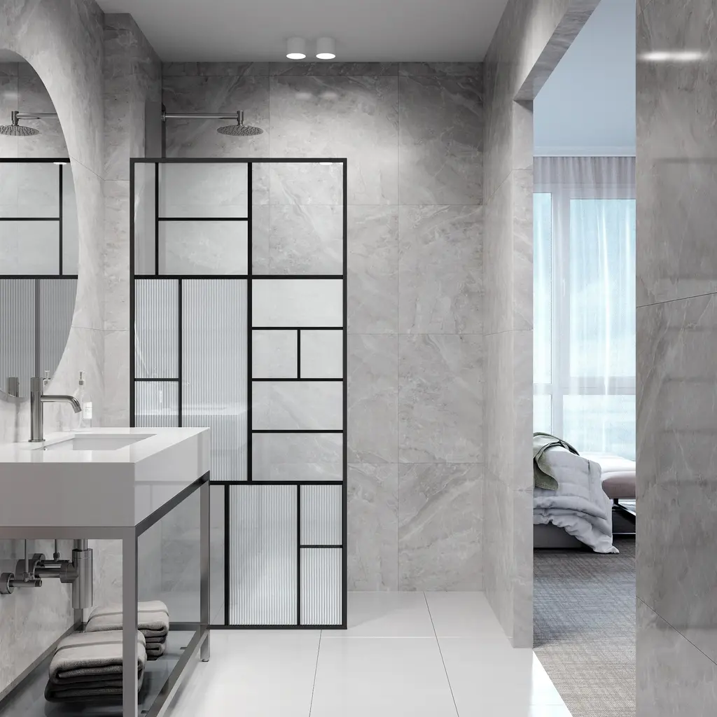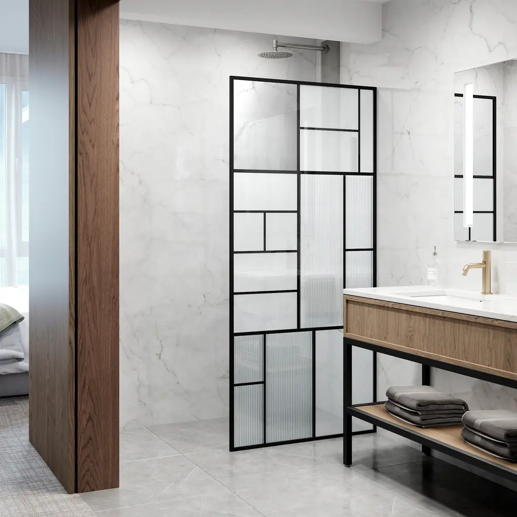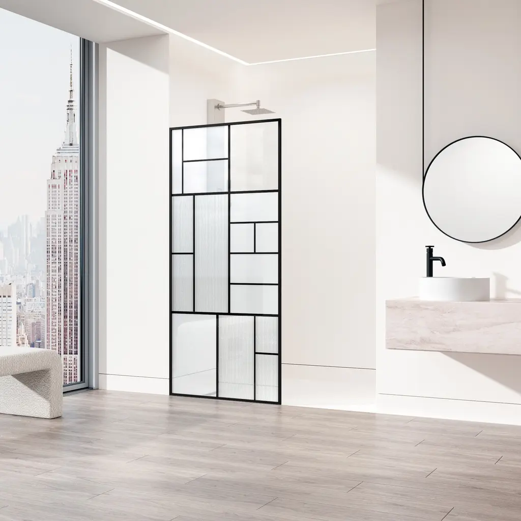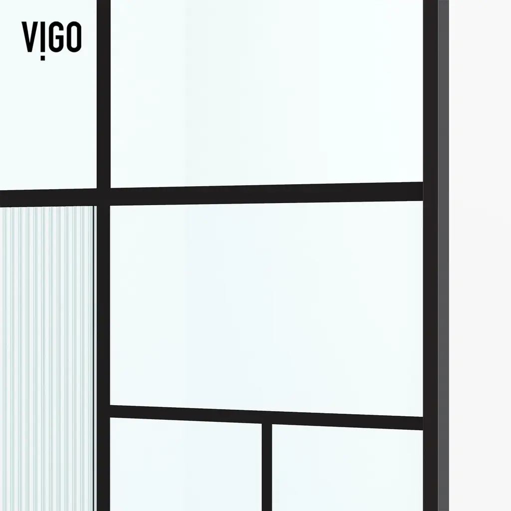 Inspired by Mondrian's iconic grid art, the Meridian LineArt™ framed Shower Screen in Matte Black elevates your bathroom into a modern art gallery. This unique design seamlessly blends clear, and privacy styles into a single 3/8-inch tempered glass piece, thanks to VIGO's innovative LineArt™ technology. The ANSI-certified construction ensures safety and durability, while the discreet clips and minimal seal strip create a sleek, seamless look that complements any bathroom style. The matte black finish-plated hardware not only resists corrosion but also harmonizes with other VIGO bathroom fixtures, offering a cohesive and sophisticated design for your entire space. Transform your daily shower into an artistic experience with our shower screen—where form and function meet in perfect harmony. Features:Measurements: