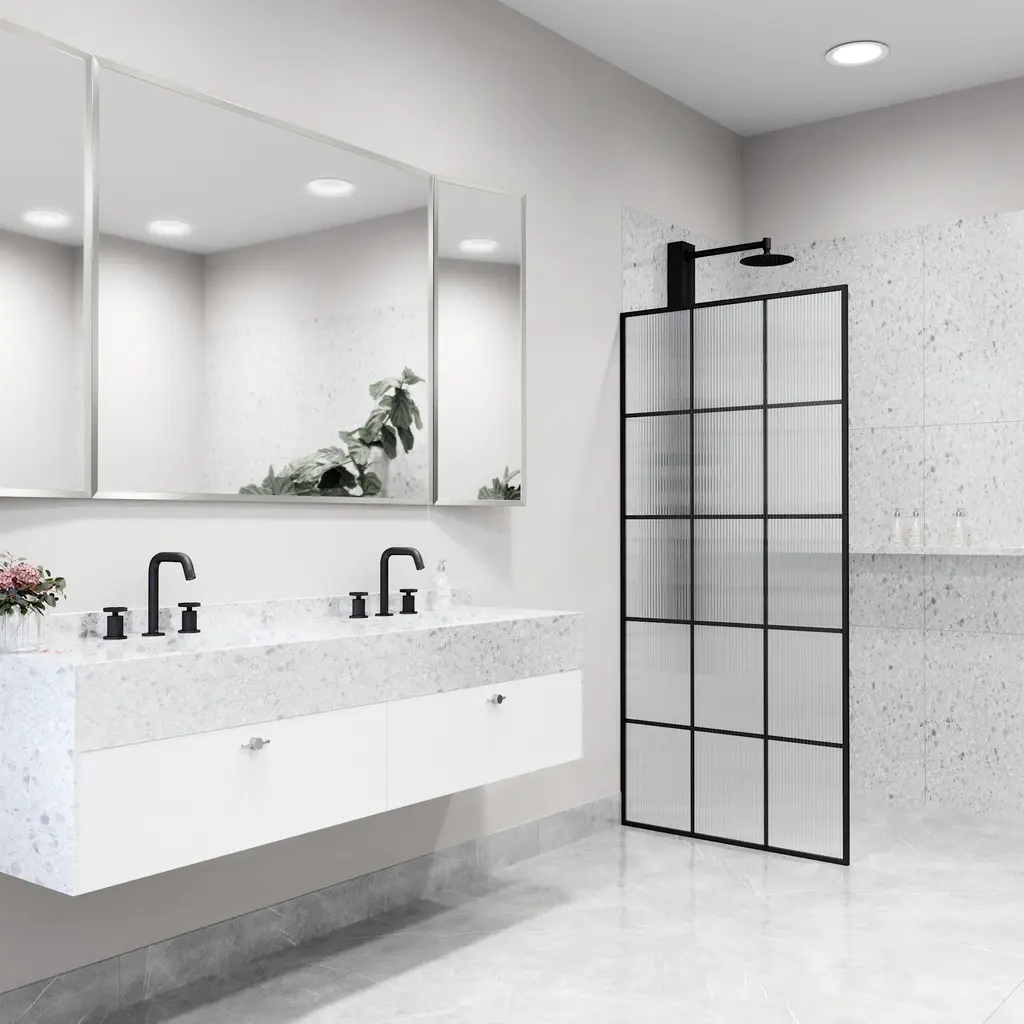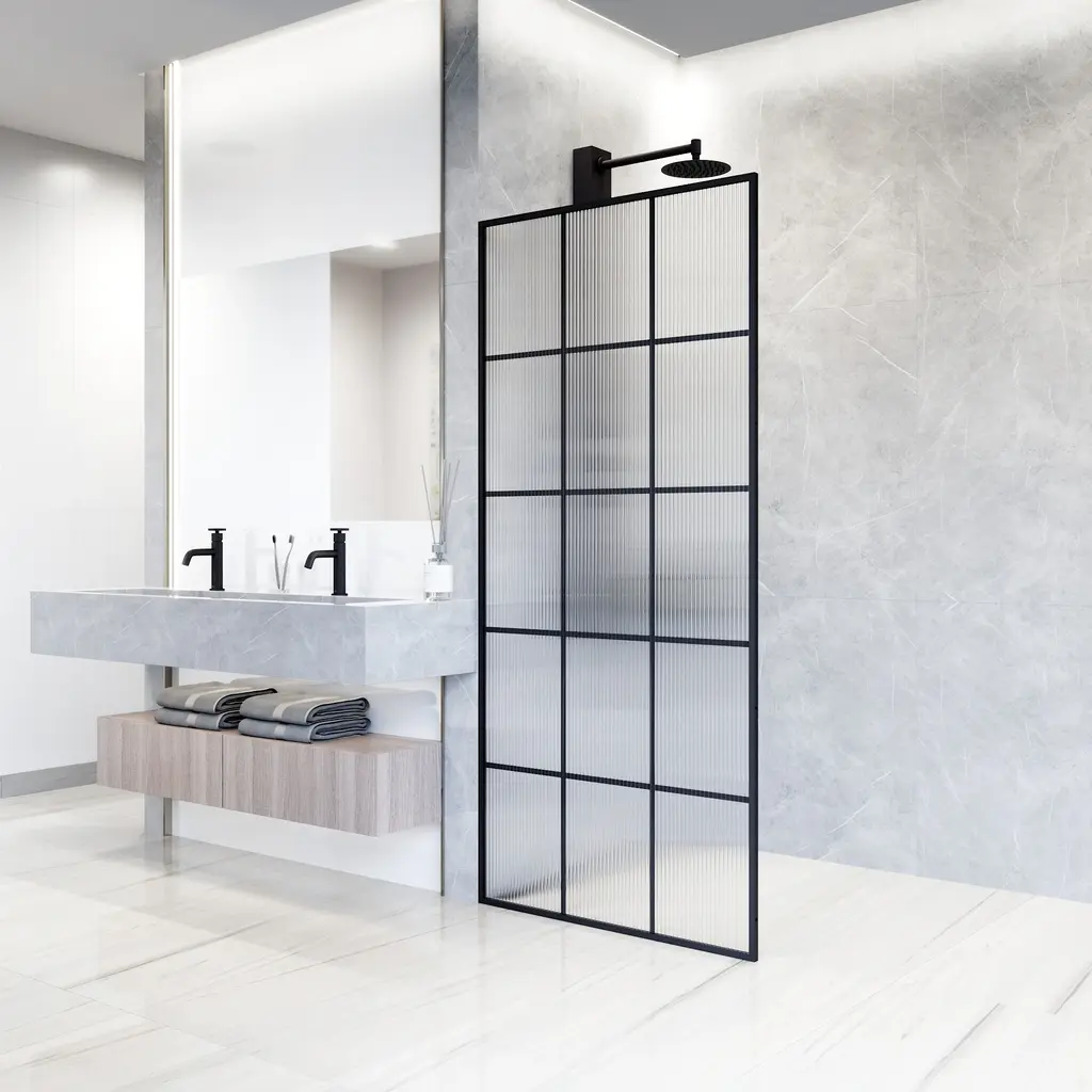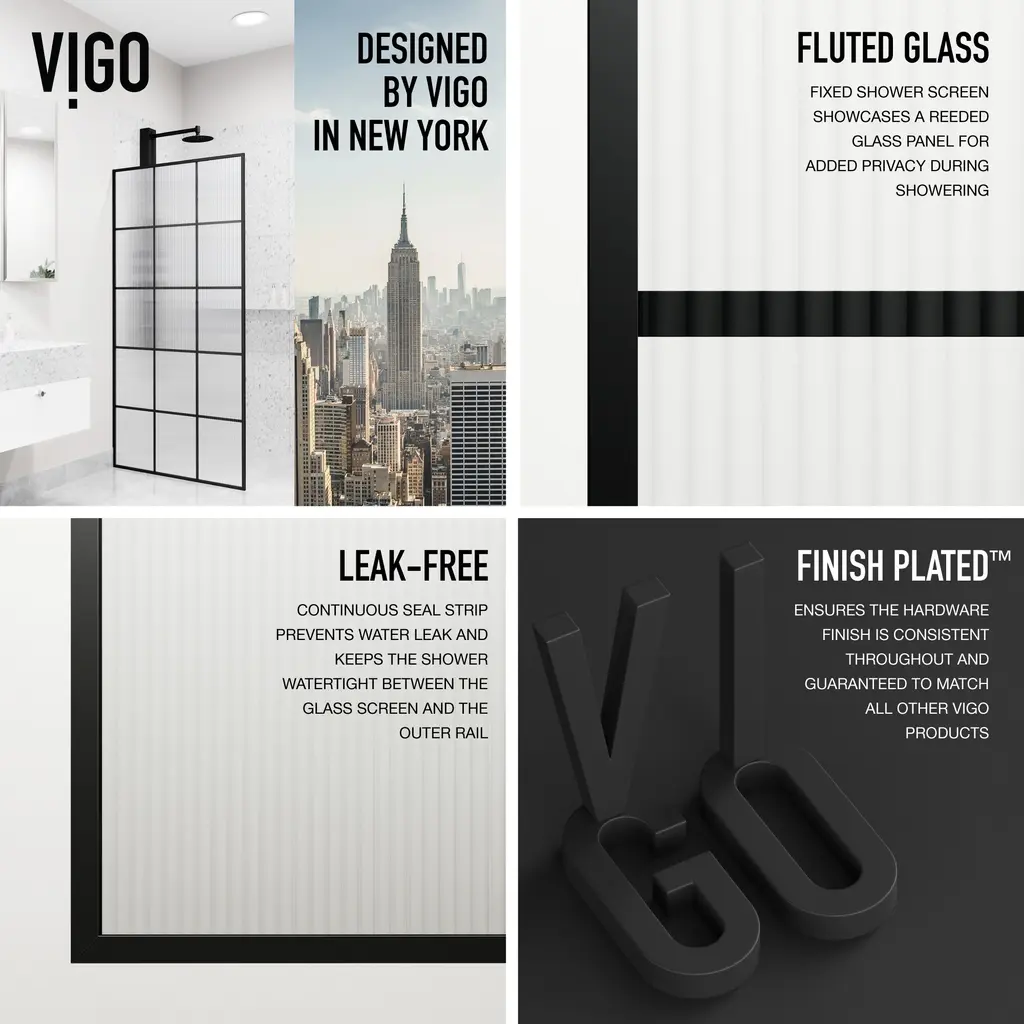 VIGO presents the Mosaic Fixed Framed Shower Screen. Its fluted tempered glass resists scratches and accidental breakage, making the Mosaic exceptionally safe. This model features black painted-on horizontal and vertical lines that mimic metal frames, keeping the screen lightweight without compromising style. The Mosaic features flexible installation options, allowing it to be connected to any wall and extend outward. Its full-length transparent vertical and bottom seals keep the shower watertight. VIGO's premium 7-layer hardware resists tarnishing, keeping the Mosaic shower screen like-new for years to come.