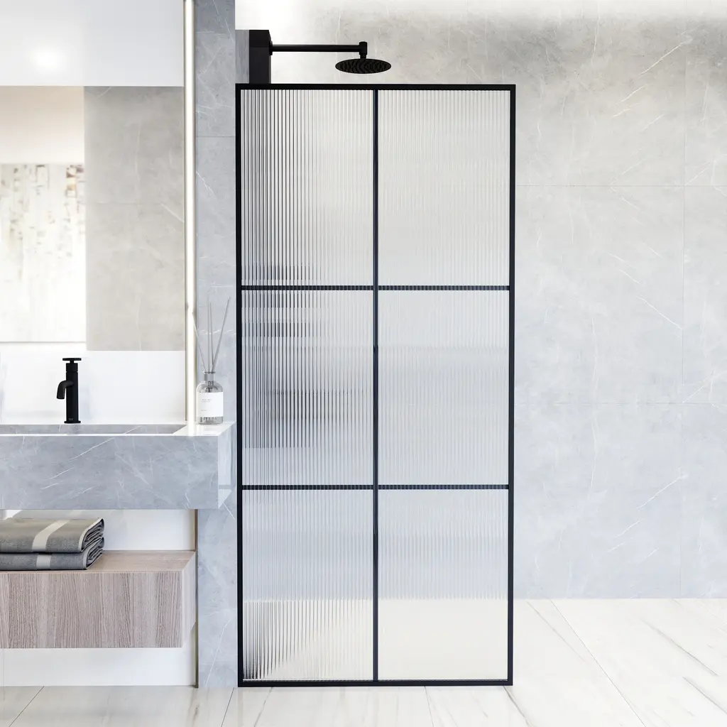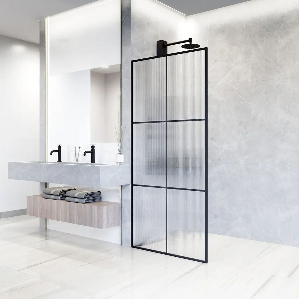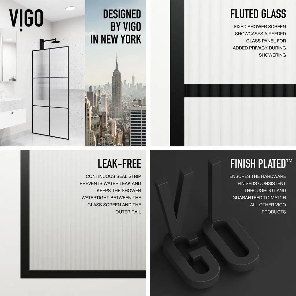 VIGO presents the Ventana Fixed Framed Shower Screen. Its fluted tempered glass resists scratches and accidental breakage, making the Ventana exceptionally safe. This model features black painted-on horizontal lines that mimic metal frames, keeping the screen lightweight without compromising style. The Ventana features flexible installation options, allowing it to be connected to any wall and extend outward. Its full-length transparent vertical and bottom seals keep the shower watertight. VIGO's premium 7-layer hardware resists tarnishing, keeping the Ventana shower screen like-new for years to come.