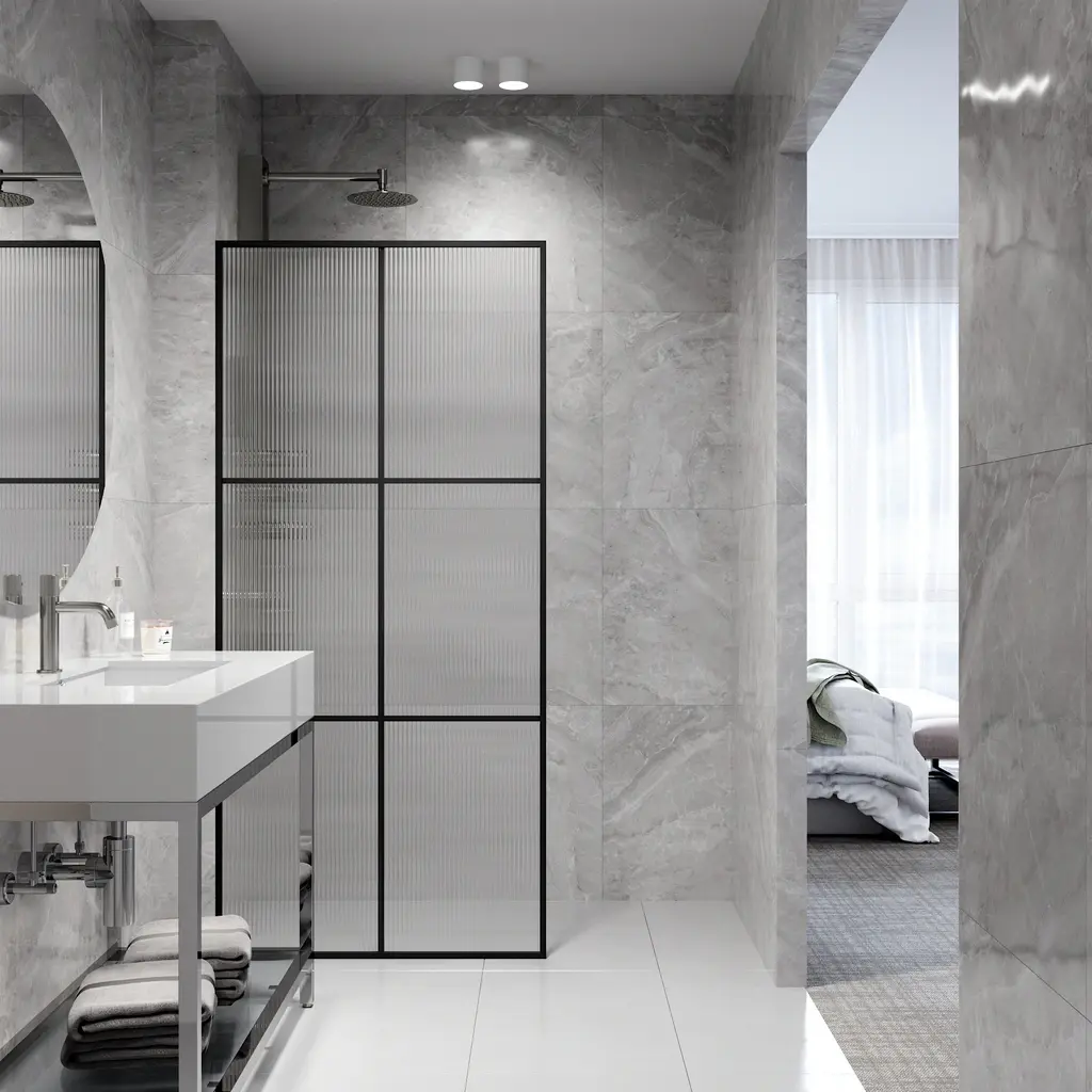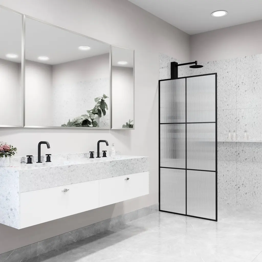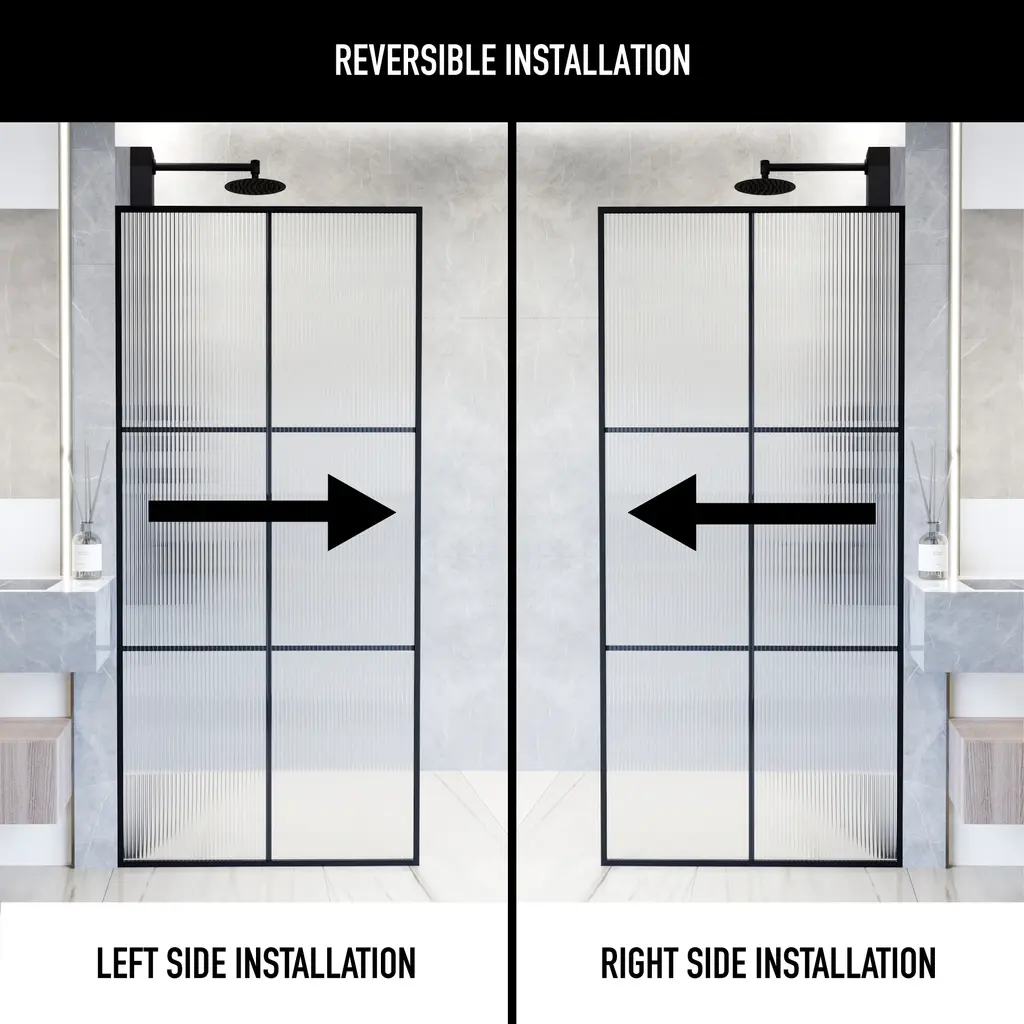 VIGO presents the Ventana Fixed Framed Shower Screen. Its fluted tempered glass resists scratches and accidental breakage, making the Ventana exceptionally safe. This model features black painted-on horizontal lines that mimic metal frames, keeping the screen lightweight without compromising style. The Ventana features flexible installation options, allowing it to be connected to any wall and extend outward. Its full-length transparent vertical and bottom seals keep the shower watertight. VIGO's premium 7-layer hardware resists tarnishing, keeping the Ventana shower screen like-new for years to come.