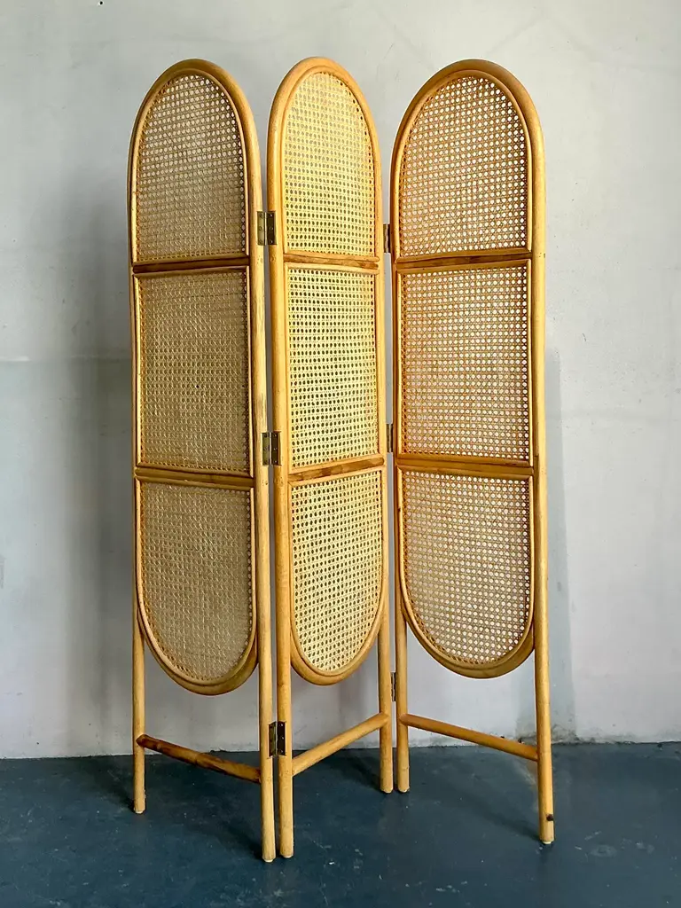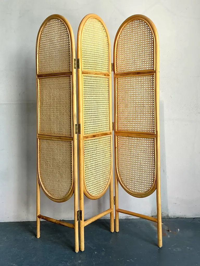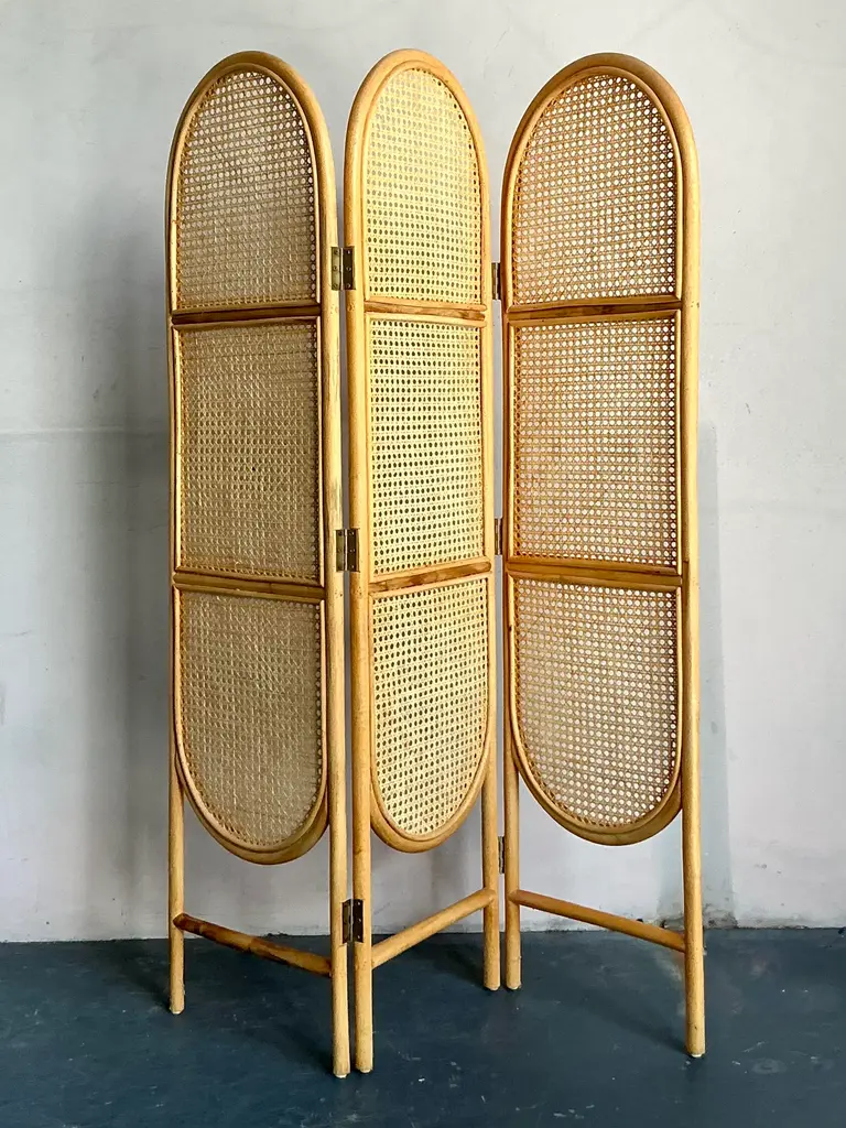 Elevate your living space with this captivating vintage Boho arched cane folding screen, a testament to the relaxed yet sophisticated aesthetic of the 1970s. Crafted from natural rattan and intricately woven cane, this room divider exudes an organic charm that effortlessly blends with various decor styles, from bohemian to minimalist. Its three gracefully arched panels create a dynamic visual interest, offering both artistic appeal and practical functionality for defining spaces or adding a touch of privacy. The light, airy construction allows for versatile placement, making it an ideal accent piece for any discerning home. This exquisite screen measures 49 inches in width, 10 inches in depth, and stands at an impressive 65 inches in height. It is in great vintage condition, displaying minor scuffs and blemishes that are appropriate to its age and use, which only enhance its authentic character and patina. This unique piece is perfect for adding texture and warmth to a bedroom, living room, or office. Don't miss the opportunity to make this distinctive and elegant room divider a cherished addition to your collection.