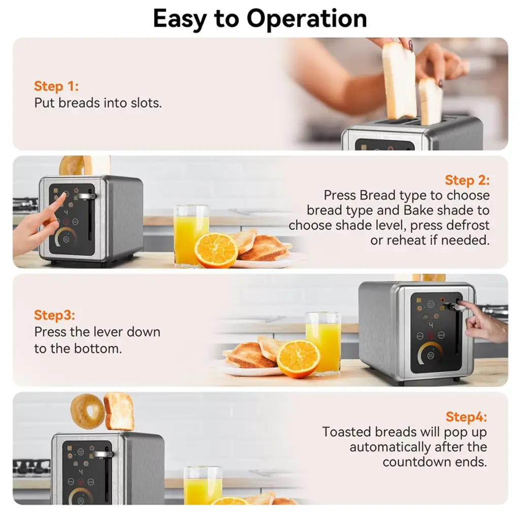 Whall 2 Slice Toaster, Touchscreen Toasters With Stainless Steel, Wide Slots, Bagel, Defrost, 850w
