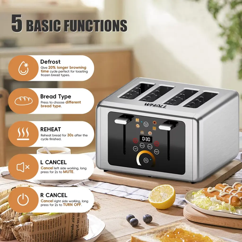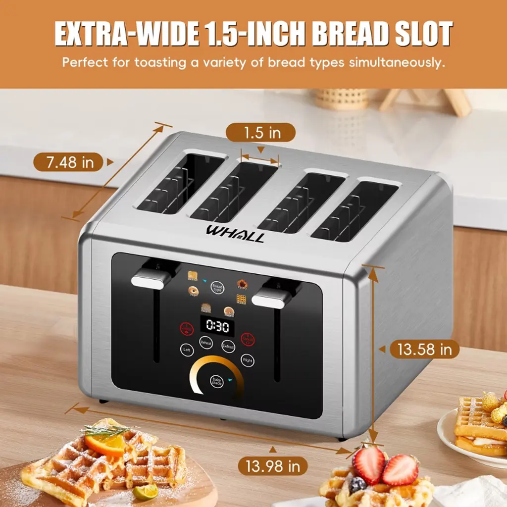 WHALL 4 Slice Touch Screen Toaster - Stainless Steel Toasters with Bagel,Cancel,Defrost Function, 1.5in Wide Slot, Removable Crumb Tray, 6 Bread Shade Settings, for Various Bread Types, 1500W Key Features 1. Smart Touchscreen Design 2. 6 Bread Type Options 3. 4 slices stainless steel toaster 4. 1.5-inch Wide Bread Slot 5. Removable Crumb Tray 6. Bagel/Defrost/Cancel Function 7. 6 Bread Shade Settings 8. Self-Adjusting Bread Carriage 9. The left and right ends can be operated independently Specifications Material: Stainless Steel Product Size: 13.98 x 13.58 x 7.48 In Product Weight: 7.04 Lbs. Rating Voltage: 120V~ 60Hz Rating Power: 1500W Item Condition: New Note 1. Before first use, preheat the toaster according to the tips in the manual. 2. After each use, simply switch off the toaster using the cancel button and unplug it. Allow the toaster to cool down before cleaning or moving it. 3. Avoid immersing the toaster or power cord in liquids to prevent electric shock and damage. Warranty & Service Our products come with one-year-free warranty. If any issues, please contact our customer service team, we will reply you within 24 hours