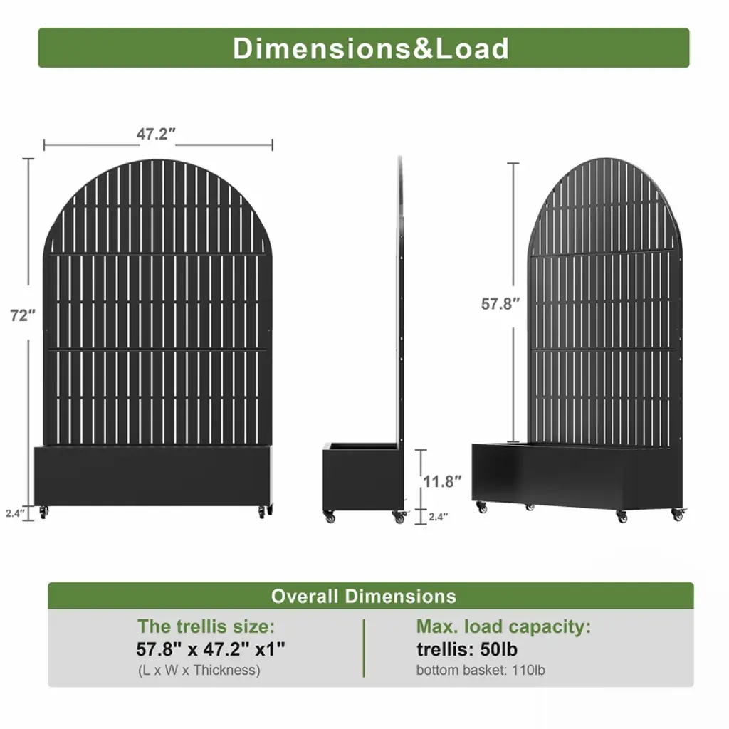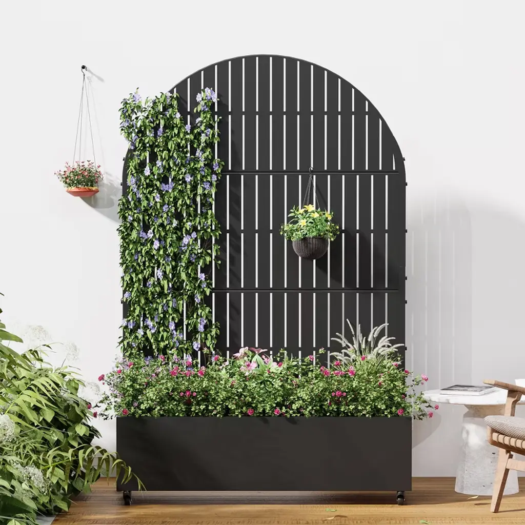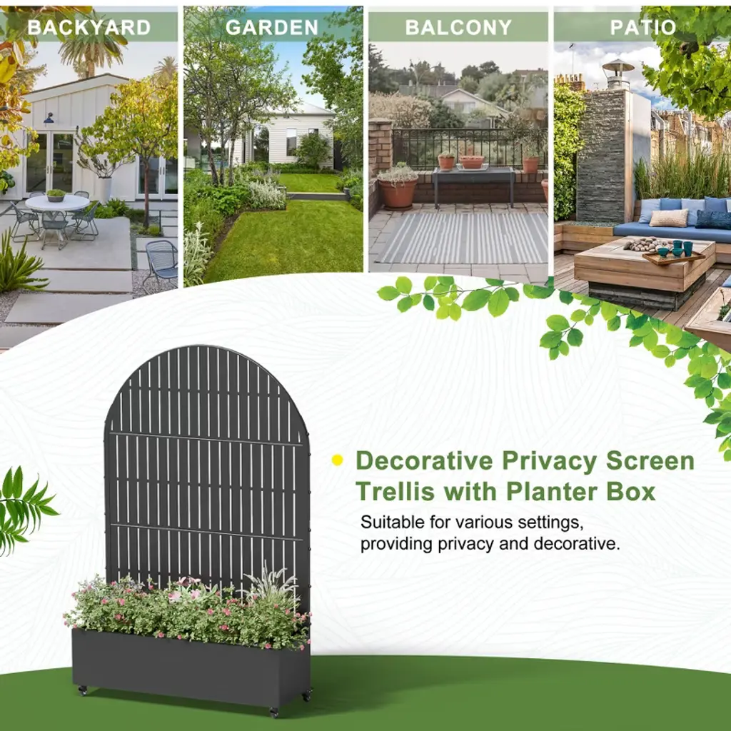 Introducing the Metal Planter Box with Trellis Raised Garden Bed with Arbor Privacy Screen with Wheels - the ultimate solution for creating a beautiful and functional outdoor or indoor space. This versatile garden bed combines the elegance of a trellis with the practicality of a raised bed. It also can be a perfect choice as a privacy screen when creating more beauty for your home.