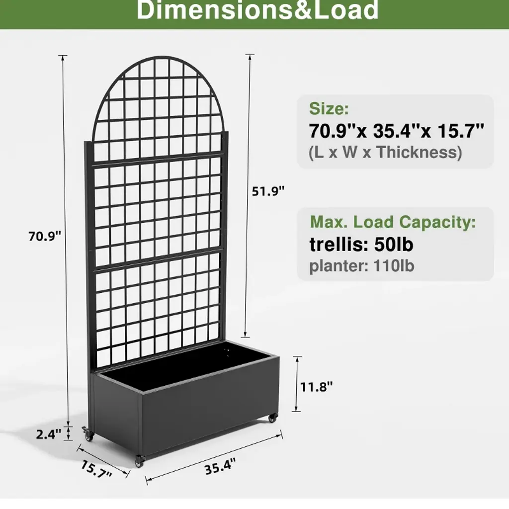 Introducing the Metal Planter Box with Trellis Raised Garden Bed with Arbor Privacy Screen with Wheels - the ultimate solution for creating a beautiful and functional outdoor or indoor space. This versatile garden bed combines the elegance of a trellis with the practicality of a raised bed. It also can be a perfect choice as a privacy screen when creating more beauty for your home.