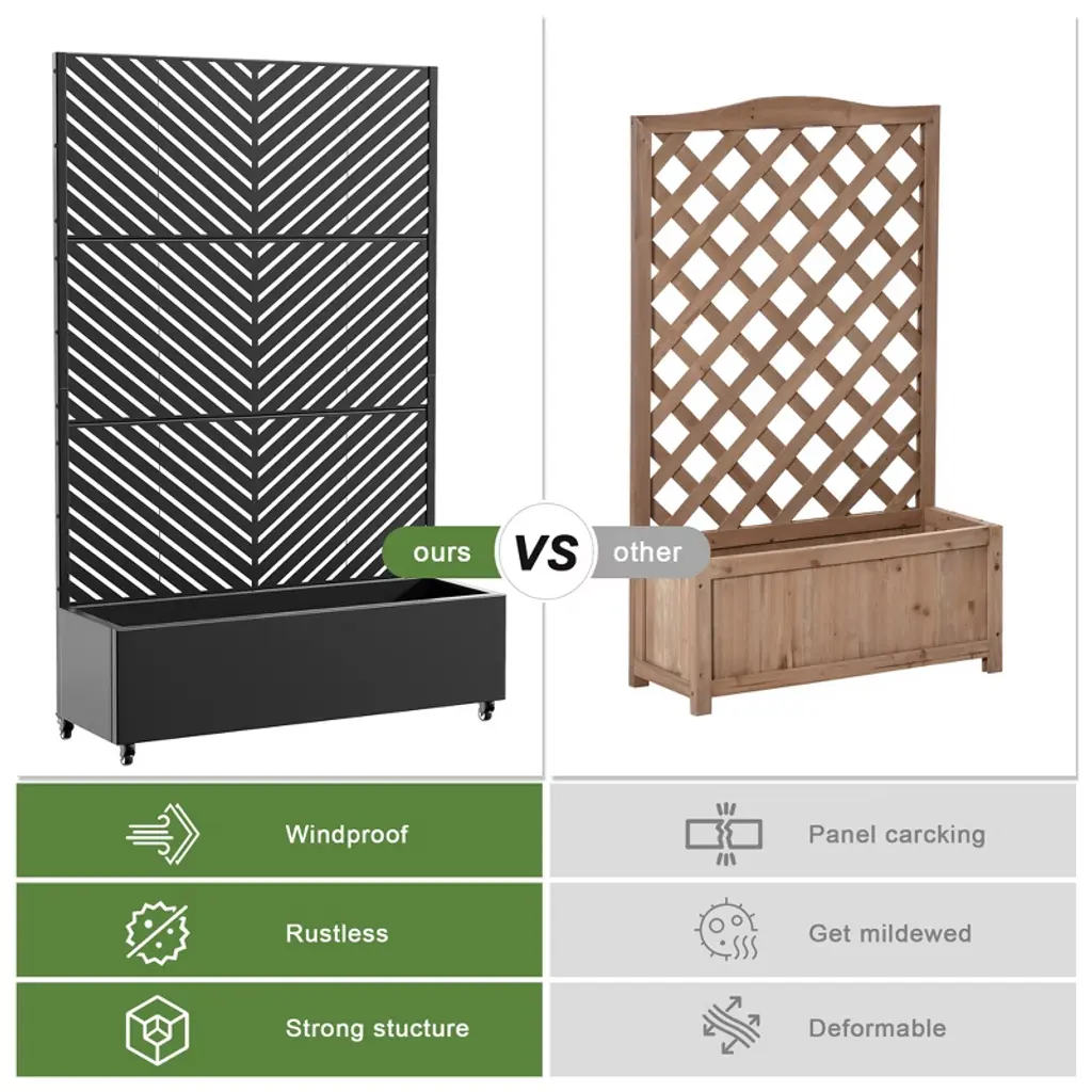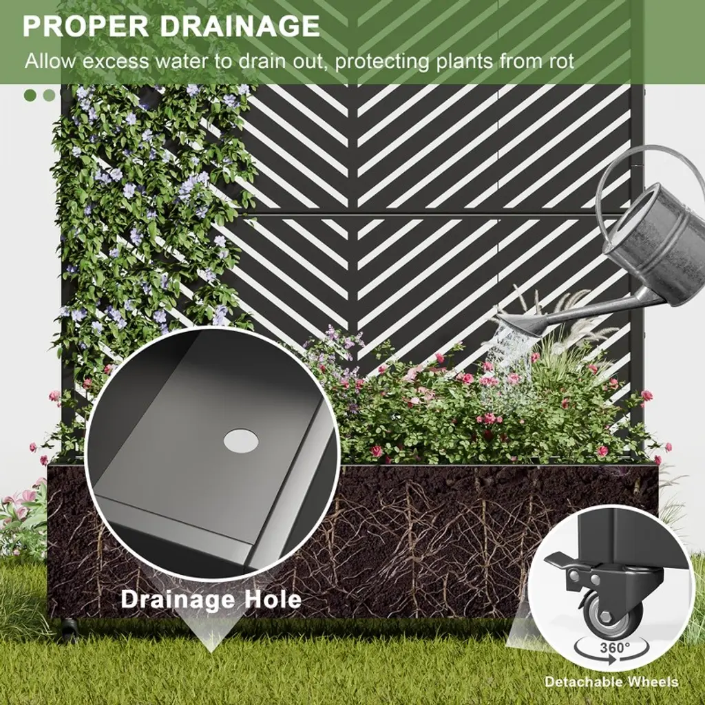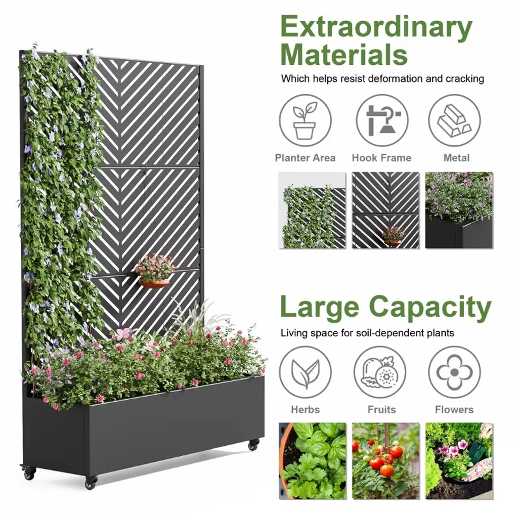 Introducing the Metal Planter Box with Trellis Raised Garden Bed with Arbor Privacy Screen with Wheels - the ultimate solution for creating a beautiful and functional outdoor or indoor space. This versatile garden bed combines the elegance of a trellis with the practicality of a raised bed. It also can be a perfect choice as a privacy screen when creating more beauty for your home.