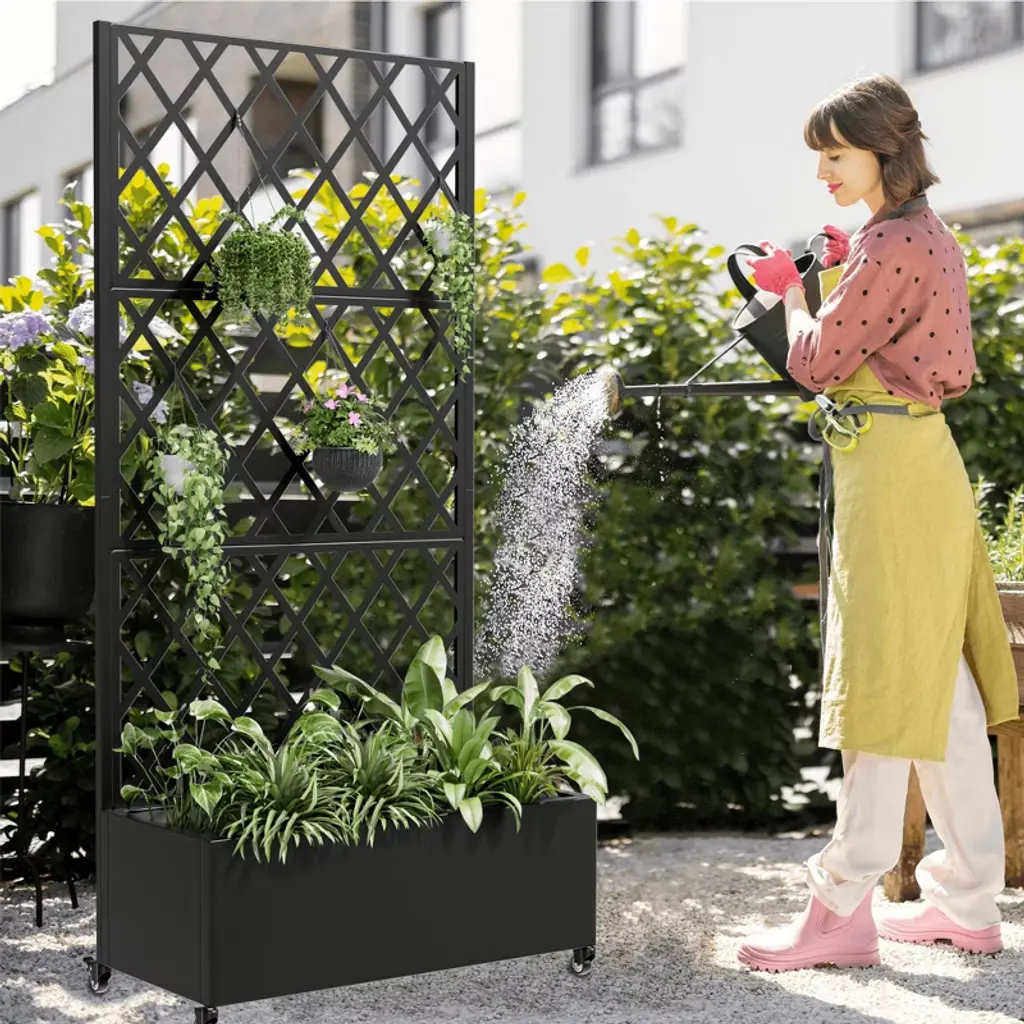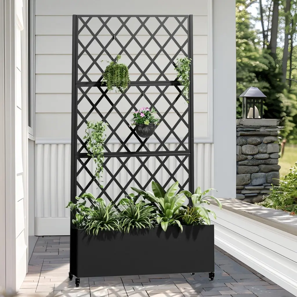 Wooakway 72"h Black Rectangle Metal Planter Box With Trellis Raised Garden Bed With Arbor Privacy Screen With Wheels