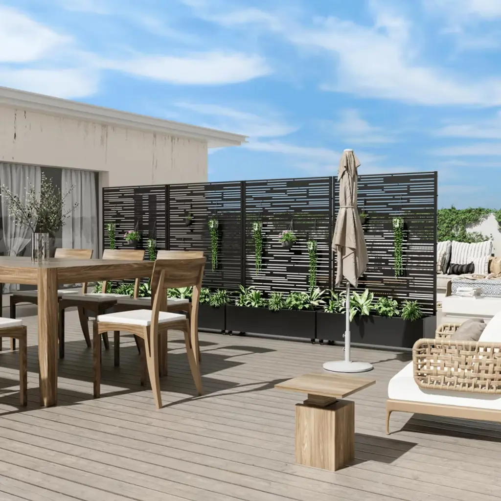 This modern outdoor planters features a geometric cut-out design that combines visual elegance with functional ventilation for healthy plant growth. Designed with practicality in mind, they are equipped with sturdy wheels at the base for effortless mobility. Ideal for flexible placement on balconies, terraces, or patios, they seamlessly blend form and function in any outdoor setting.