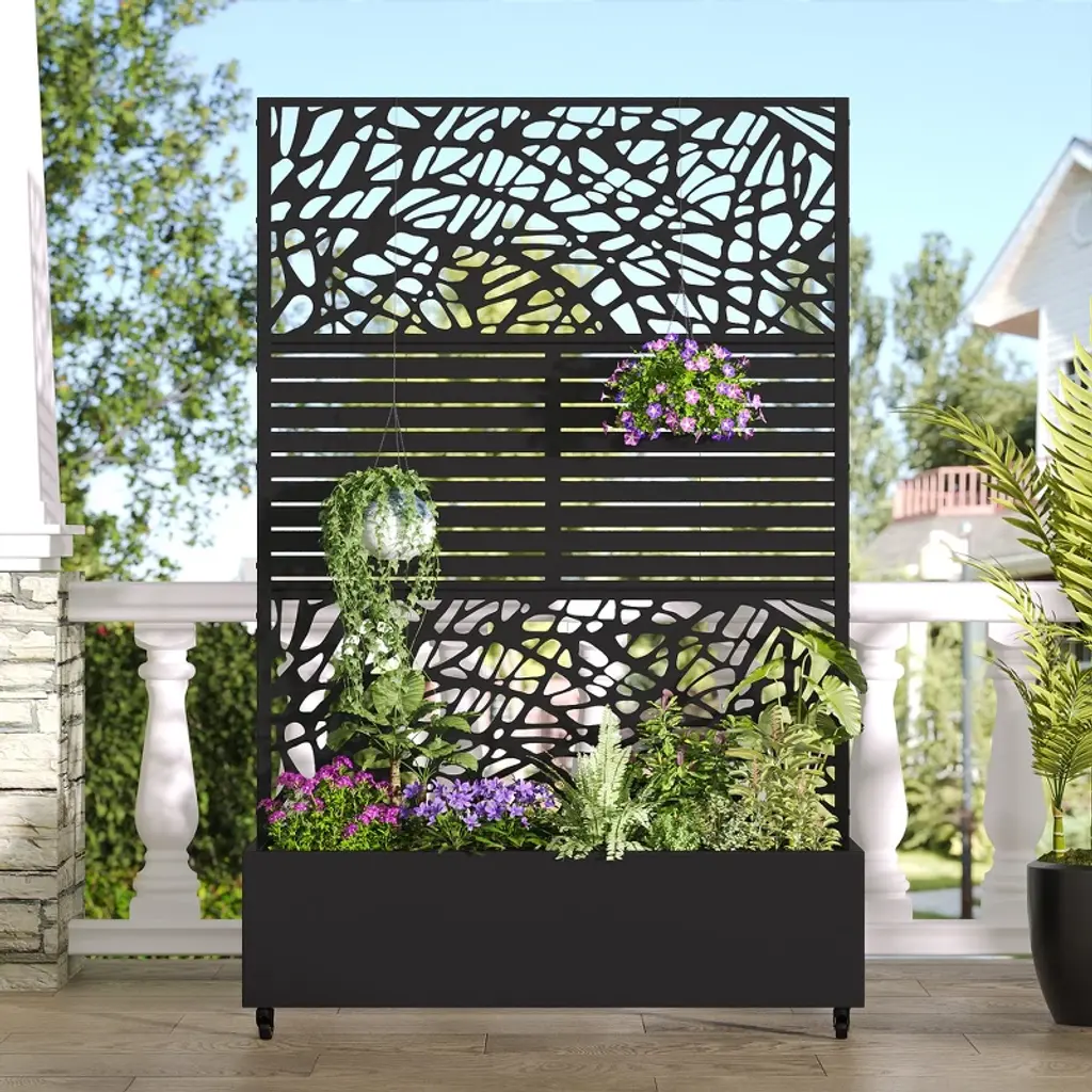 Wooakway 72"h*47"w Two-tone Patio Planter Box With Trellis Metal Raised Garden Bed Black Decorative Privacy Screen With Wheels