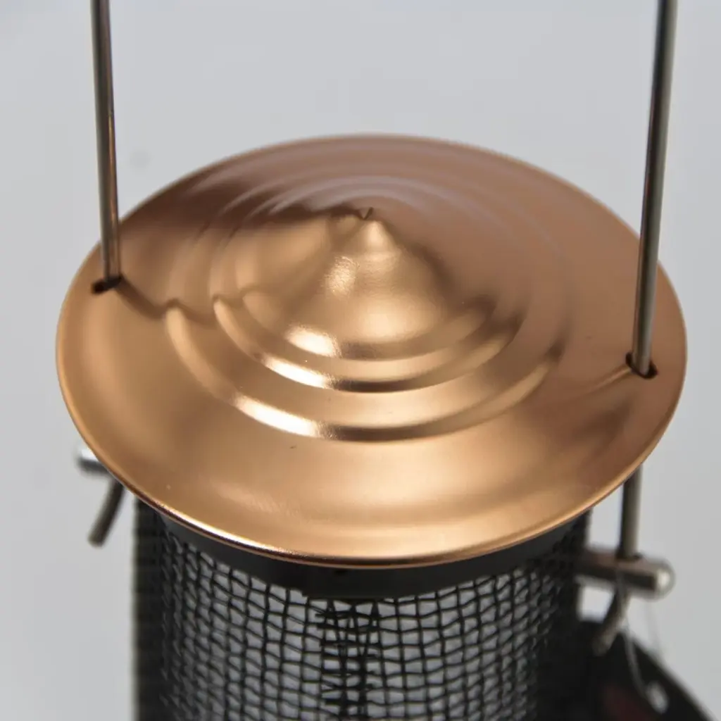 The Woodlink Copper Thistle Mini Tube Screen Feeder invites clinging birds to dine on their favorite thistle. Copper colored roof and base enhance this beautiful wire mesh cage feeder with no open ports so seed is protected from scattering. The fine screen spacing of the steel mesh provides a sturdy structure and offers plenty of room for smaller birds to cling. Holding 0.5 lbs of thistle seed, it is easy to fill and clean by sliding the metal roof up the included hanger. Fully assembled, this feeder may be hung using the included metal hanger from any hook or small branch.