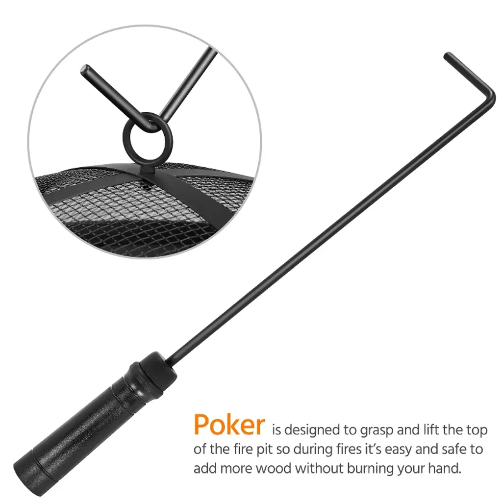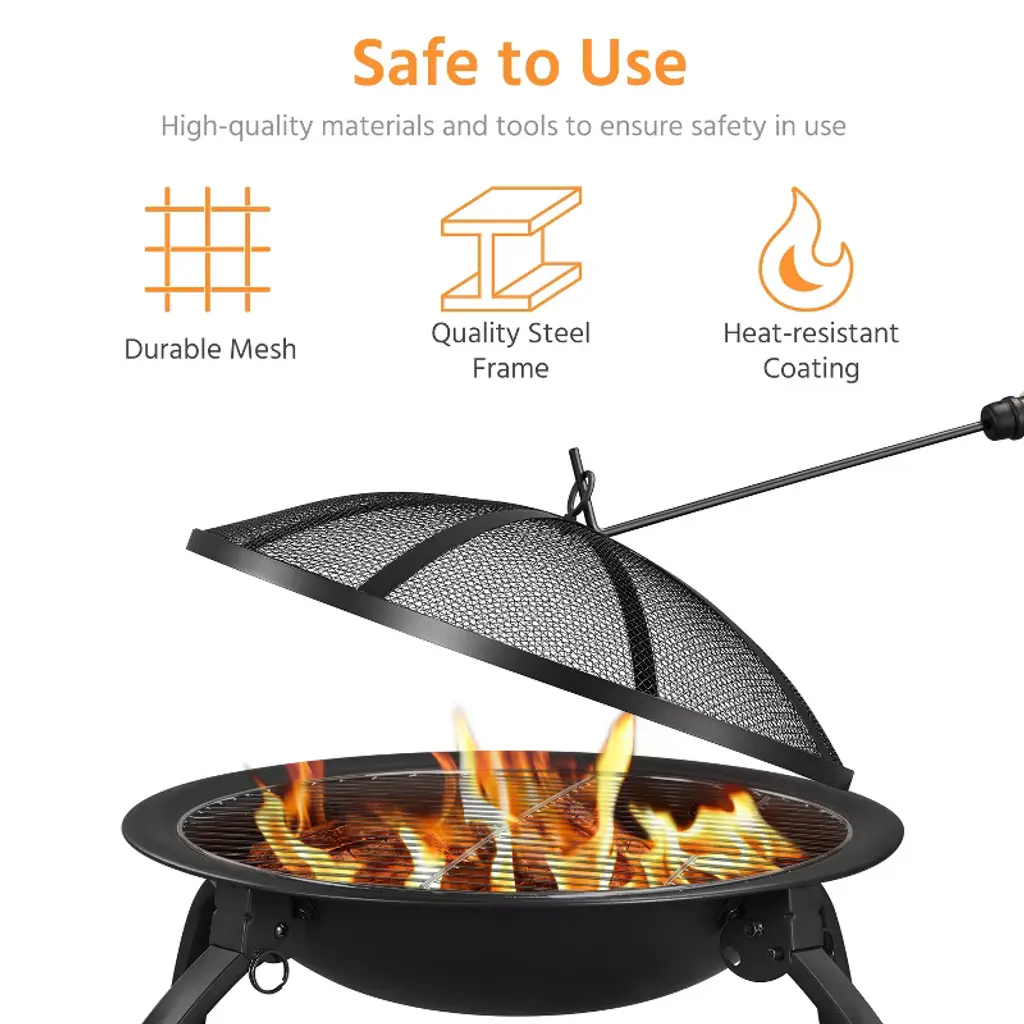This outdoor fire pit is fully equipped with dual grates, one for wood burning and the other for cooking. Also, it comes with a mesh lid, a fire poker, a carrying bag, 4 supports, and matching accessories. Thoughtfully designed and ironed material, the four foldable sturdy legs securely attach to the fire bowl to provide much stability, and no tools are required. When not in use, the legs can be collapsible for easy storage and transportation. No matter for warmth or BBQ, this round iron firepit can always meet your needs. * Specifications: Material: Iron with high-heat paintColor: BlackOverall size: 21 x 15.5inch (Dia. x H)Max. weight capacity: fire bowl, 22lb; grill, 5.5lbThe size of the gills: 19 and 13inchThe size of the fire bowl: 20 x 9.4inch (Dia. x H)Poker length: 17.7inch Please see the image for exact measurements.Safety Tips: Please use this fire pit on non-combustible surfaces such as cement ground, rocks, or sand for your safety. Please don't use it on lawns, wooden decks, or in any enclosed room.