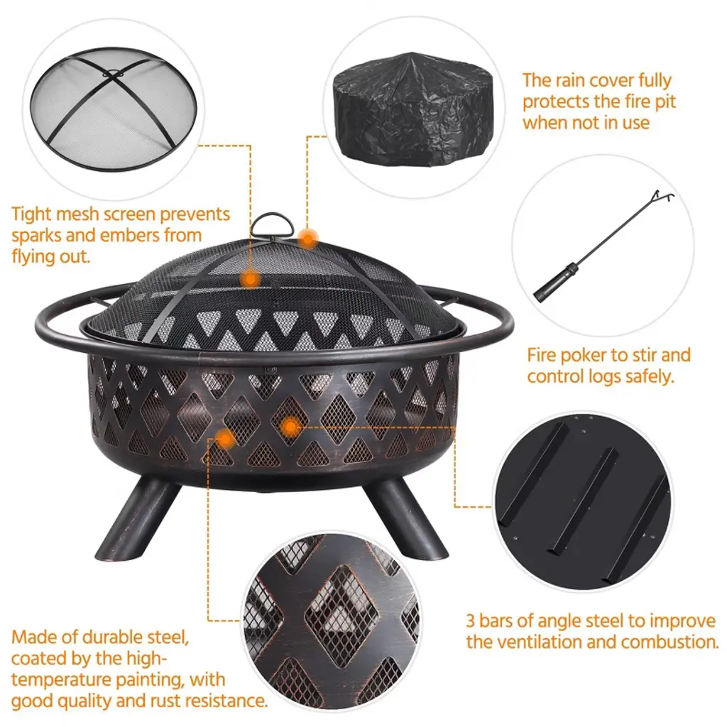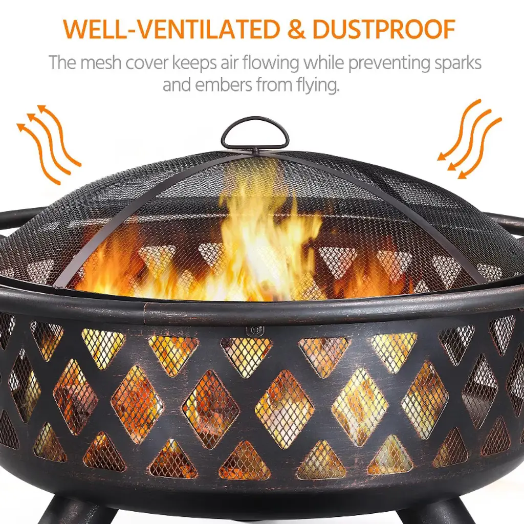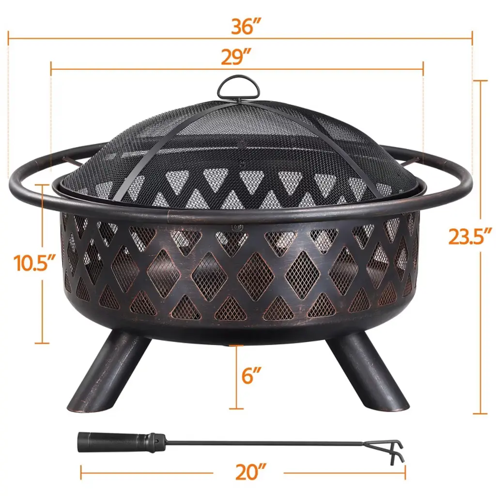 With this metal fire pit, things get warmer and families get happier around it. This round firepit is made from iron with a rust-resistant coating. Featuring the crossways pattern and wire mesh wall of the fire pit, this outside fireplace will match any style of house and garden. Plus, we have a fire poker, a mesh screen, a rain cover, and matching accessories along with the iron firepit for your convenience. It is easy to set them up following the matching accessories and manuals. * Specifications: Material: IronColor: BronzeOverall size: 23.5 x 36inch (Depth x Dia.) The size of the fire bowl: 10.2 x 29inch (Depth x Dia.)The length of the poker: 20"The bottom height: 6"Max. weight capacity of the fire bowl: 33lb Please see the image for exact measurements.Safety Tips: Please use this fire pit on non-combustible surfaces such as cement ground, rocks, or sand for your safety. Please don't use it on lawns, wooden decks, or in any enclosed room.