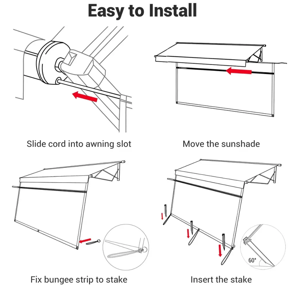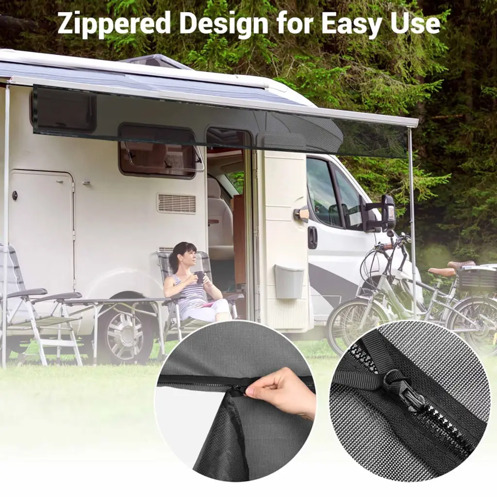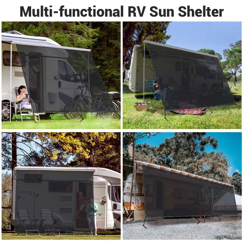 Features:- Multi-functional RV Sun Shelter - 6x15 ft RV Awning Sun Shade keeps direct sunlight away from your RV side & lower the temperature, providing you a cooler & cozier shade & daytime privacy for outdoor camping, picnics, road trips, sports events, fits most awning brands such as Dometic (A&E), Carefree, Lippert, Fiamma, Solera, etc.- Zippered Design for Convenience - Comes with a large zipper on the upper part, you can unzip the lower portion of sun shade and retract awning with the upper portion attached, save your time for next use- UV Protection & Mesh Design - Sun shade features UV protection to blocks up to 85% sun rays, effectively protect your delicate skin and eyes from dazzling sun; Fade resistance to keep original color lasting; Breathable mesh screen ensures sufficient airflow to avoid sultriness and also not blocking your view- Durable Material - Vinyl coated polyester fabric with knitted construction, strong enough to resist abrasion, tearing and fraying for up to 3-year use, suitable for damp climate- Easy to Install - Easy installation within minutes by sliding the cord into awning slot and moving the sun shade, with ground stake provided for fixating the sun shade stably into groundSpecifications:- Overall Dimension(LxW): 6 x 15 ft (182.9 x 457.2 cm)- Material: Vinyl Coated Polyester- Net Weight: 5.5 Lbs (2.5 kg)Package Contents:- 1x RV Sun Shade- 1x Carrying Bag- 4x Stakes- 4x Bungee Cords- 1x ManualNotice: - Please measure the length of your RV awning before purchasing the sun shade.