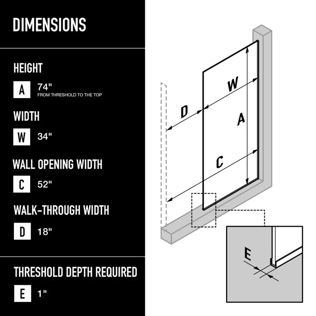 Zenith 34" W X 74" H Fixed Frameless Shower Screen With 3/8" Glass
