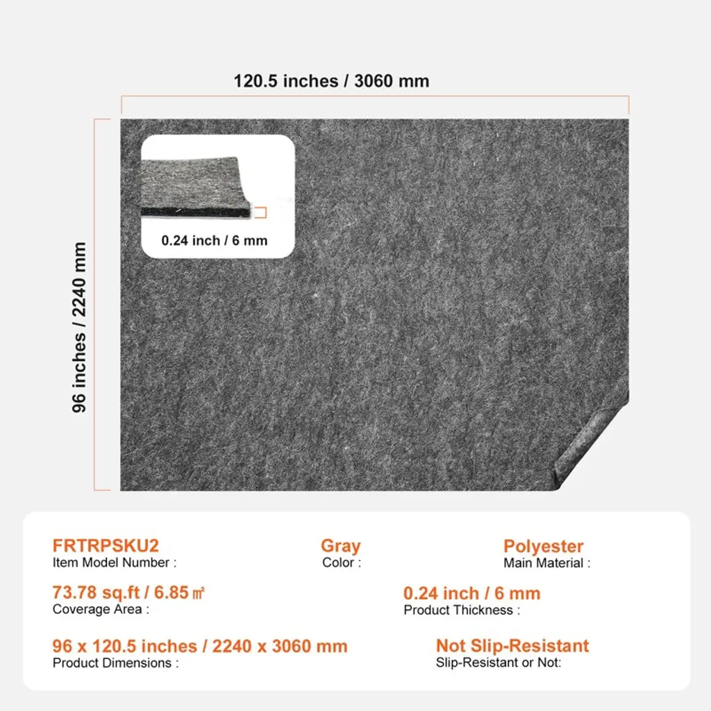 Feature: Thick and Comfortable: This carpet pad features a thickness of 0.24'' (6mm), providing excellent cushioning and shock absorption to protect your floors from damage. The ultra-long, dense pile offers an ultimate soft and resilient experience. High-Quality Polyester: Made from highly breathable polyester, it boasts outstanding resistance to foot traffic and friction, while being moisture-resistant and breathable. Durable, easy to clean and maintain, it resists pilling, keeping it looking new for a long time. Neatly Cut Edges: The carpet padding is ready to use upon arrival, with neatly cut edges to prevent fraying. The clean, intact cross-section lays flat on the floor, providing an excellent look and easy usage. Perfect Coverage: With a coverage area of 73.78 sq.ft / 6.85㎡, this rug cushion easily meets the carpet needs of your room, significantly enhancing your home environment. Large area protection increases comfort, creating a cozy experience for spacious areas. Low Allergen: This area rug pad features a pure polyester felt surface, free from latex or additional anti-slip components, making it ideal for sensitive users. It ensures comfort and safety while also protecting your floors and carpets. Package Content: Carpet Rug Pad x 1 User Manual x 1