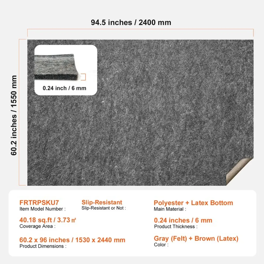 Feature: Thick and Comfortable: This carpet pad features a thickness of 0.24'' (6mm), providing excellent cushioning and shock absorption to protect your floors from damage. The ultra-long, dense pile offers an ultimate soft and resilient experience. Dual Surface - Slip-Resistant : The bottom features anti-slip latex for a strong grip, ensuring the rug stays in place. The dense felt surface effectively protects your carpet and prevents slipping, providing a safe and stable experience. High-Quality Polyester: Made from highly breathable polyester, it offers excellent resistance to foot traffic and friction while being moisture-resistant. Durable and easy to clean, it resists pilling, maintaining a like-new appearance over time. Neatly Cut Edges: The area rug pad arrives ready to use, with neatly cut edges that prevent fraying. The clean, intact cross-section lays flat on the floor, enhancing its appearance and convenience. Perfect Coverage: With a coverage area of 40.18 sq.ft / 3.73㎡, this rug cushion easily meets the carpet needs of your room, significantly enhancing your home environment. Large area protection increases comfort, creating a cozy experience for spacious areas. Package Content: Carpet Rug Pad x 1 User Manual x 1
