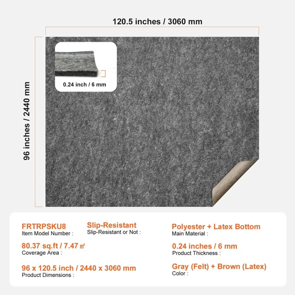 Feature: Thick and Comfortable: This carpet pad features a thickness of 0.24'' (6mm), providing excellent cushioning and shock absorption to protect your floors from damage. The ultra-long, dense pile offers an ultimate soft and resilient experience. Dual Surface - Slip-Resistant : The bottom features anti-slip latex for a strong grip, ensuring the rug stays in place. The dense felt surface effectively protects your carpet and prevents slipping, providing a safe and stable experience. High-Quality Polyester: Made from highly breathable polyester, it offers excellent resistance to foot traffic and friction while being moisture-resistant. Durable and easy to clean, it resists pilling, maintaining a like-new appearance over time. Neatly Cut Edges: The area rug pad arrives ready to use, with neatly cut edges that prevent fraying. The clean, intact cross-section lays flat on the floor, enhancing its appearance and convenience. Perfect Coverage: With a coverage area of 80.37 sq.ft / 7.47㎡, this rug cushion easily meets the carpet needs of your room, significantly enhancing your home environment. Large area protection increases comfort, creating a cozy experience for spacious areas. Package Content: Carpet Rug Pad x 1 User Manual x 1