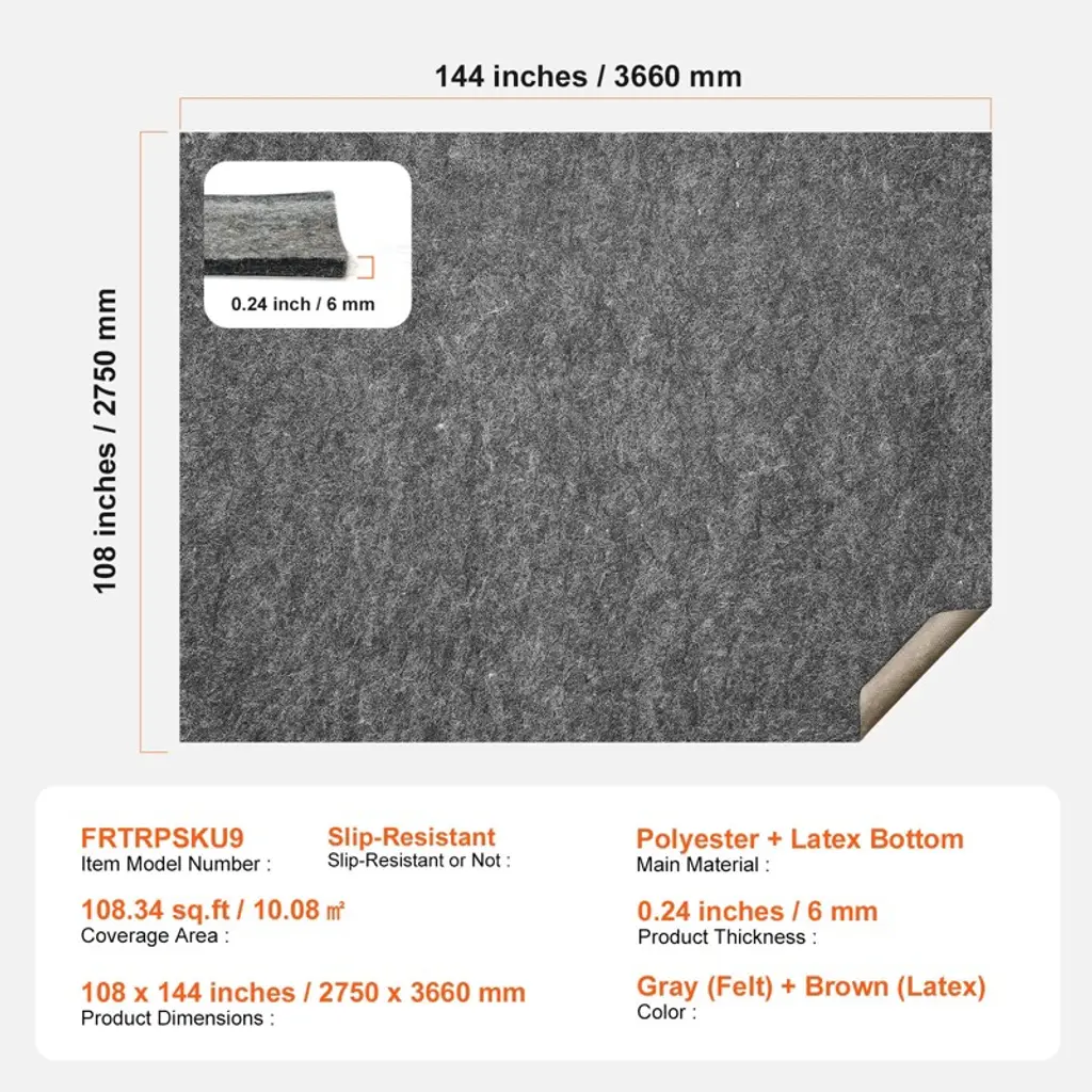 Feature: Thick and Comfortable: This carpet pad features a thickness of 0.24'' (6mm), providing excellent cushioning and shock absorption to protect your floors from damage. The ultra-long, dense pile offers an ultimate soft and resilient experience. Dual Surface - Slip-Resistant : The bottom features anti-slip latex for a strong grip, ensuring the rug stays in place. The dense felt surface effectively protects your carpet and prevents slipping, providing a safe and stable experience. High-Quality Polyester: Made from highly breathable polyester, it offers excellent resistance to foot traffic and friction while being moisture-resistant. Durable and easy to clean, it resists pilling, maintaining a like-new appearance over time. Neatly Cut Edges: The area rug pad arrives ready to use, with neatly cut edges that prevent fraying. The clean, intact cross-section lays flat on the floor, enhancing its appearance and convenience. Perfect Coverage: With a coverage area of 108.34 sq.ft / 10.08㎡, this rug cushion easily meets the carpet needs of your room, significantly enhancing your home environment. Large area protection increases comfort, creating a cozy experience for spacious areas. Package Content: Carpet Rug Pad x 1 User Manual x 1