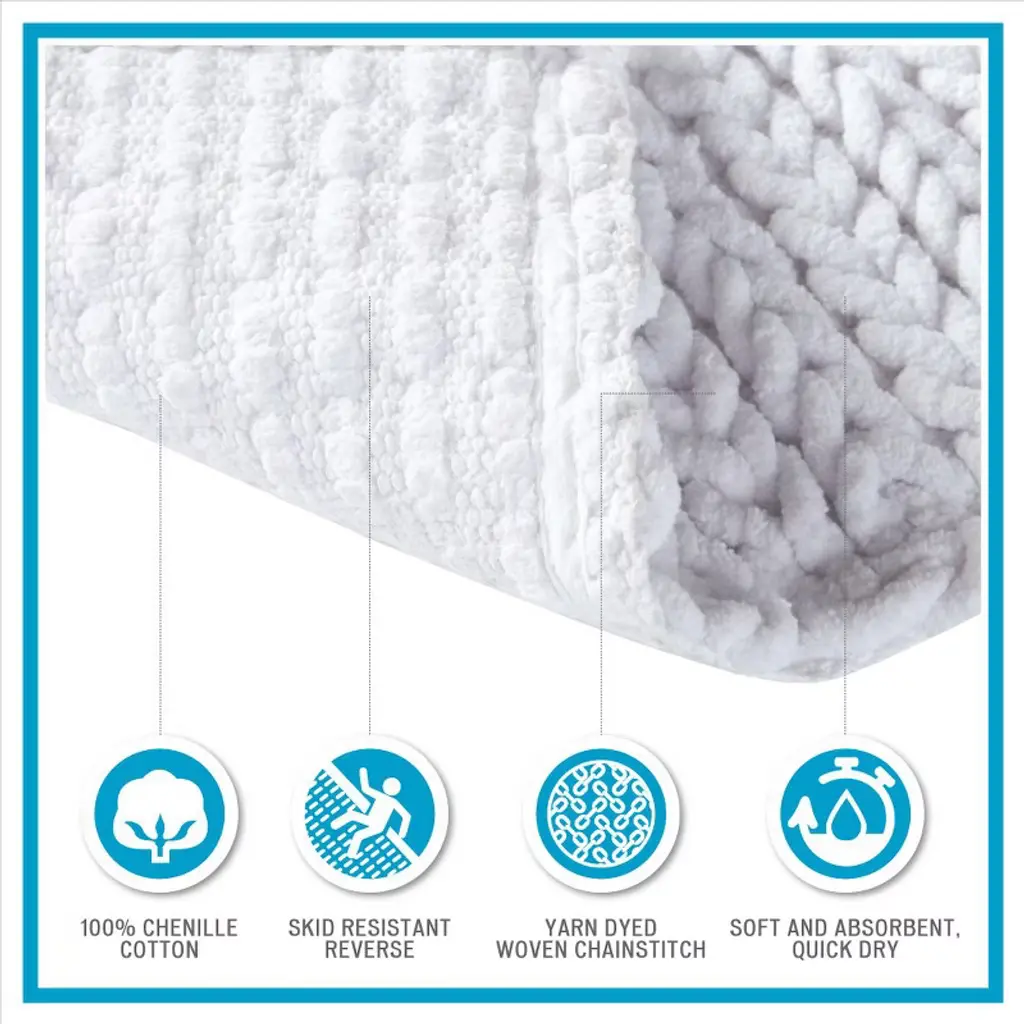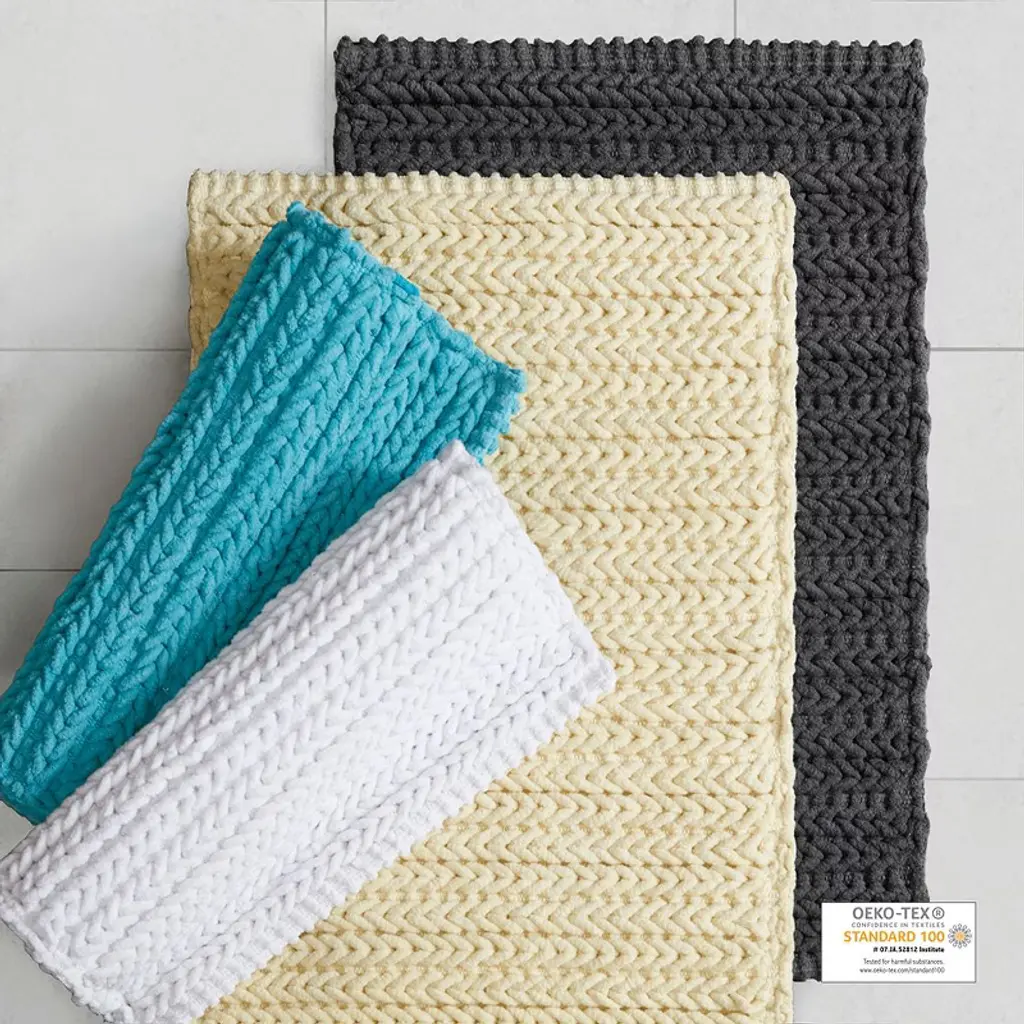 The Madison Park Lasso 100% Cotton Chenille Chain Stitch Rug provides a soft textural update to your bathroom decor. This cotton chenille bath rug features a woven chain stitch design that creates dimension and texture, for a fun and fresh update. Made from 100% piece-dyed cotton chenille each rug is incredibly soft, absorbent, quick dry, and fade resistant; while a non-skid transparent latex reverse helps keep rug in place throughout the day. This bath rug is also OEKO-TEX certified, meaning it does not contain any harmful substances or chemicals to ensure quality comfort and wellness. Machine washable for easy care, this bath rug collection comes in a variety of colors and sizes to suit any bathroom decor and size. Complete the look with the coordinating Madison Park Breeze Bath Towel Set!