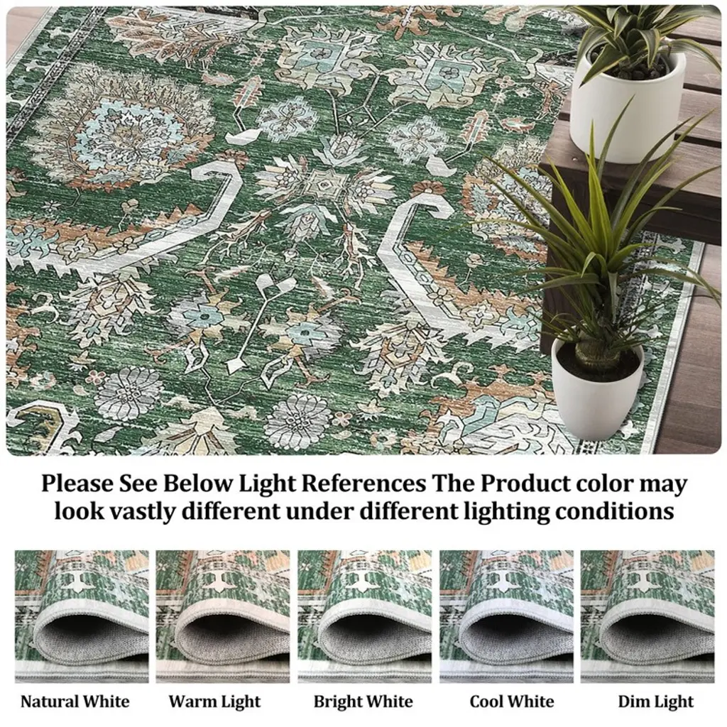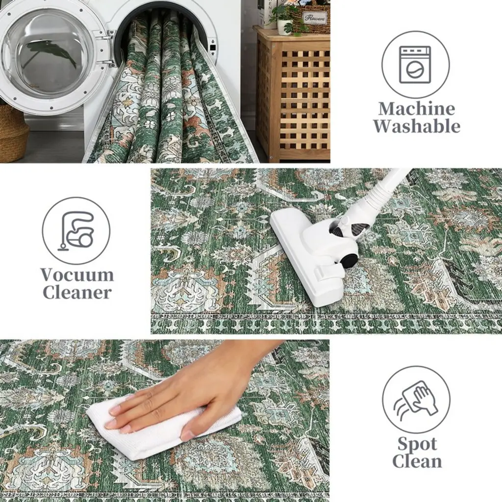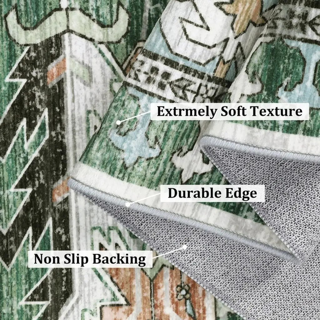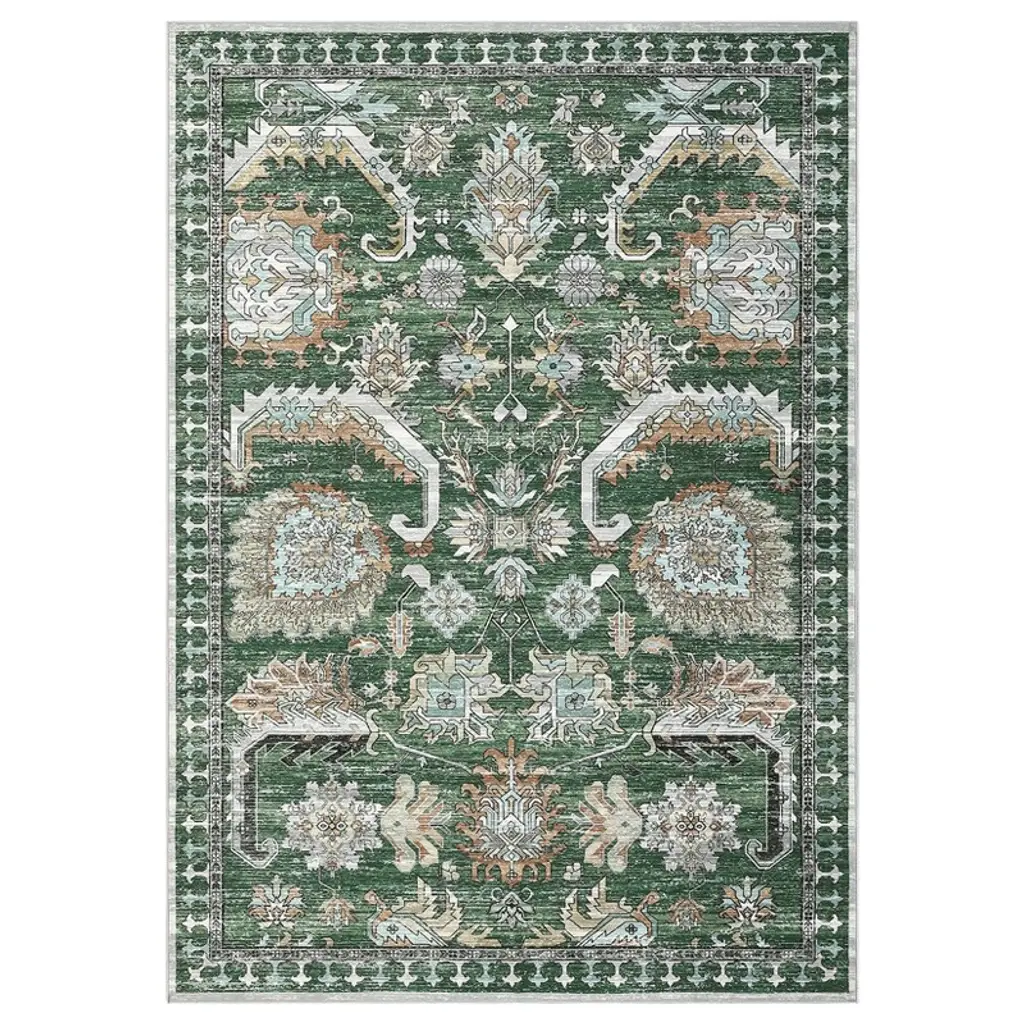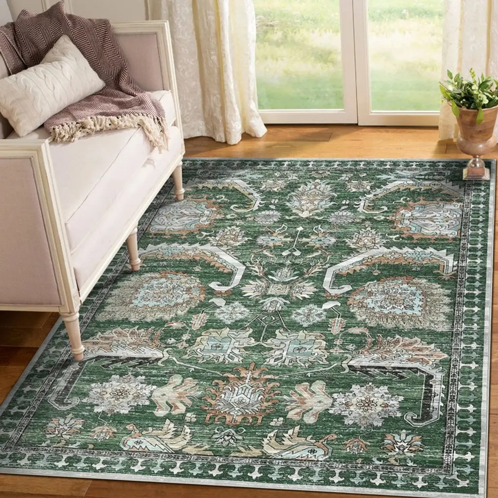 Enhance your home with the vintage distressed area rug, where intricate patterns meet timeless charm. This soft, washable rug adds warmth and character to any room, making it the perfect touch for your living space. Highlights at a glance:Vintage intricate patterns add a timeless charm, enhancing decor with a retro flair.Soft texture ensures comfort underfoot, making it perfect for any living space.Non-slip TPR backing provides safety and stability, reducing the risk of slips.Low pile thickness ensures easy clearance for doors and furniture placement.Washable and spot-cleanable for hassle-free care, keeping your rug looking fresh and vibrant.Tightly woven construction ensures no shedding or fading, guaranteeing long-lasting beauty and quality. Specification:Size: 5x7 / 6x9 / 8x10 / 9x12 / 10x13 ftColor: green / grey / blackMaterial: polyester fibre+textured TPRApplication: living room/bedroom/dining room/kids room/playroom/office/kitchen/farmhouse/floor/laundry Friendly note:Upon receiving the vintage area rug, please unfold it. Initial creases may appear, but don't worry; they will smooth out after a few days. Care instructions:Can be hand washed or machine washed in cold water.Recommend spot cleaning for minor spills.Support vacuum cleaner and robot vacuum.Use mild detergent. Packing list:Area rug x1
