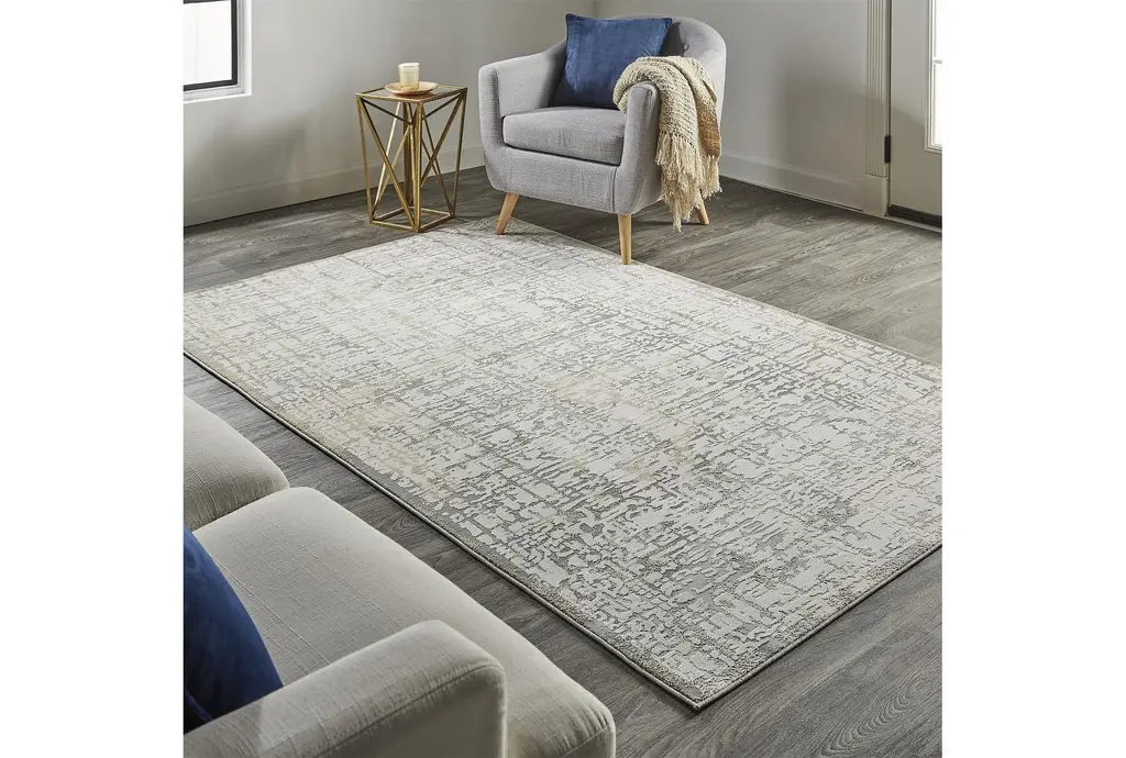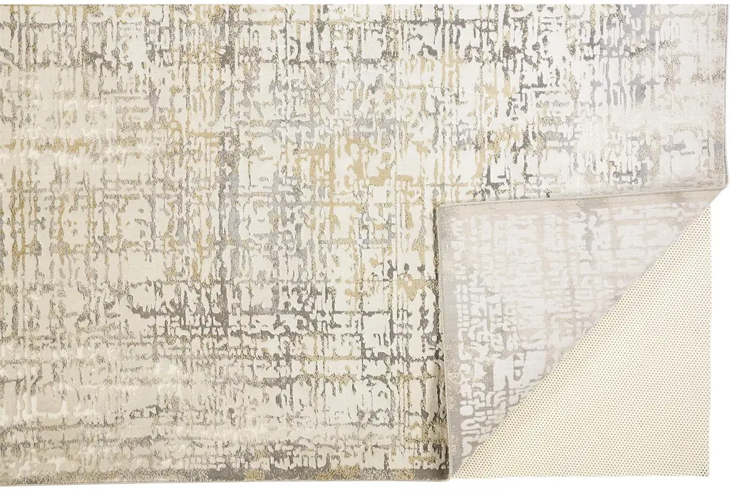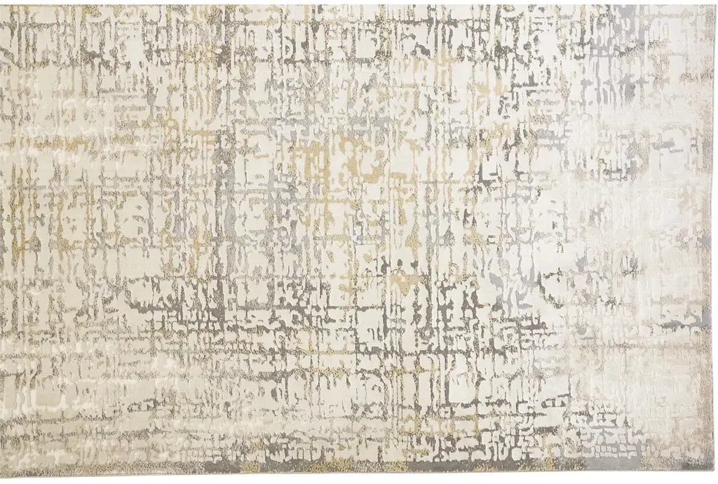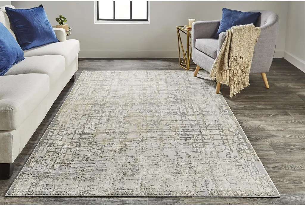 The 10'x13'1" Rug-Faded Grid Grey/Gold is a versatile addition to your home decor. This contemporary rug features an abstract design in a soft grey and gold color palette, perfect for layering in any room. Its low pile makes it suitable for high-traffic areas, ensuring durability and ease of maintenance.