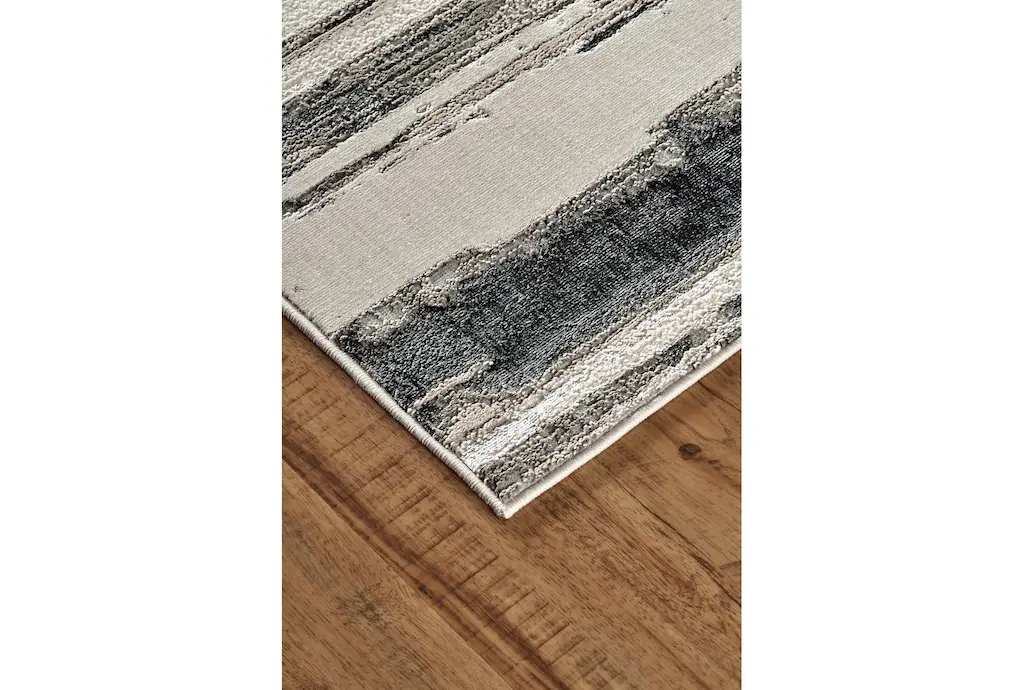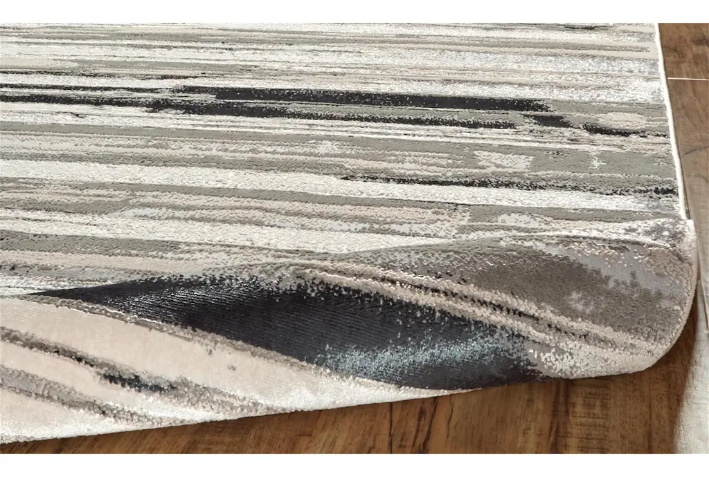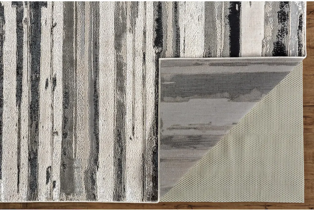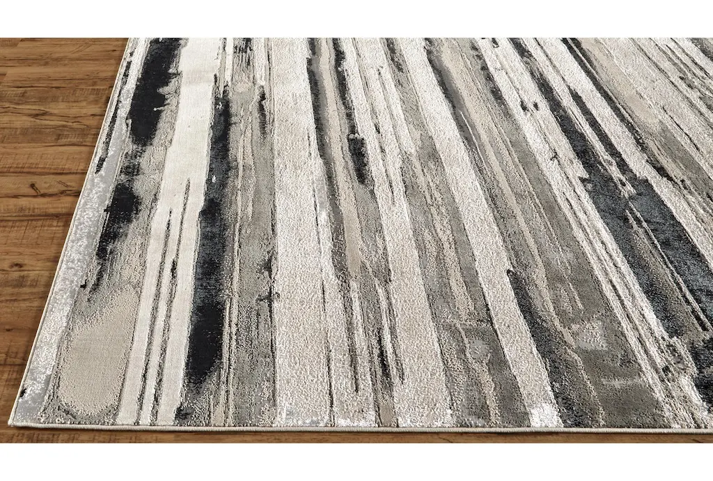 Enhance your living space with the 10'x13'1" Rug featuring silver metallic and black horizontal lines. This casual, abstract rug showcases a stunning blend of colors perfect for any indoor setting. The low pile design ensures easy maintenance and adds a modern touch to any room.