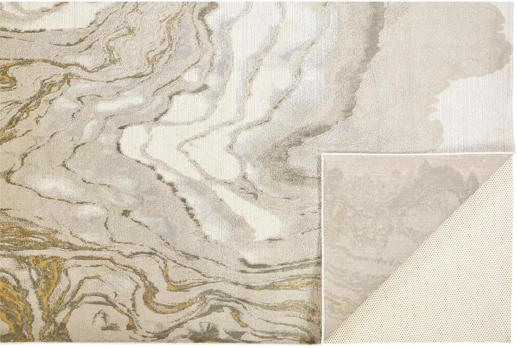 Bring a touch of contemporary style to your living space with the 10'x13'1" Rug-Tidal Impressions in Ivory/Gold. This abstract low pile area rug provides a soft and inviting feel underfoot, perfect for any indoor setting. Its unique color palette and design make it an eye-catching addition to your home decor.