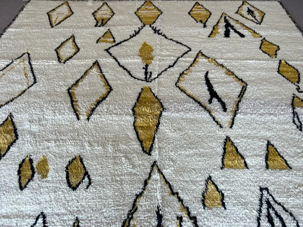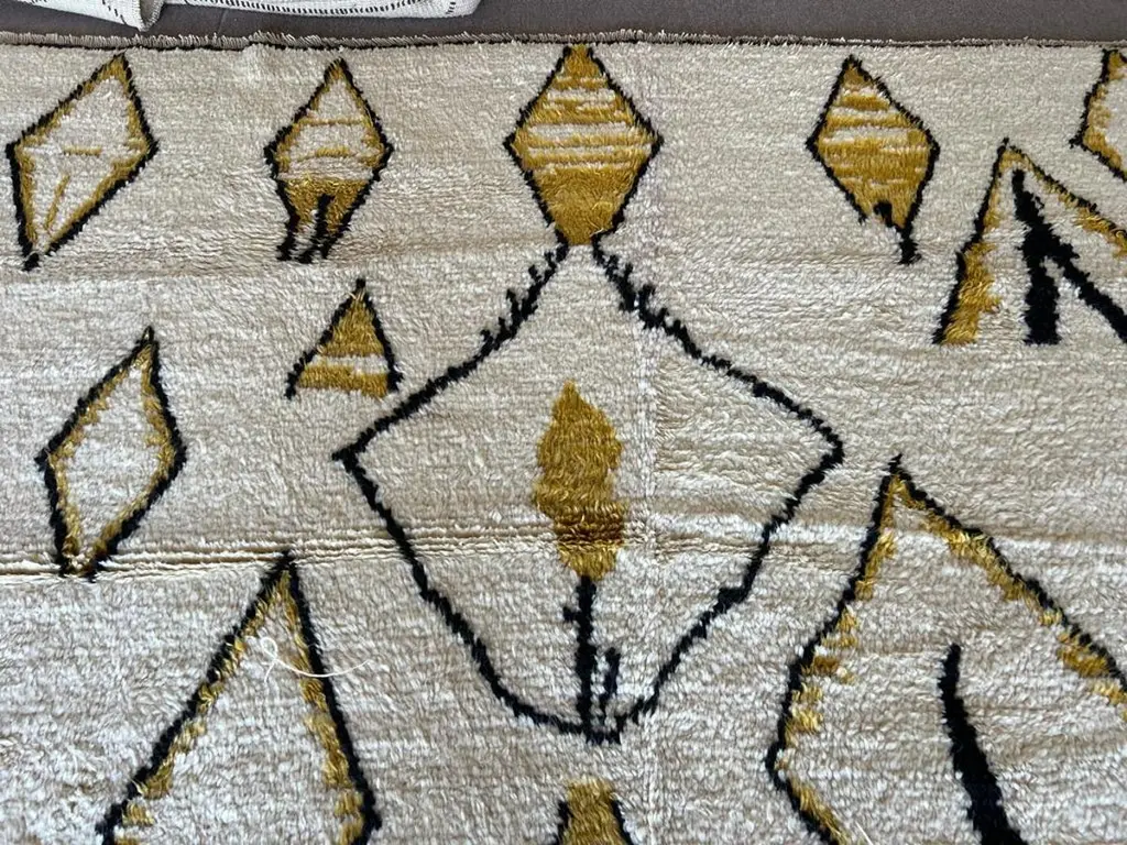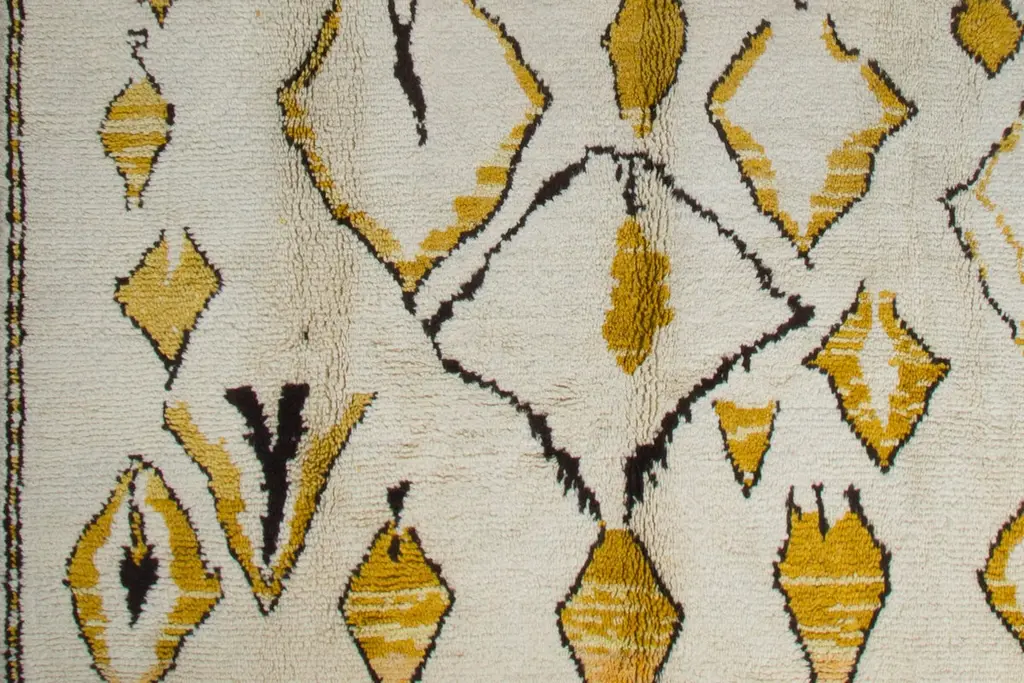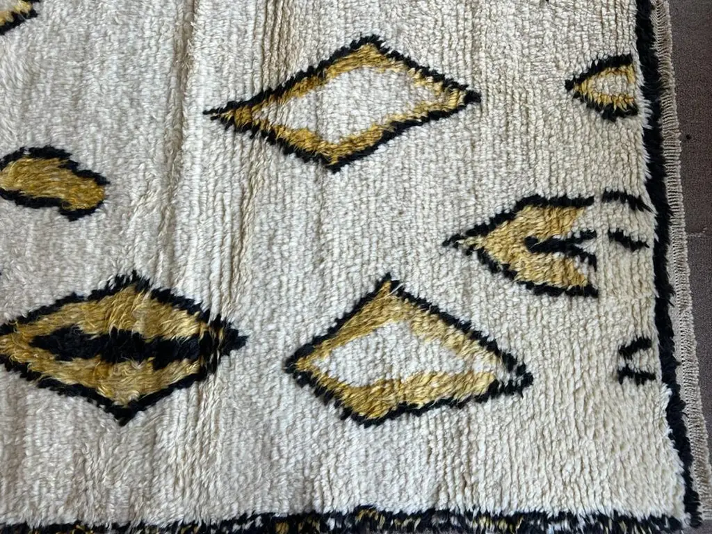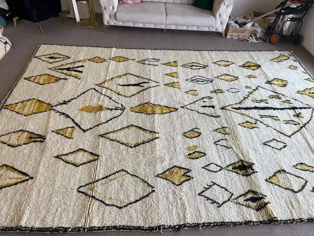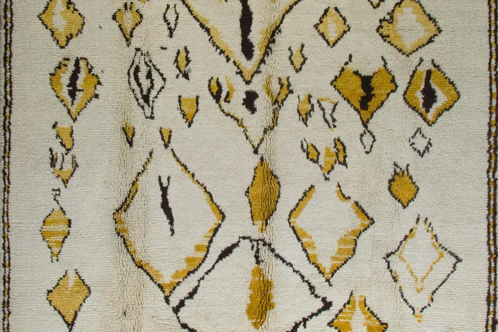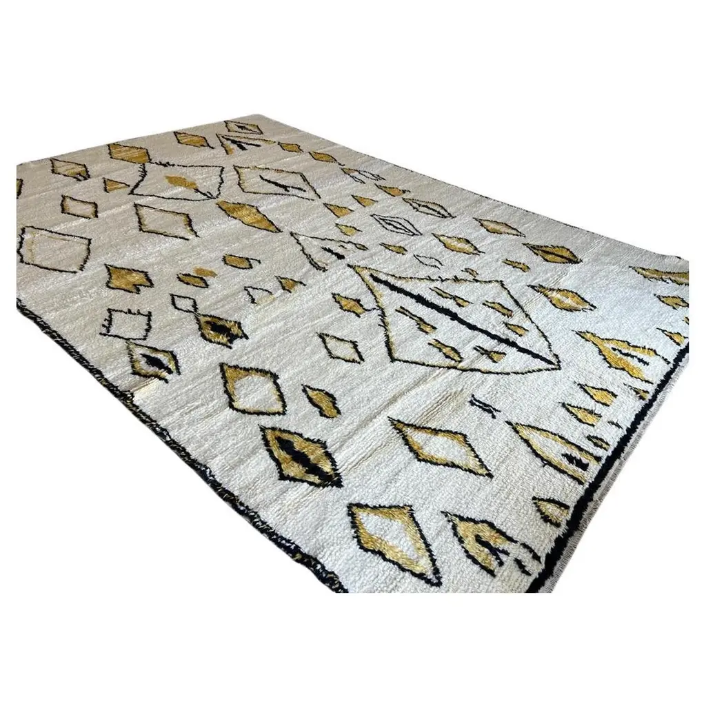 This 10x14 ft hand-knotted Moroccan-style rug is a contemporary piece inspired by the timeless Berber weaving traditions of North Africa. Handmade by our master weavers in Turkey, it is crafted entirely from 100% wool on a wool foundation, ensuring durability, resilience, and a luxuriously soft feel underfoot.The rug features a striking ivory background highlighted with bold geometric diamond and lozenge motifs in golden yellow and deep black. This modern interpretation of a classic Moroccan Beni Ourain design makes it both a statement piece and a versatile foundation for contemporary living. Its large scale is ideal for anchoring a living room, dining room, or bedroom while creating warmth and character.Every detail reflects artisanal craftsmanship — from the carefully hand-knotted pile to the natural wool texture that adds depth and dimension. Unlike mass-produced rugs, this piece combines traditional weaving expertise with a modern color palette, making it truly one of a kind.Custom Production:This design can also be custom produced in any size, color combination, or pattern variation within approximately 4-6 weeks. Perfect for interior designers, architects, and collectors seeking bespoke handmade rugs tailored to their projects.Styling Notes:The bold diamond motifs and golden tones allow this rug to complement a wide range of interiors:•Modern & Contemporary homes seeking a vibrant yet elegant focal point•Mid-Century Modern interiors where geometric forms and organic textures harmonize•Bohemian & Eclectic spaces layered with natural fibers, woods, and textiles•Scandinavian & Minimalist designs needing a touch of warmth and artistic expression•Designer Interiors where unique handmade rugs anchor the room and elevate the overall aestheticThis rug is equally suited for designer projects, collector’s homes, or anyone seeking a statement handmade rug that blends modern design with timeless Moroccan heritage.