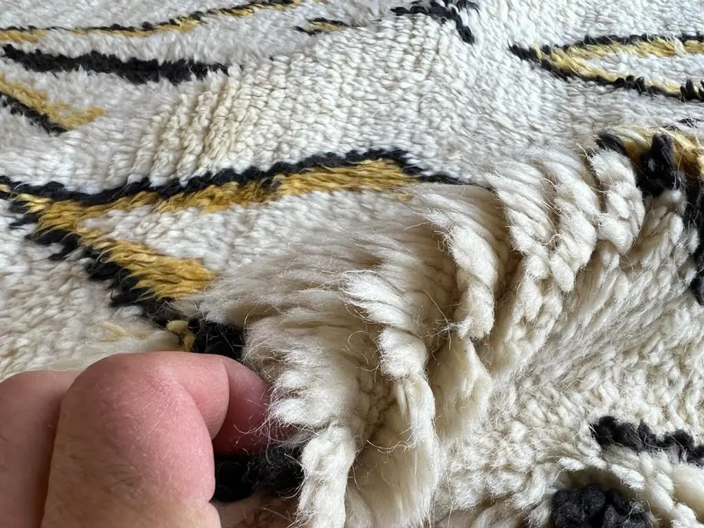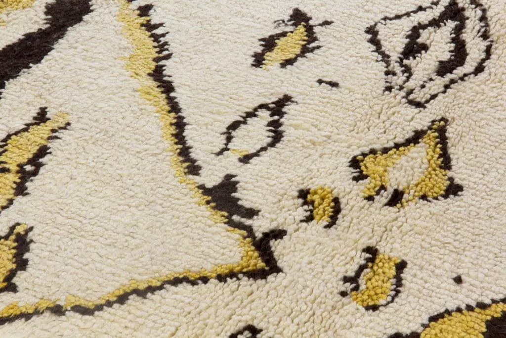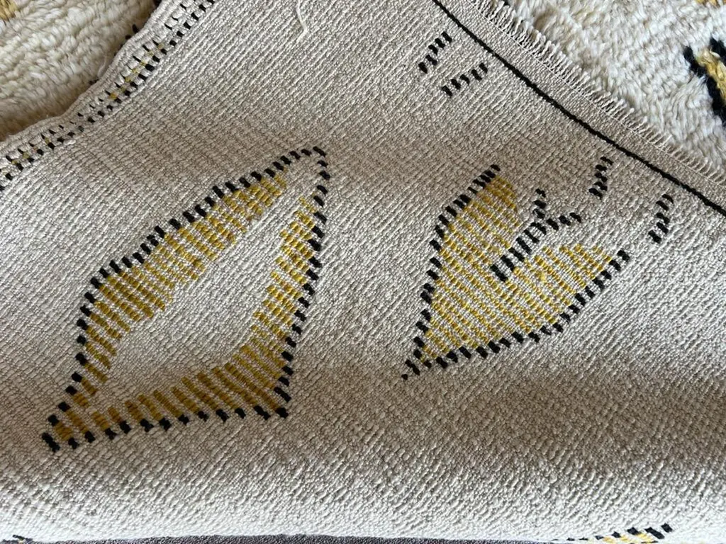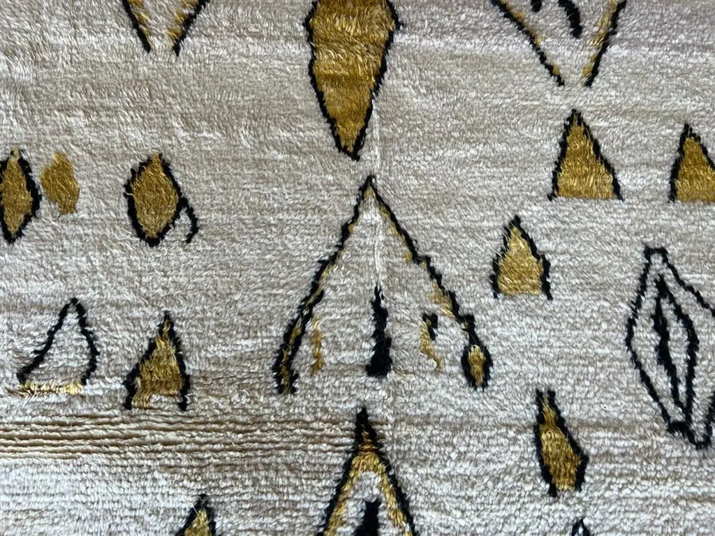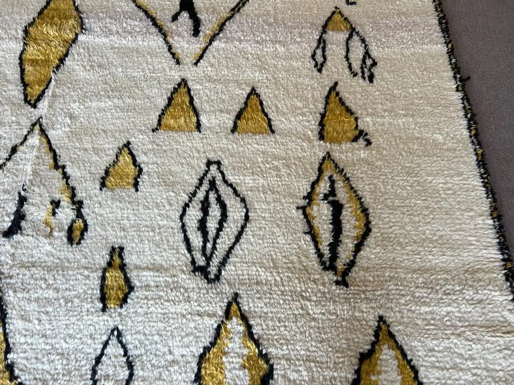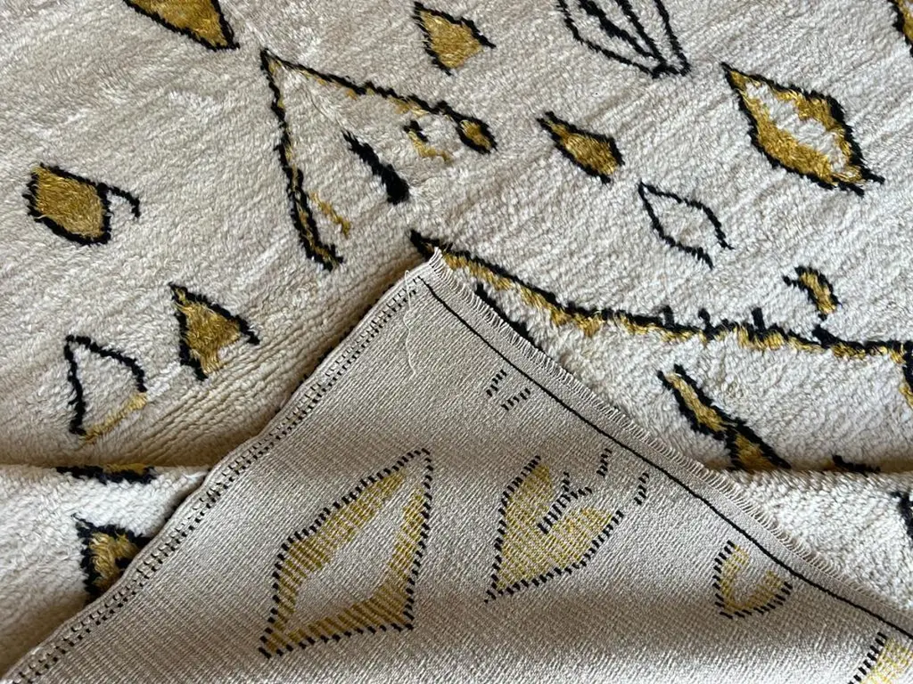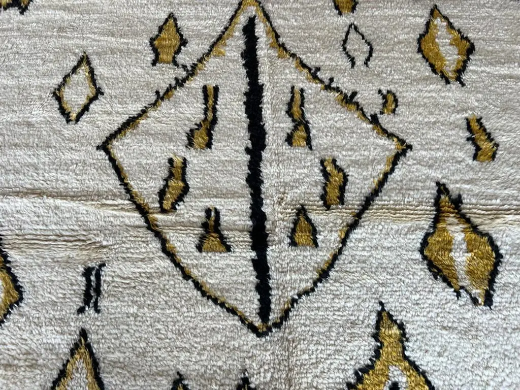 This 10x14 ft hand-knotted Moroccan-style rug is a contemporary piece inspired by the timeless Berber weaving traditions of North Africa. Handmade by our master weavers in Turkey, it is crafted entirely from 100% wool on a wool foundation, ensuring durability, resilience, and a luxuriously soft feel underfoot.The rug features a striking ivory background highlighted with bold geometric diamond and lozenge motifs in golden yellow and deep black. This modern interpretation of a classic Moroccan Beni Ourain design makes it both a statement piece and a versatile foundation for contemporary living. Its large scale is ideal for anchoring a living room, dining room, or bedroom while creating warmth and character.Every detail reflects artisanal craftsmanship — from the carefully hand-knotted pile to the natural wool texture that adds depth and dimension. Unlike mass-produced rugs, this piece combines traditional weaving expertise with a modern color palette, making it truly one of a kind.Custom Production:This design can also be custom produced in any size, color combination, or pattern variation within approximately 4-6 weeks. Perfect for interior designers, architects, and collectors seeking bespoke handmade rugs tailored to their projects.Styling Notes:The bold diamond motifs and golden tones allow this rug to complement a wide range of interiors:•Modern & Contemporary homes seeking a vibrant yet elegant focal point•Mid-Century Modern interiors where geometric forms and organic textures harmonize•Bohemian & Eclectic spaces layered with natural fibers, woods, and textiles•Scandinavian & Minimalist designs needing a touch of warmth and artistic expression•Designer Interiors where unique handmade rugs anchor the room and elevate the overall aestheticThis rug is equally suited for designer projects, collector’s homes, or anyone seeking a statement handmade rug that blends modern design with timeless Moroccan heritage.