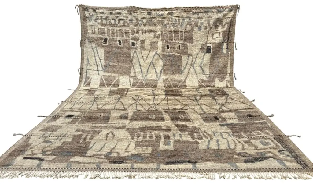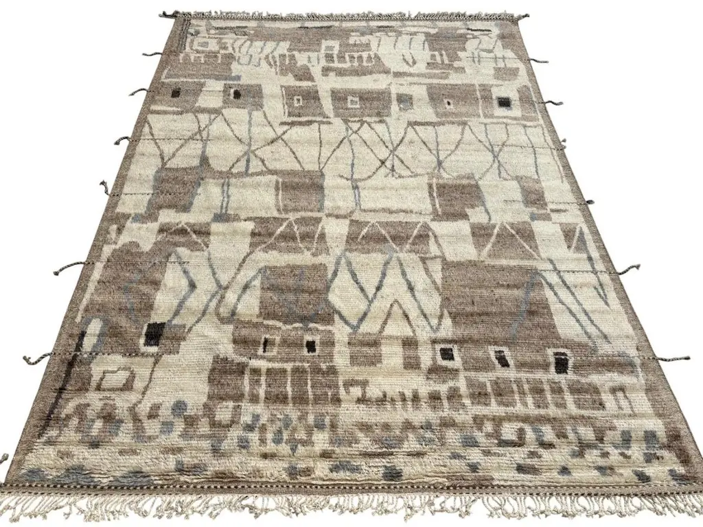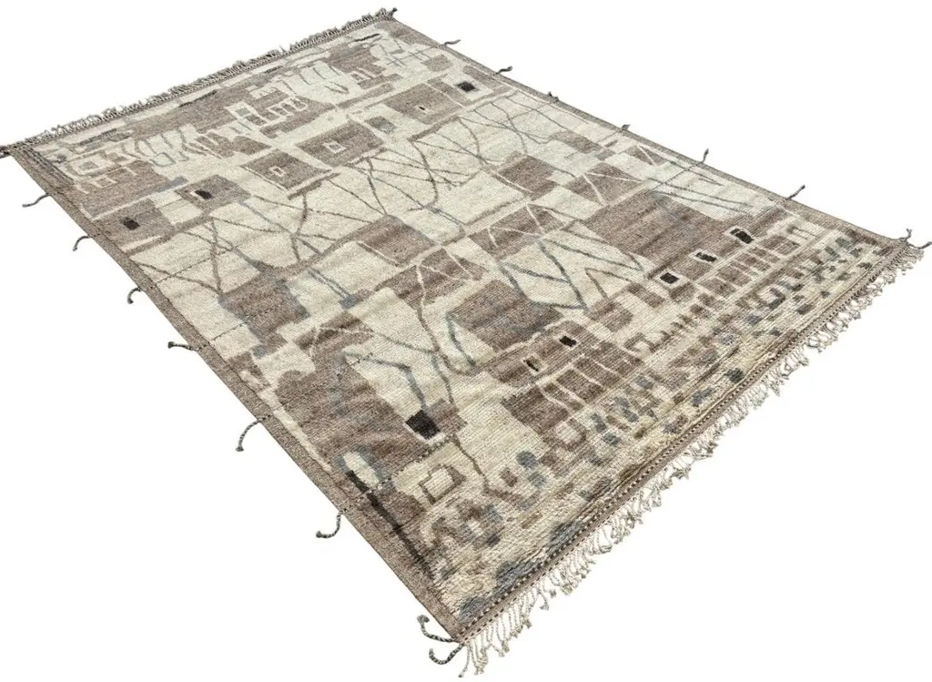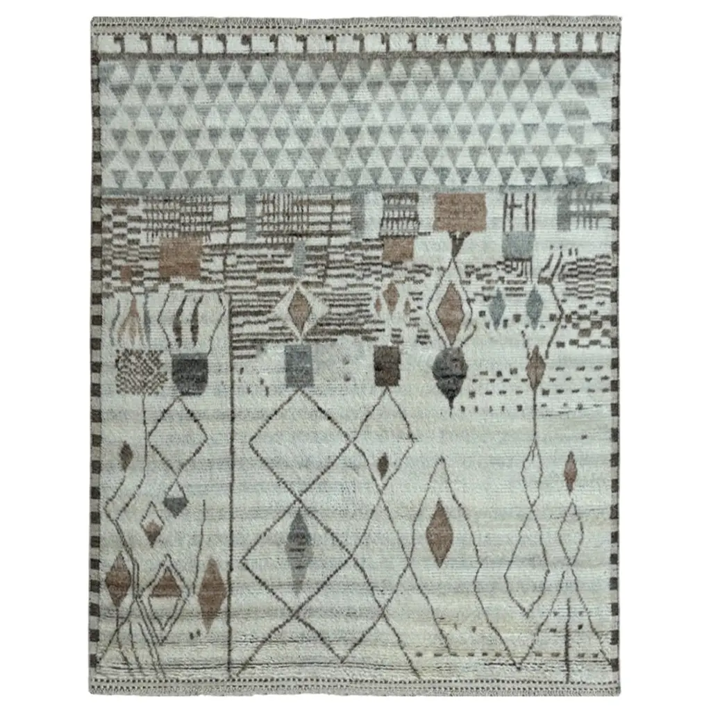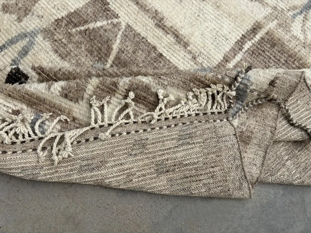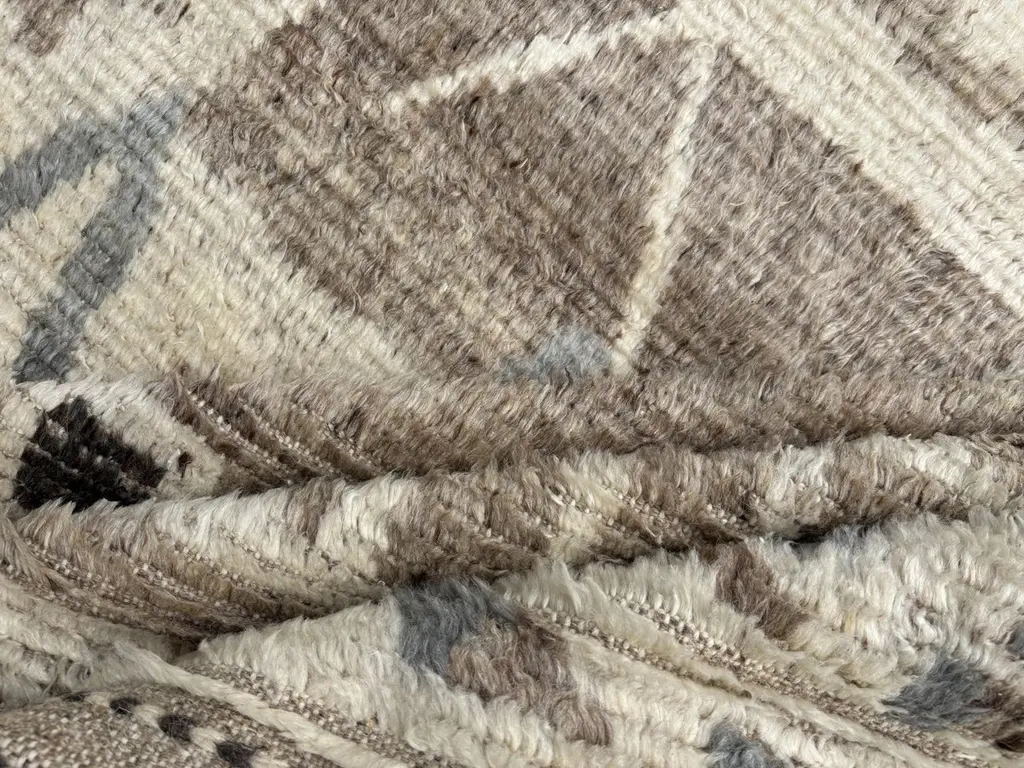 Elevate your living space with the exquisite charm of this new modern hand-knotted Moroccan berber beni ourain rug, crafted with precision and care from 100% wool. Combining the allure of Moroccan design with contemporary sensibilities, this rug is a striking addition to any home, offering both style and substance in equal measure.Each knot is meticulously handcrafted by skilled artisans, resulting in a texture that is both luxurious and resilient.Crafted entirely from wool, this Tulu rug offers warmth, softness, and durability, making it a practical and inviting choice for any room in your home. Whether placed in a living room, bedroom, or even a home office, this rug adds a touch of elegance and comfort to your space.As a new addition to your home, this modern Moroccan azilal style rug brings a fresh perspective to traditional craftsmanship. Its clean lines, contemporary design, and high-quality materials make it a versatile and timeless piece that will complement a wide range of interior styles.Elevate your decor with the modern sophistication of this hand-knotted Moroccan Tulu rug, where craftsmanship meets contemporary design to create a truly exceptional statement piece for your home.Size: 10 x 14 Ft (305 x 427 cm)Weaves: Hand-KnottedMaterials: 100% Natural WoolPile Height: MediumRoom: Any Room, Guestroom, Nursery, Kid's Room, Lounge, Living Room, Kitchen, Entryway, Salon, Trailer, Home Office / Study, Garage, Foyer, Dining Room, Conservatory, Bedroom, Basement, Utility/Laundry RoomAge: NewShape: RectangleType: Area Rug CUSTOM OPTIONS AVAILABLE Ref No: H039 Please inquire about wholesale pricing