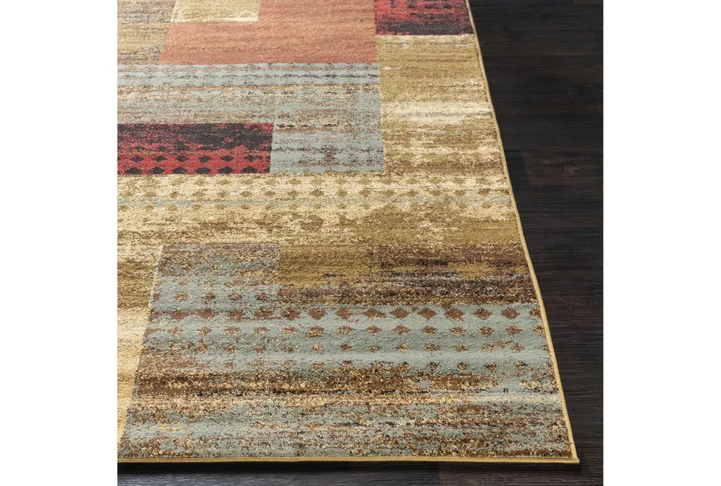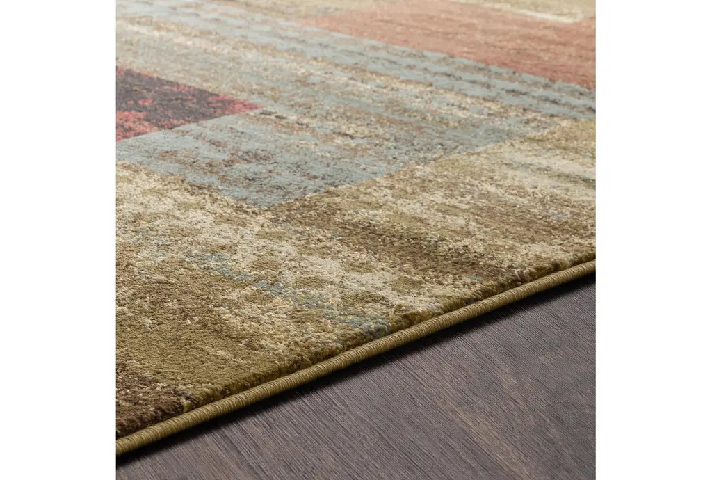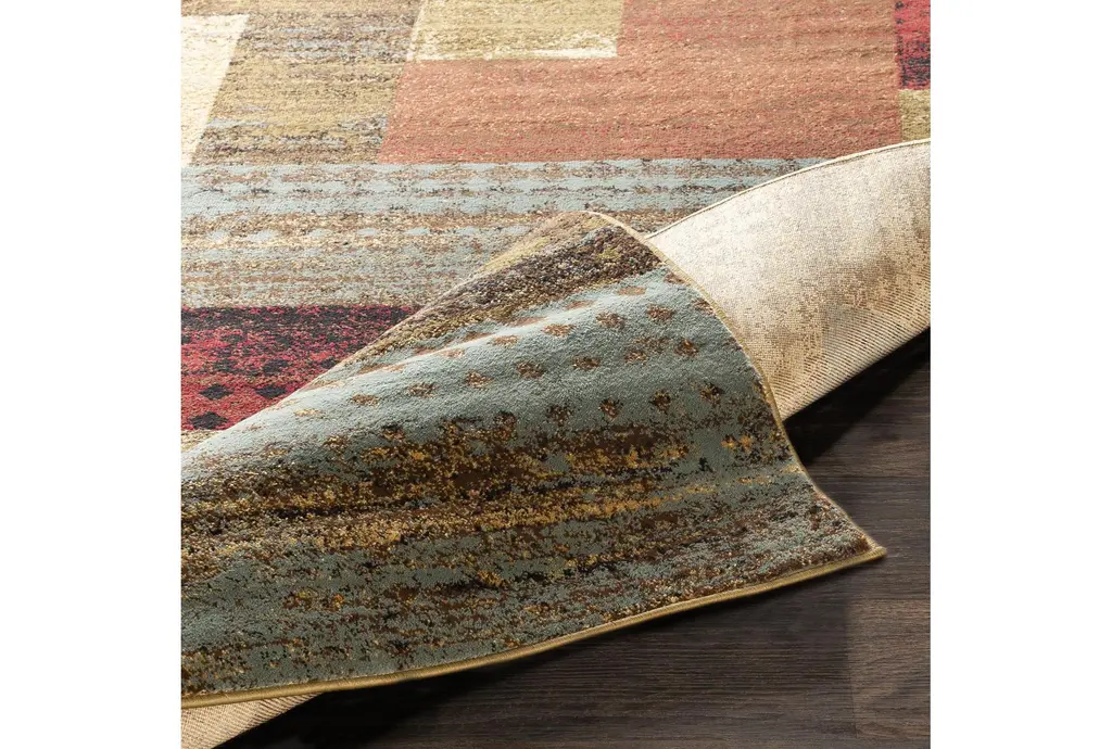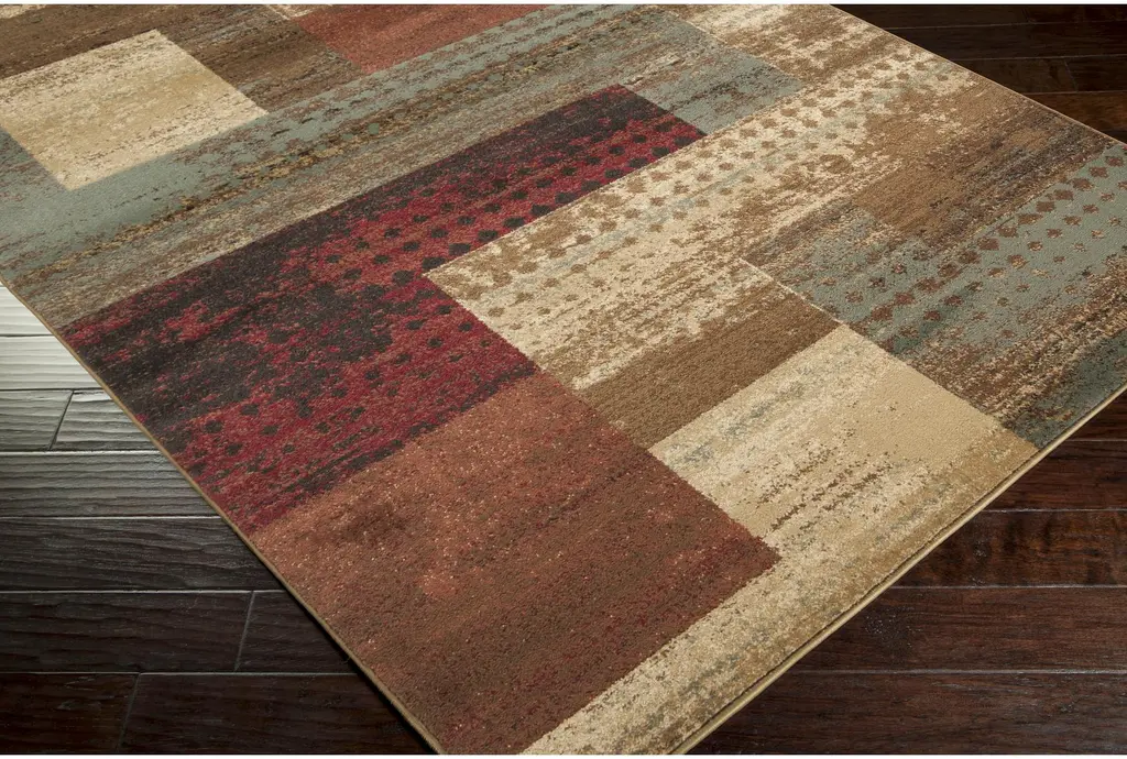 Enhance your living space with the 12'X14'9" Rectangle Fiber Rug, a modern masterpiece from Surya. This rug features a striking geometric block pattern in dark red, dark brown, camel, pear, charcoal, black, and tan, making it a vibrant addition to any indoor setting. Its low pile design ensures easy maintenance and a comfortable feel underfoot.